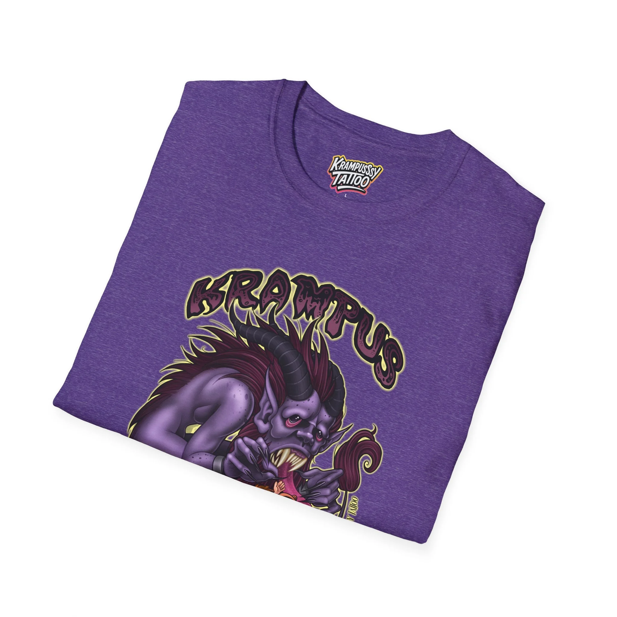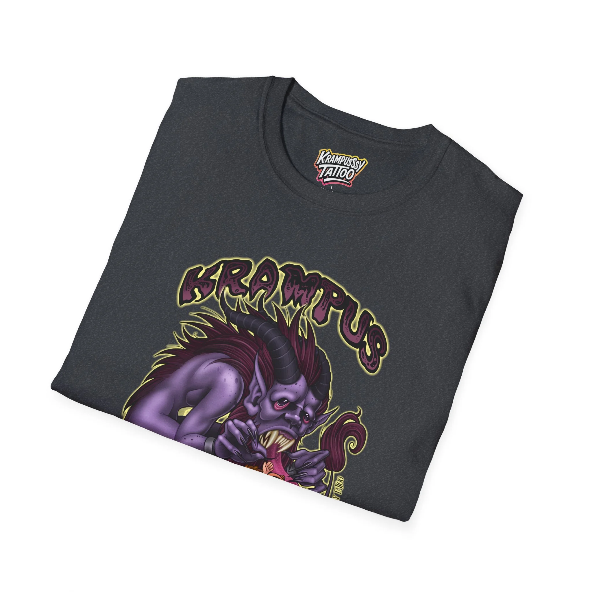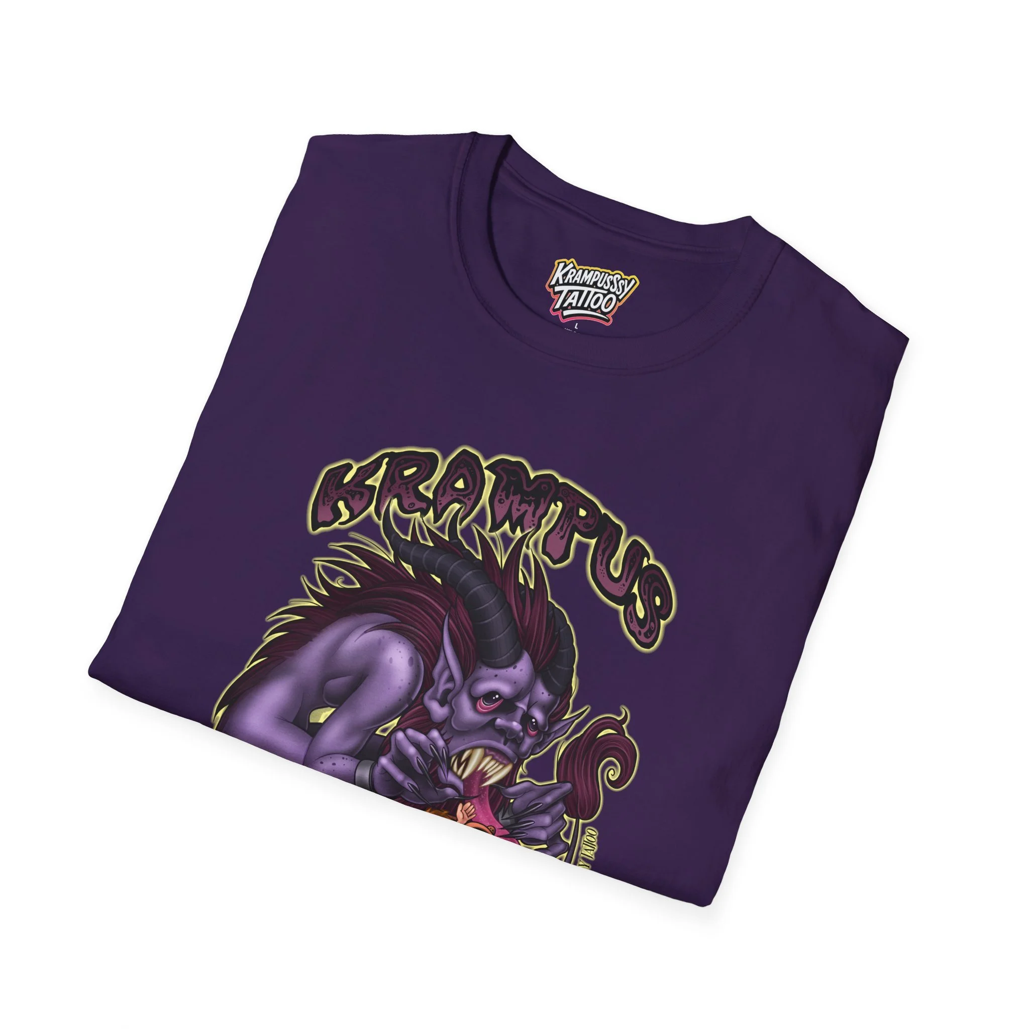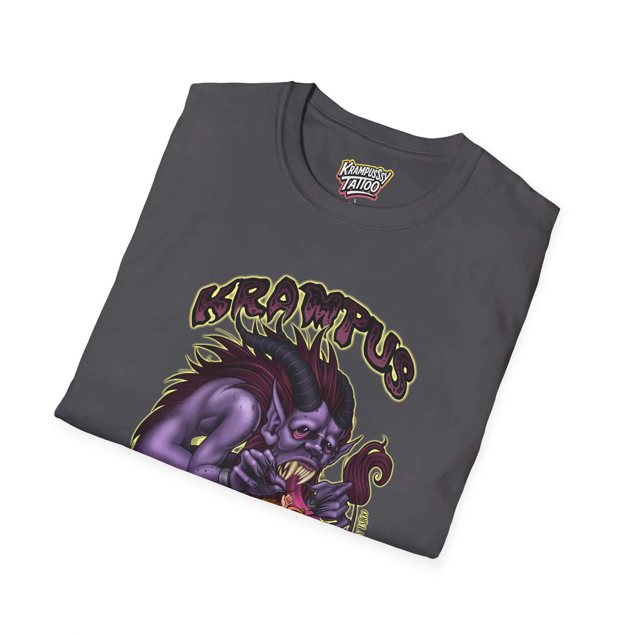 A unisex softstyle T-shirt featuring an illustration of Krampus, perfect for those who enjoy dark and alternative designs. Ideal for adults looking for a statement piece to wear during Halloween or Christmas celebrations.