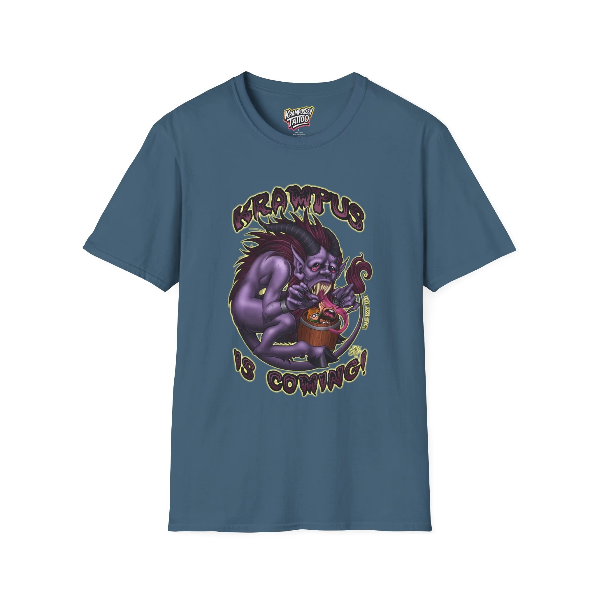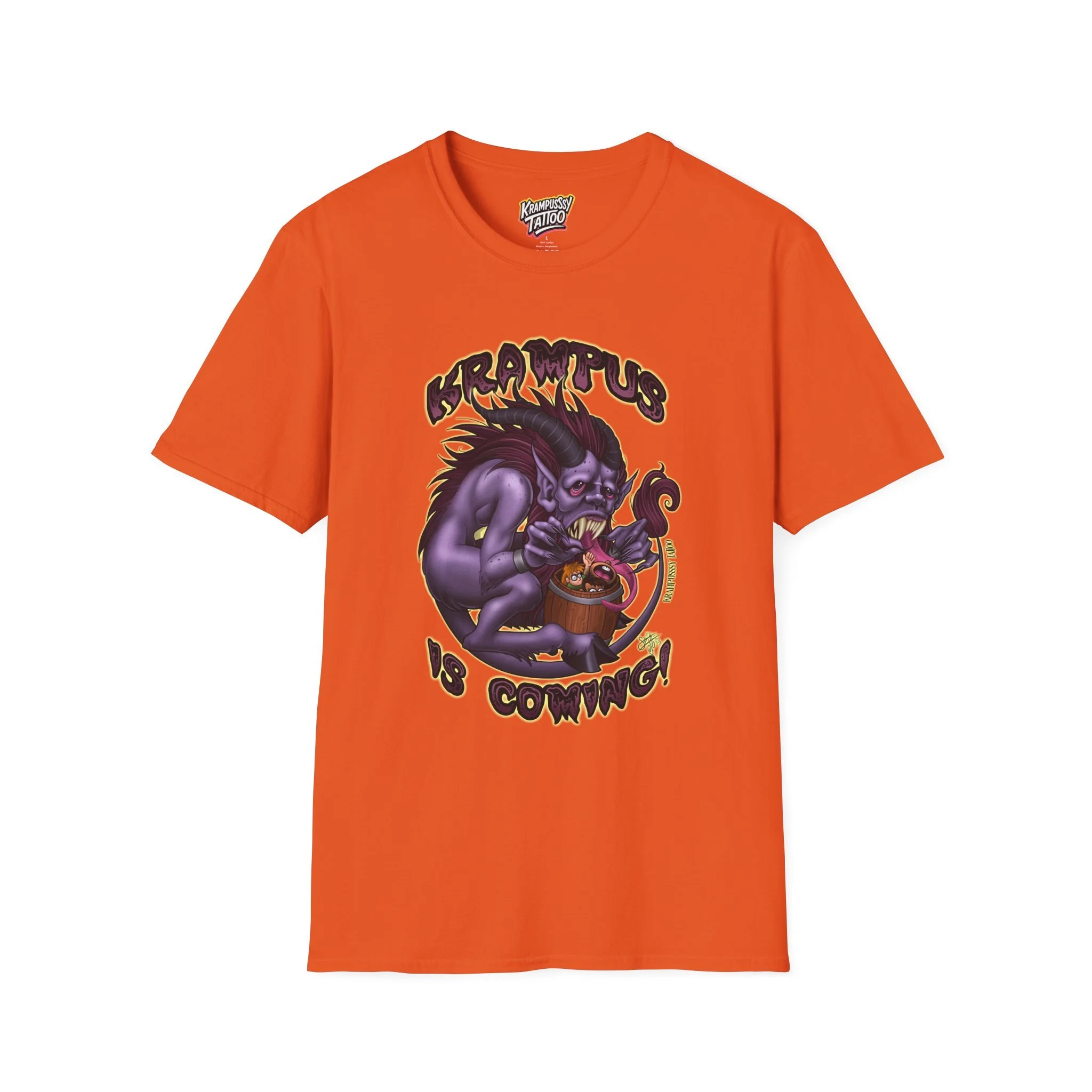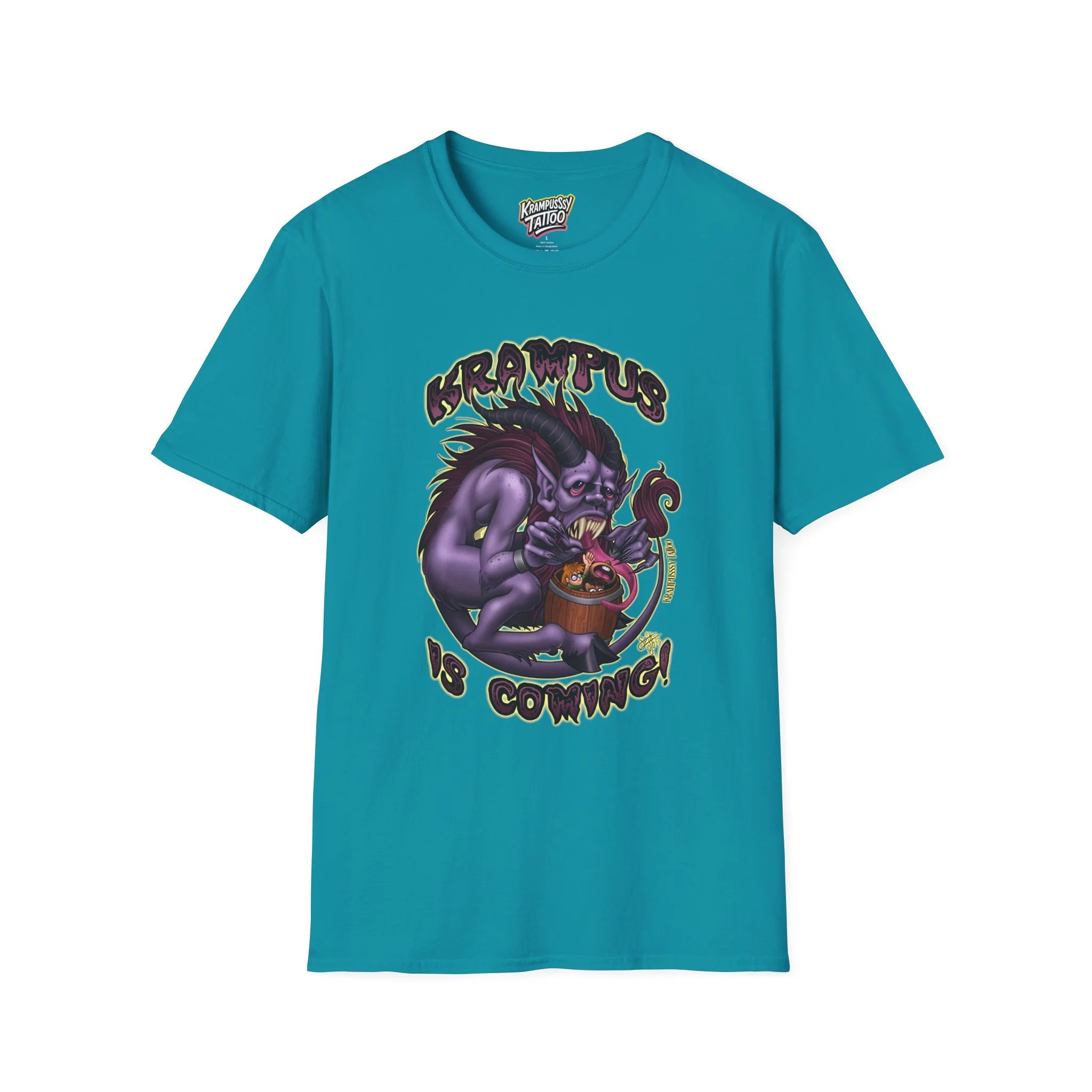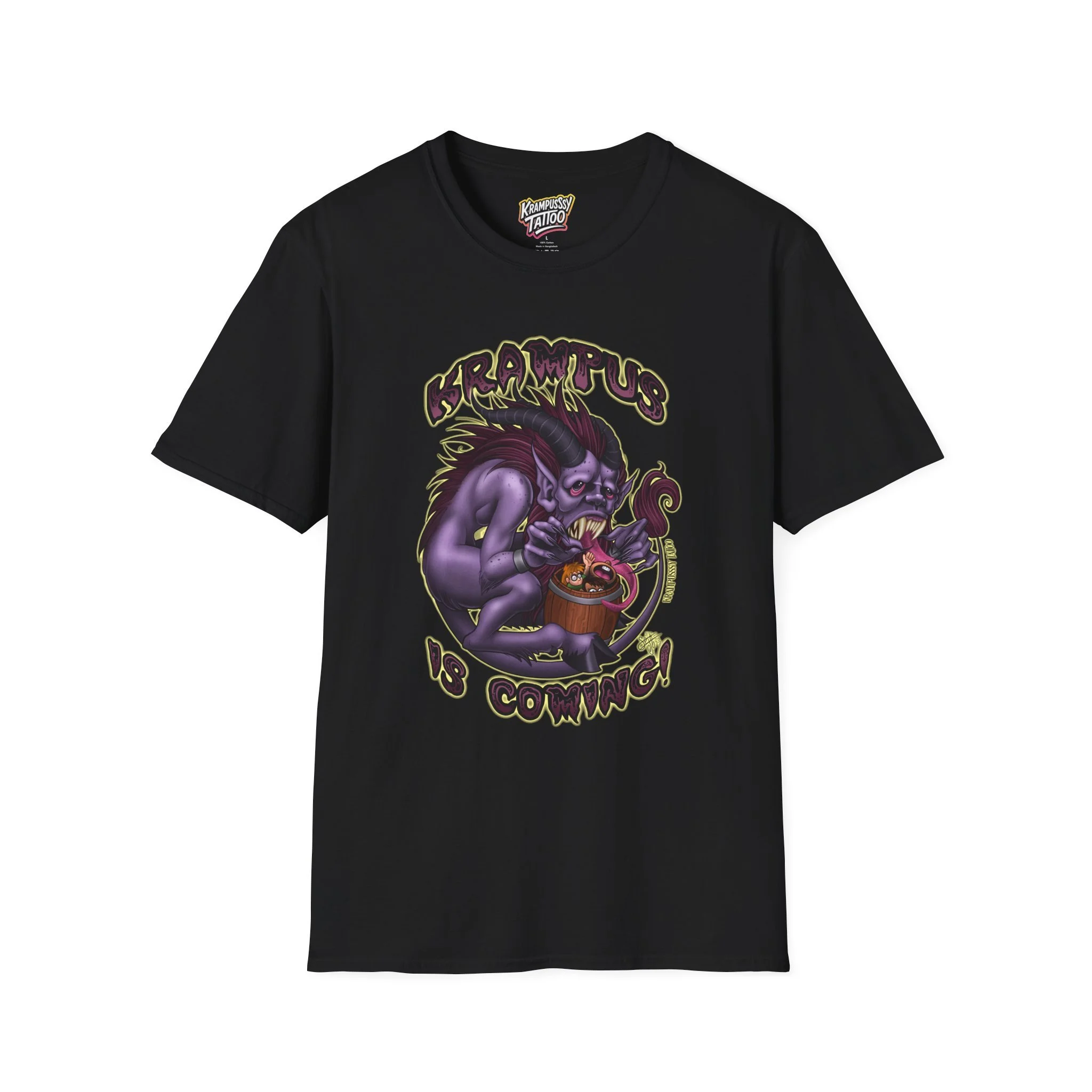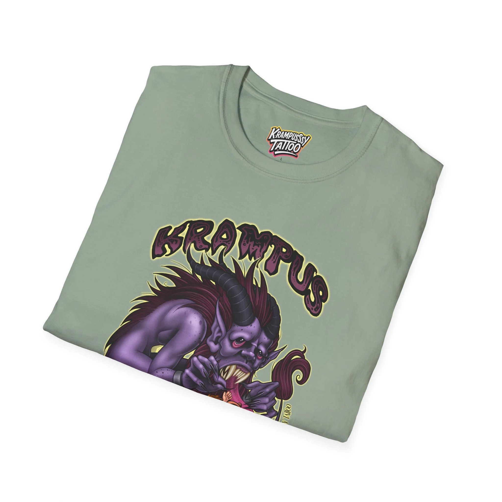 A unisex softstyle T-shirt featuring an illustration of Krampus, perfect for those who enjoy dark and alternative designs. Ideal for adults looking for a statement piece to wear during Halloween or Christmas celebrations.