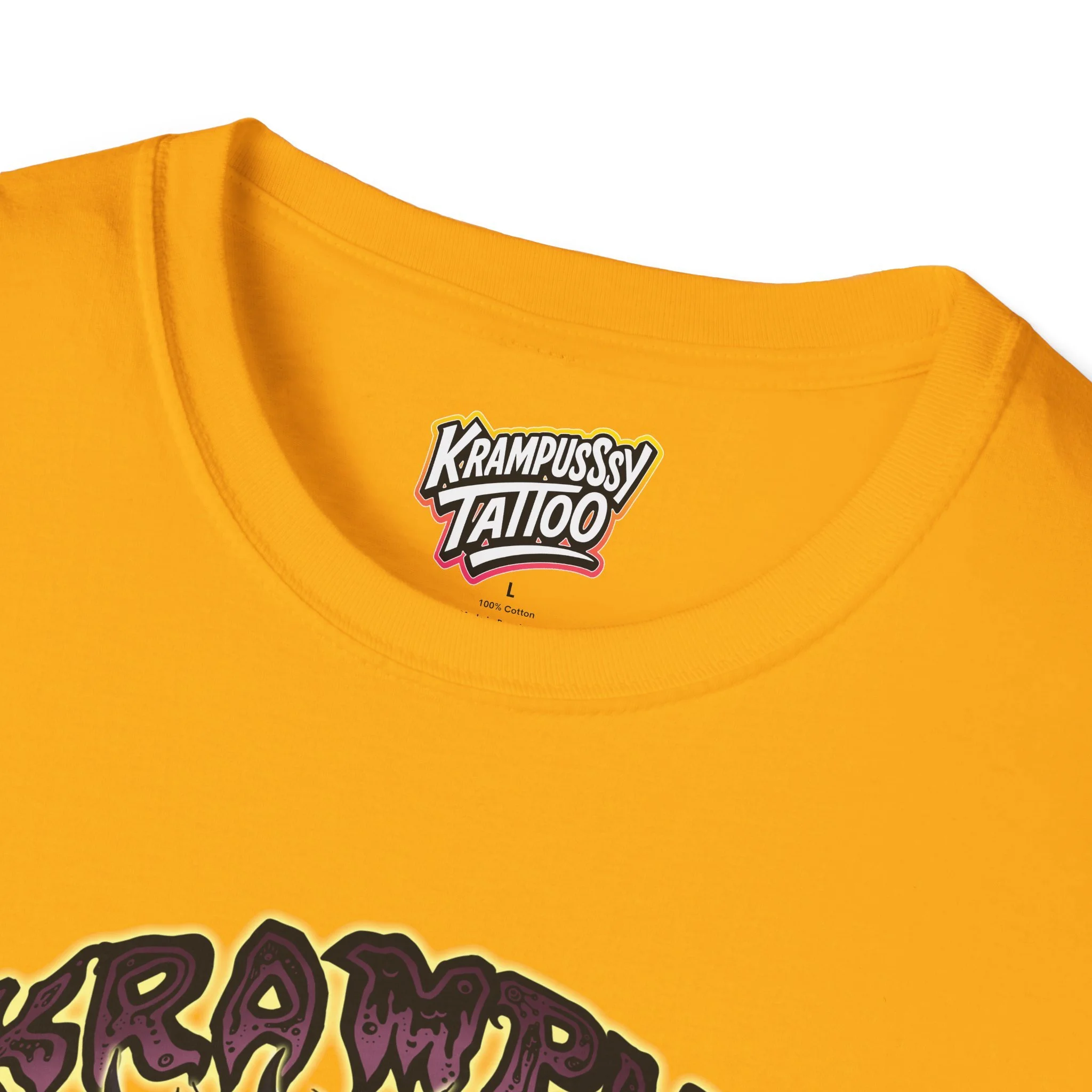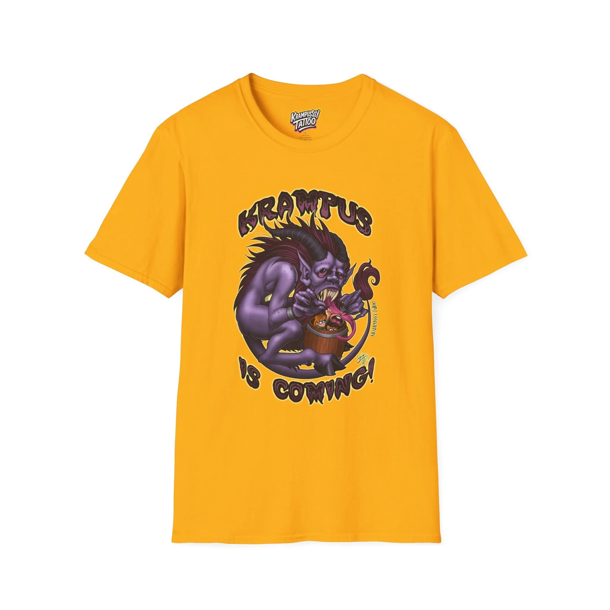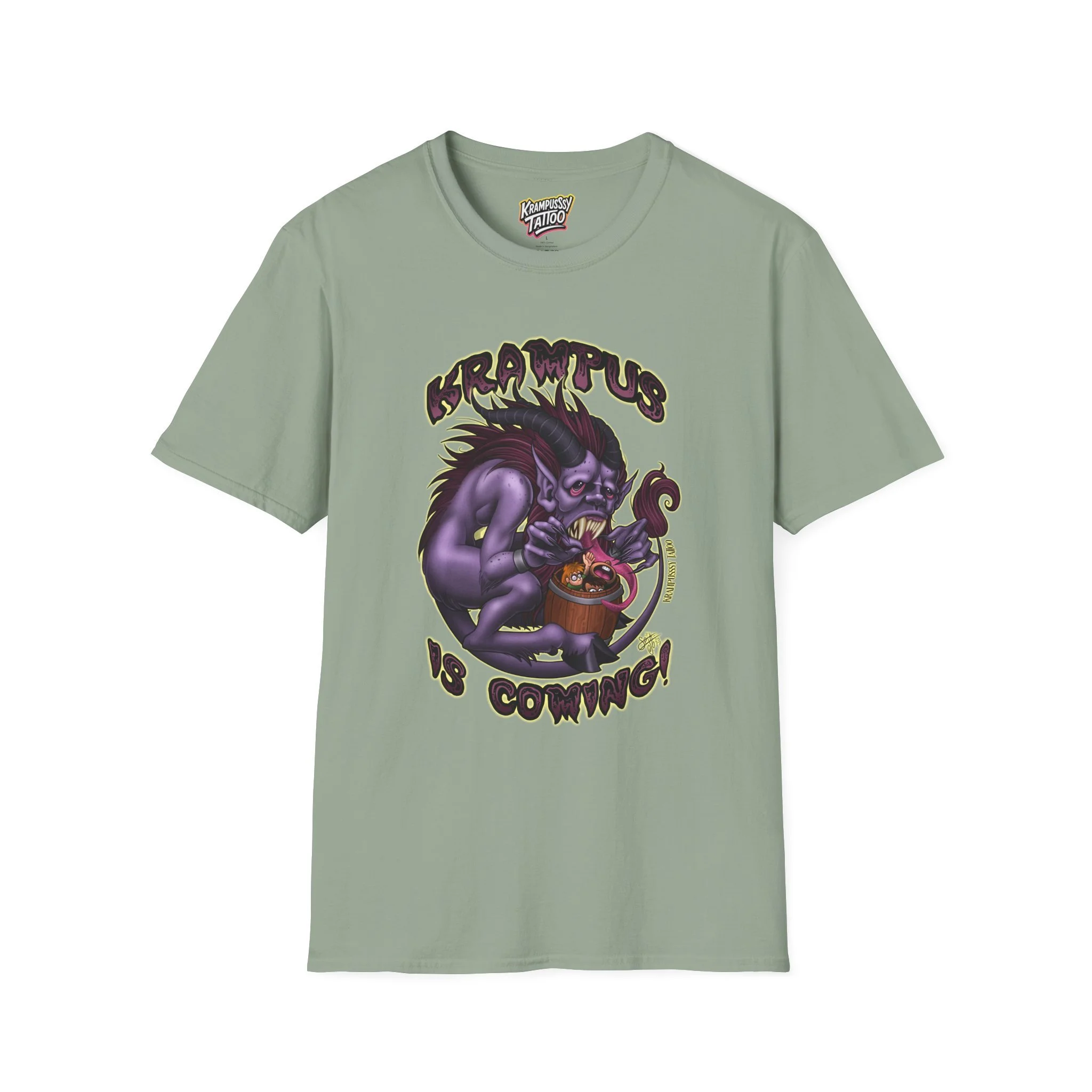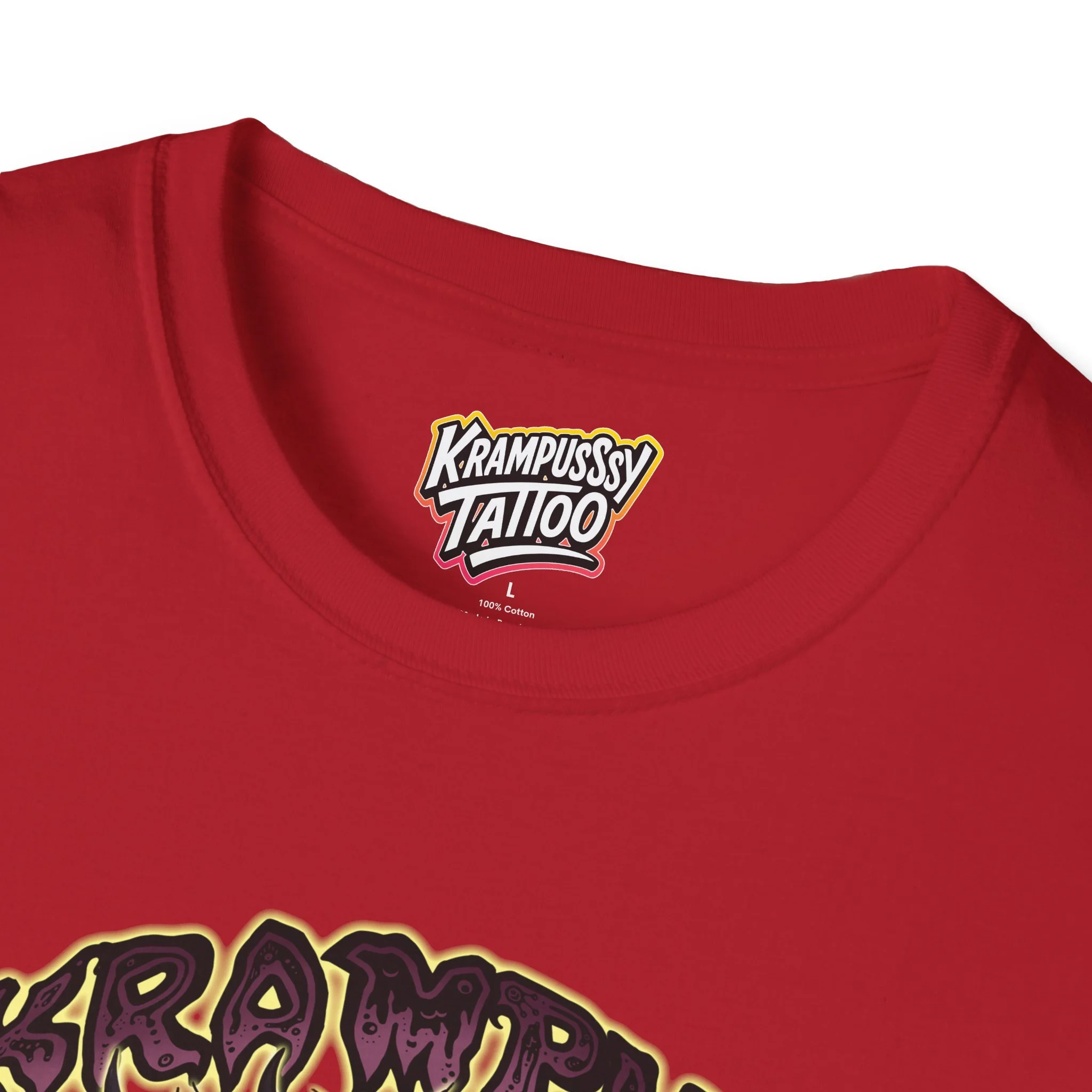 A unisex softstyle T-shirt featuring an illustration of Krampus, perfect for those who enjoy dark and alternative designs. Ideal for adults looking for a statement piece to wear during Halloween or Christmas celebrations.