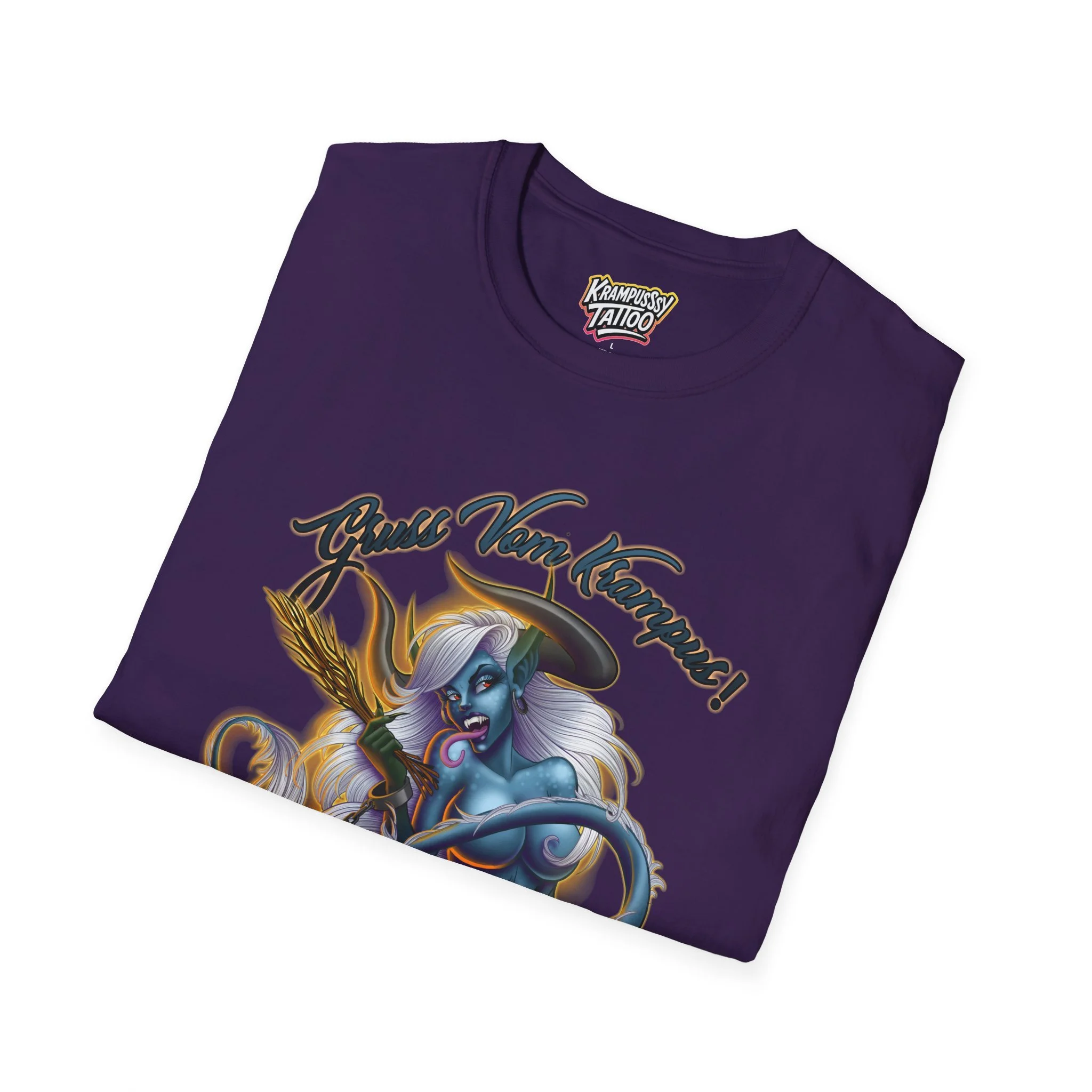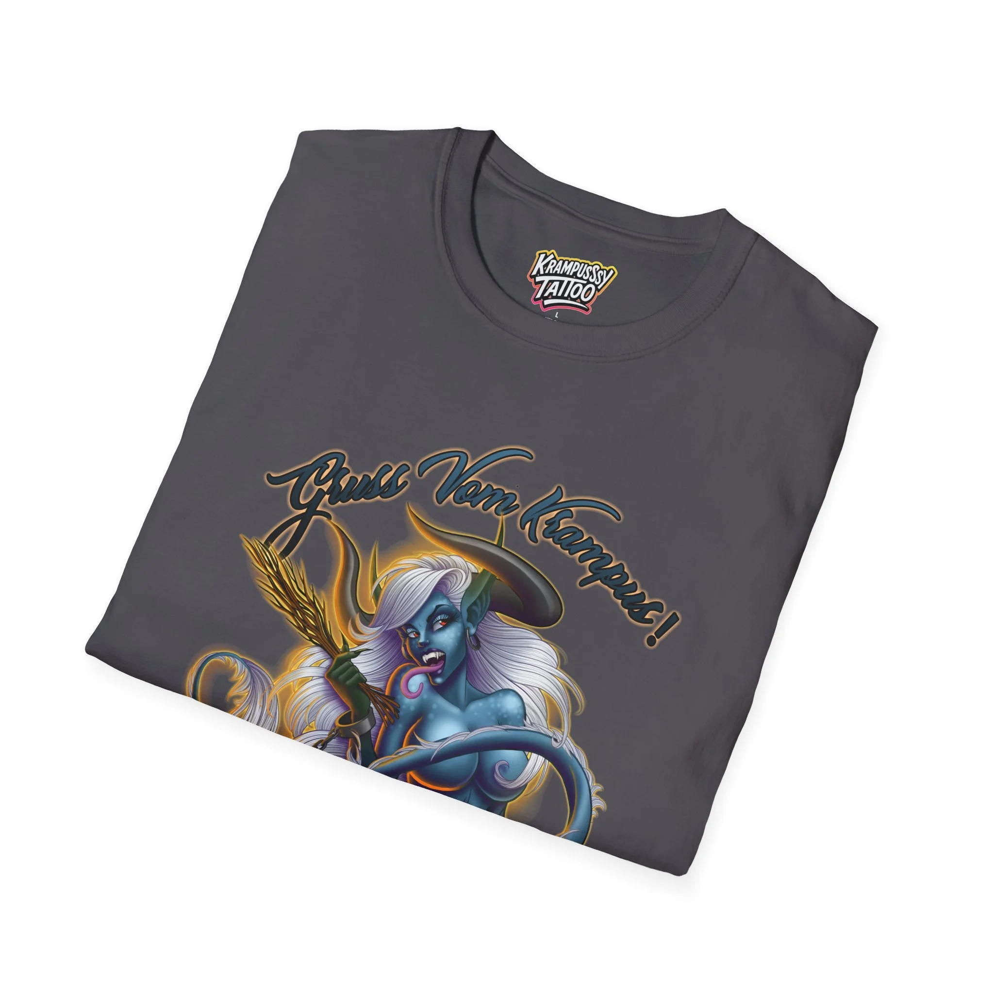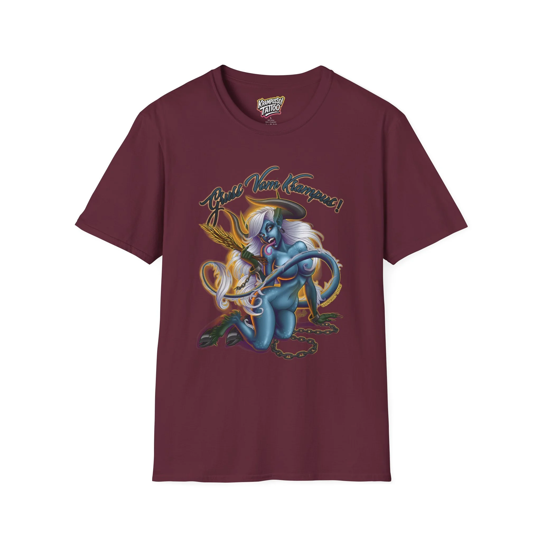 A unisex softstyle T-shirt featuring an illustration of Krampus, perfect for those who enjoy dark and alternative designs. Ideal for adults looking for a statement piece to wear during Halloween or Christmas celebrations.