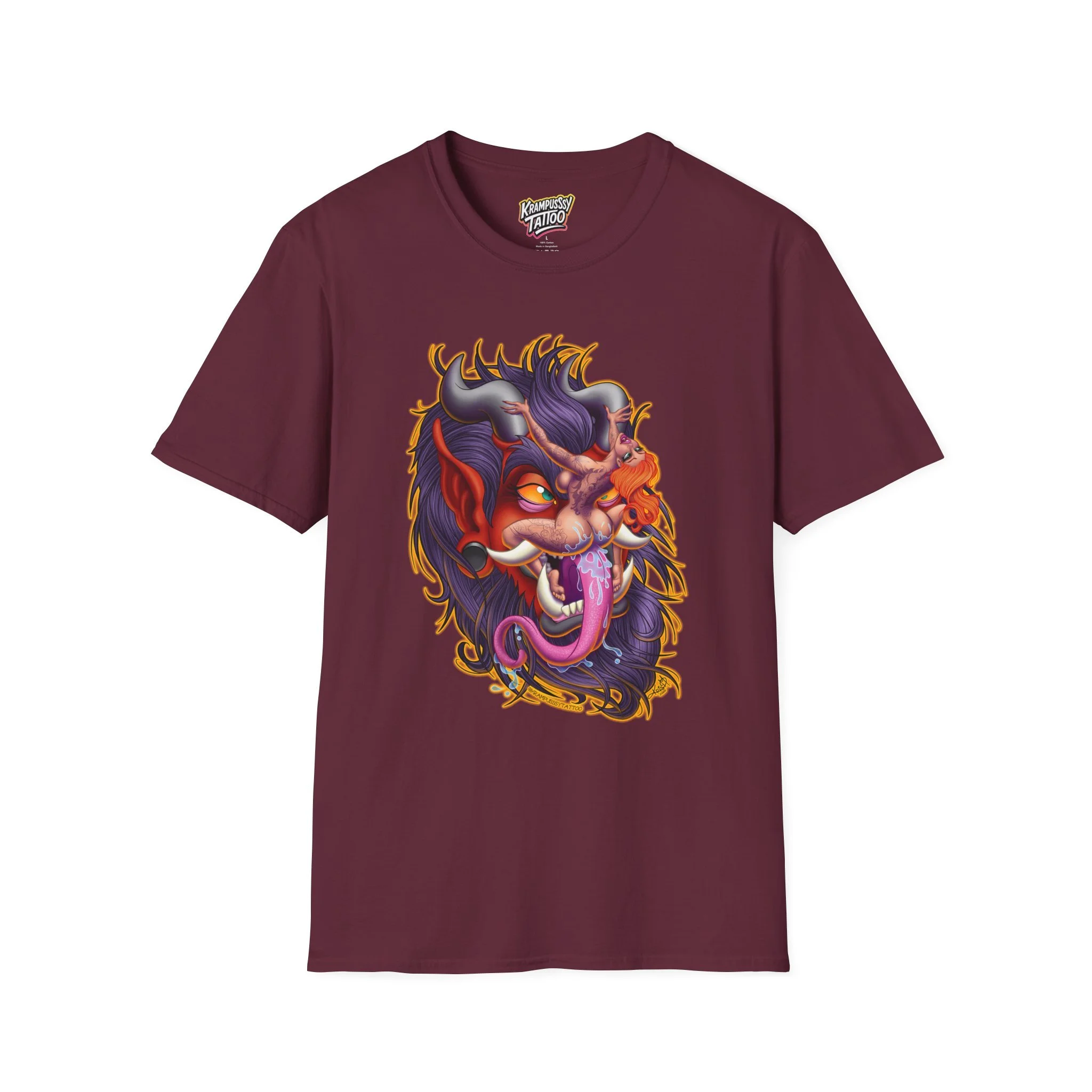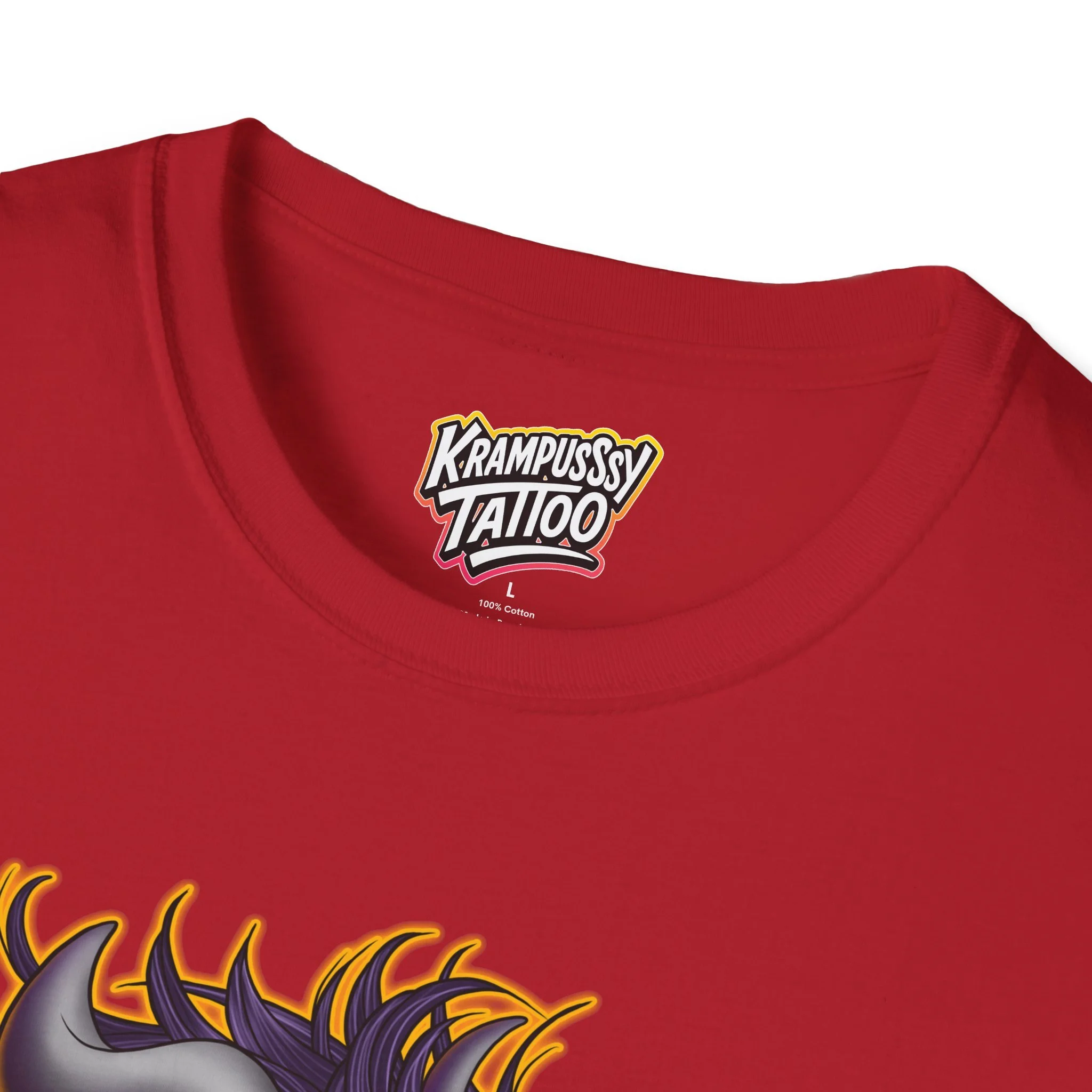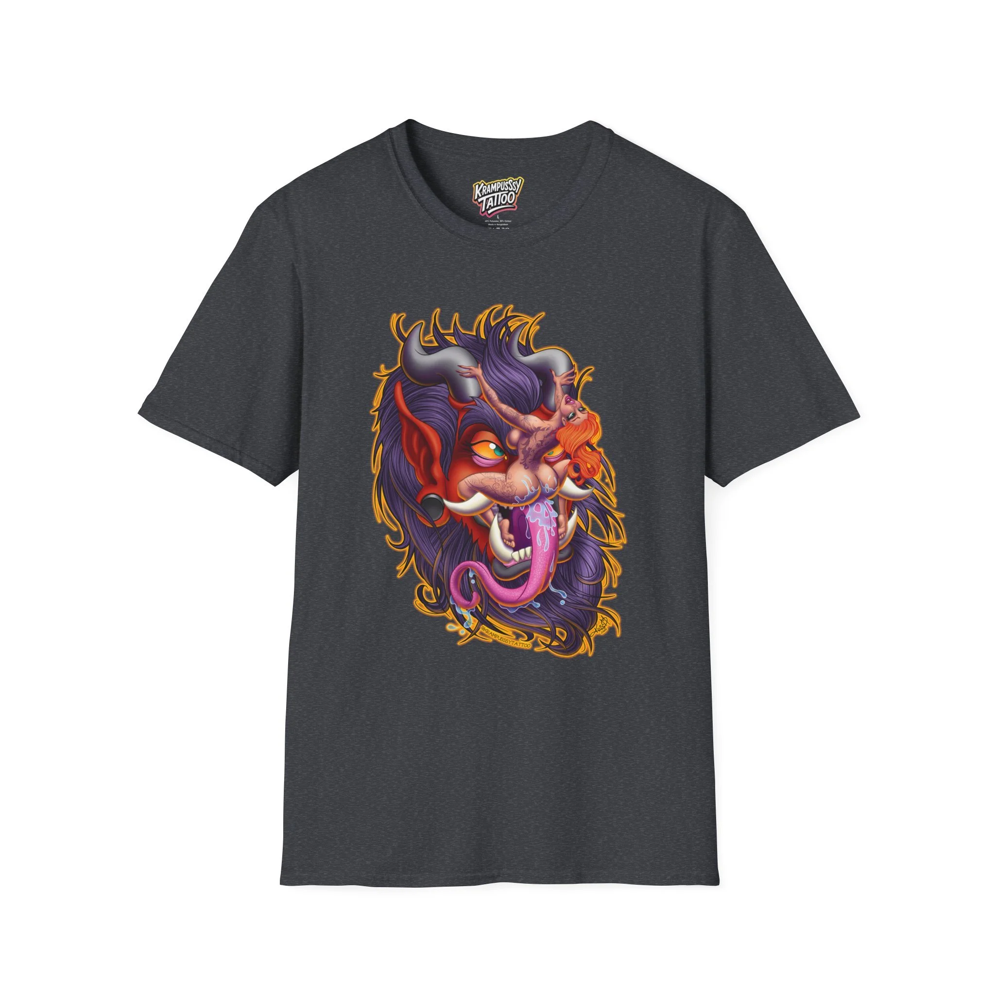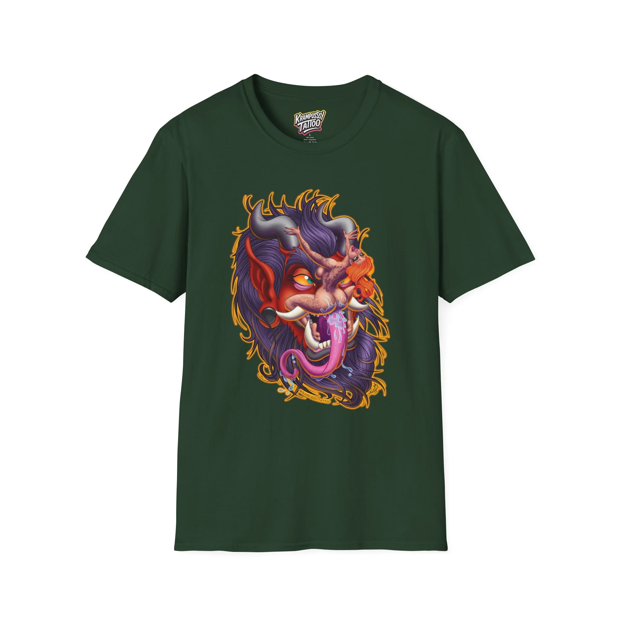 A unisex softstyle T-shirt featuring an illustration of Krampus, perfect for those who enjoy dark and alternative designs. Ideal for adults looking for a statement piece to wear during Halloween or Christmas celebrations.