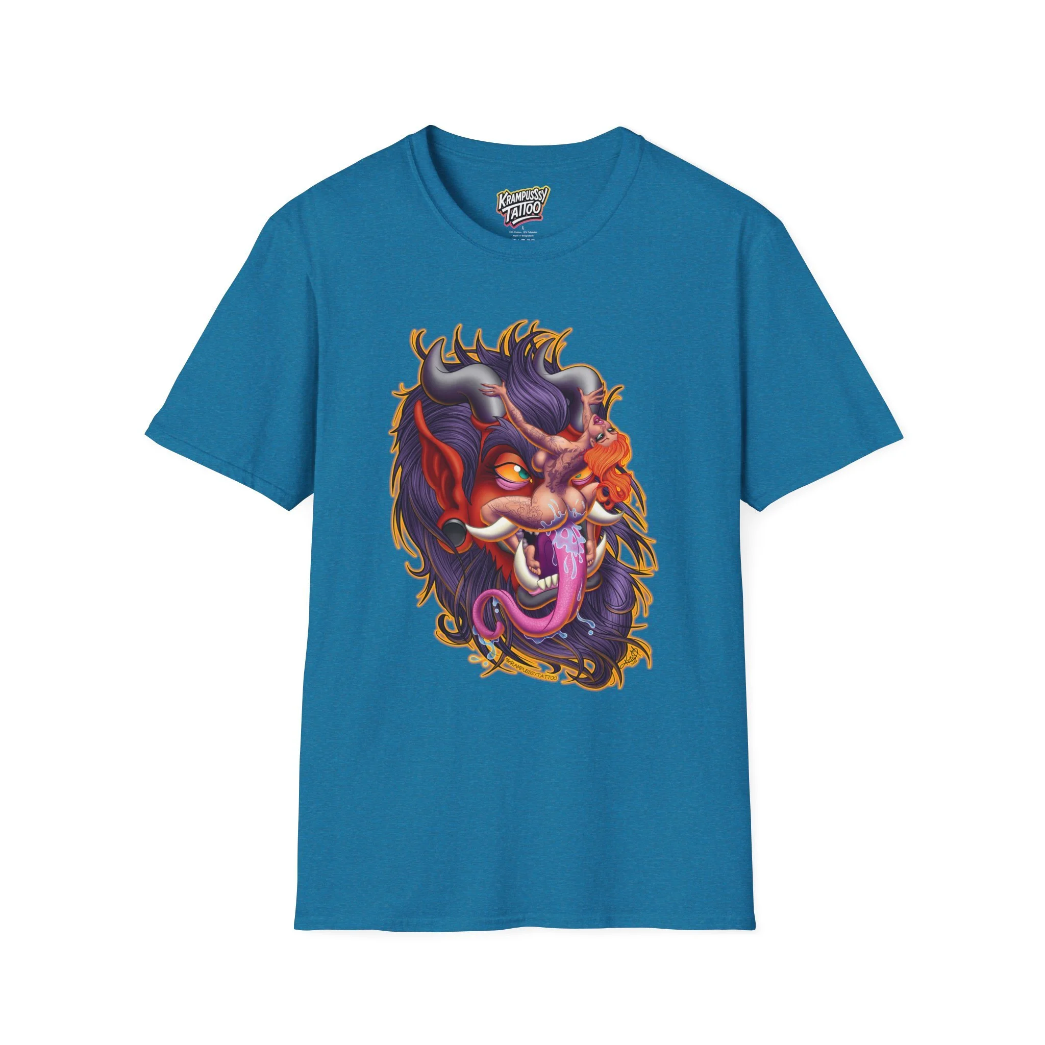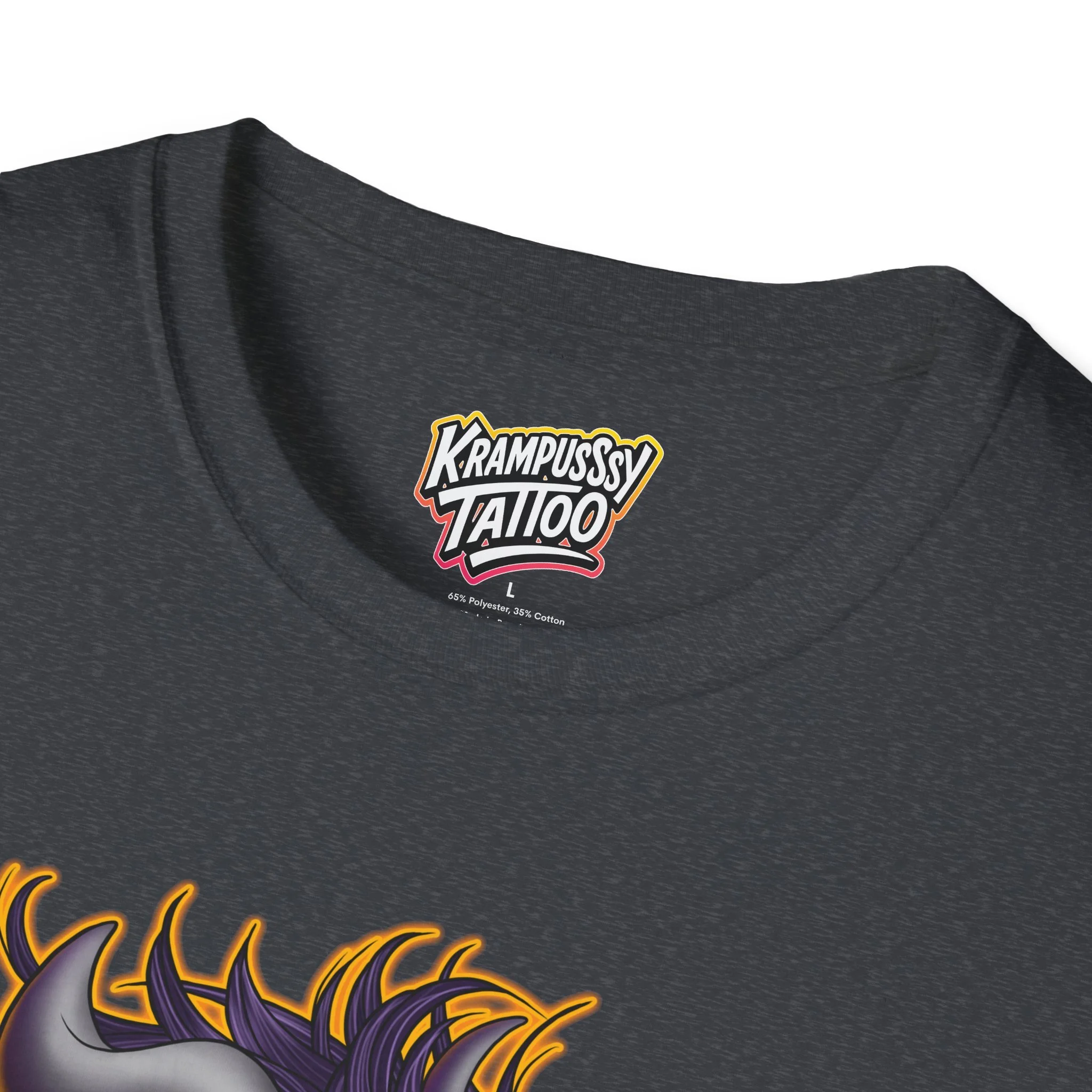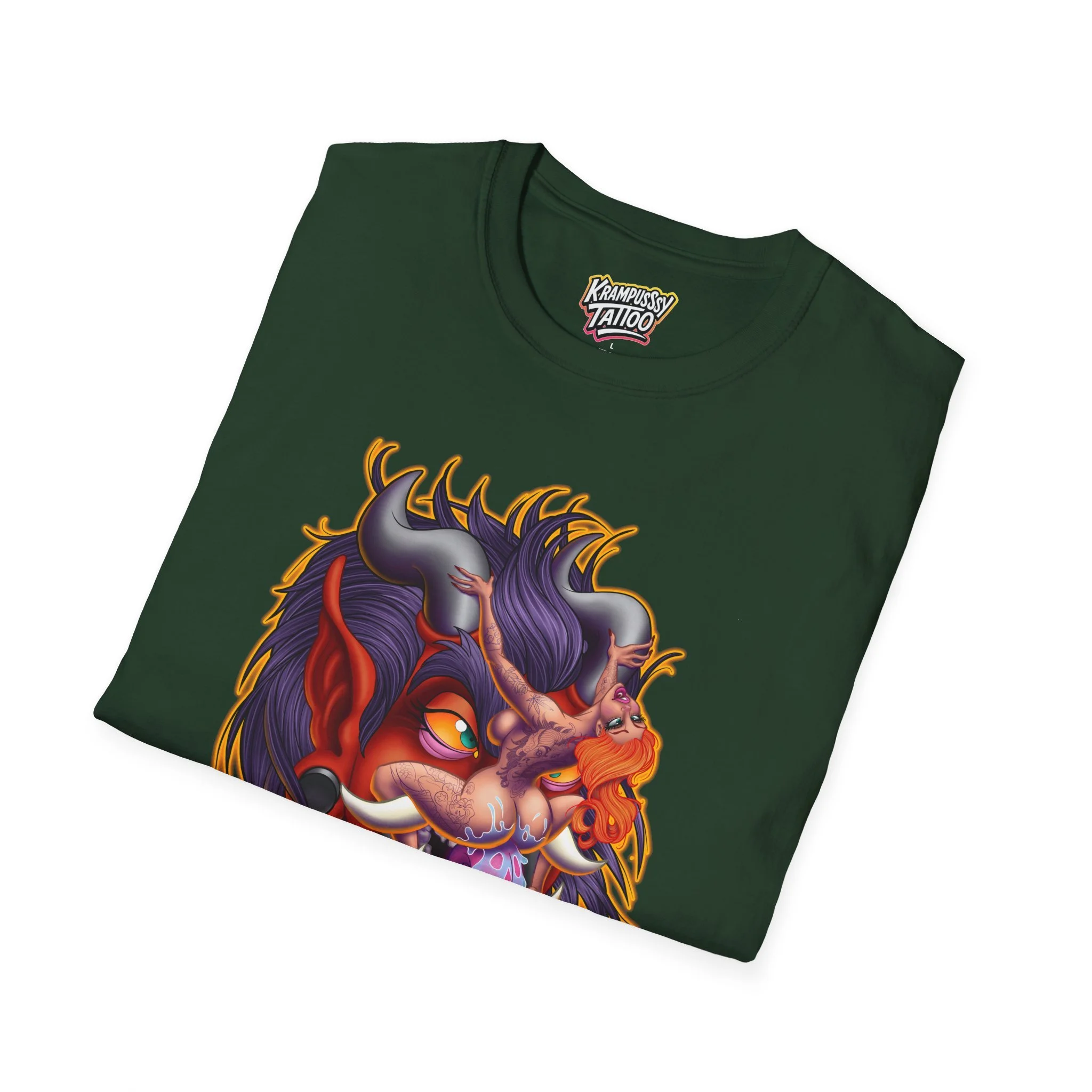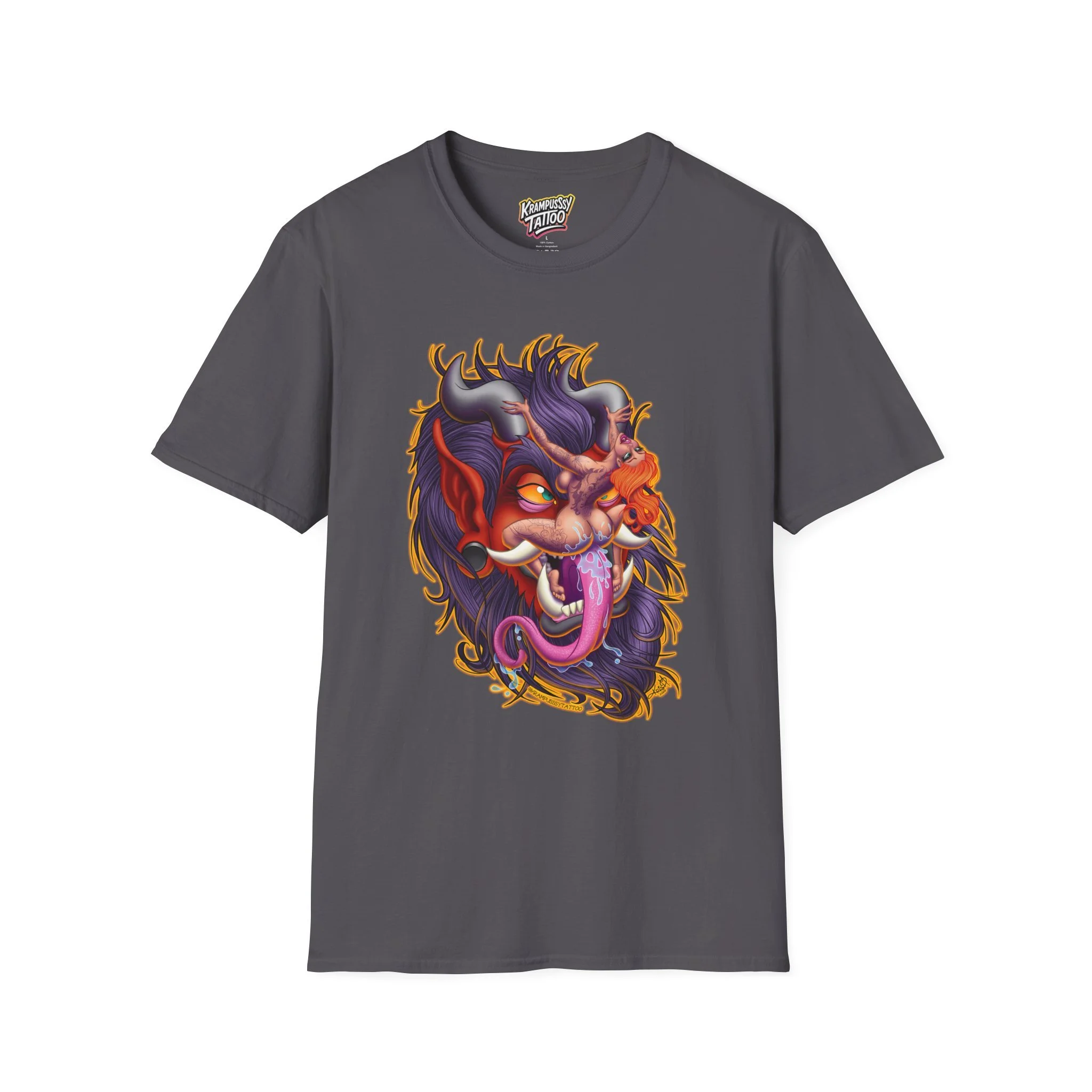 A unisex softstyle T-shirt featuring an illustration of Krampus, perfect for those who enjoy dark and alternative designs. Ideal for adults looking for a statement piece to wear during Halloween or Christmas celebrations.