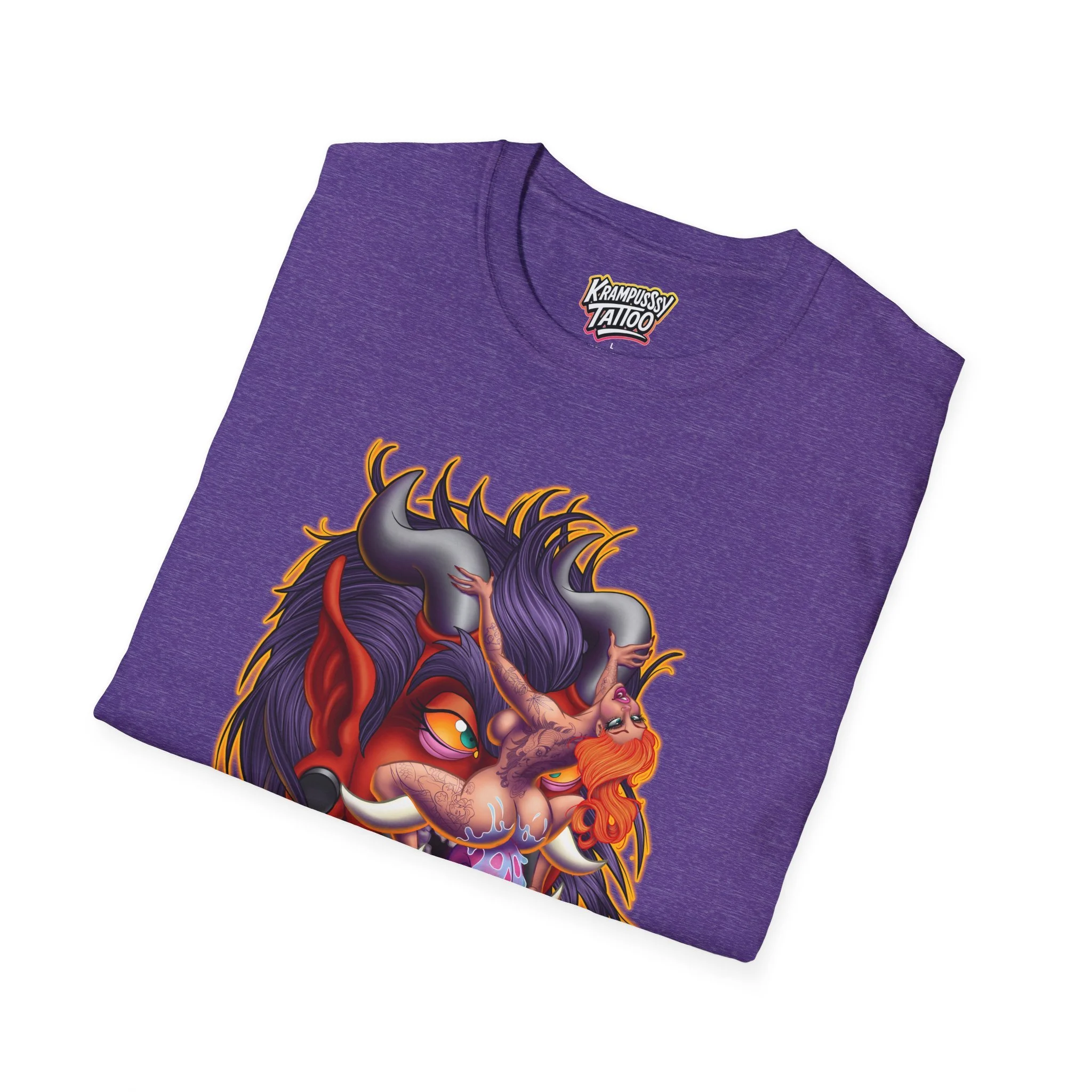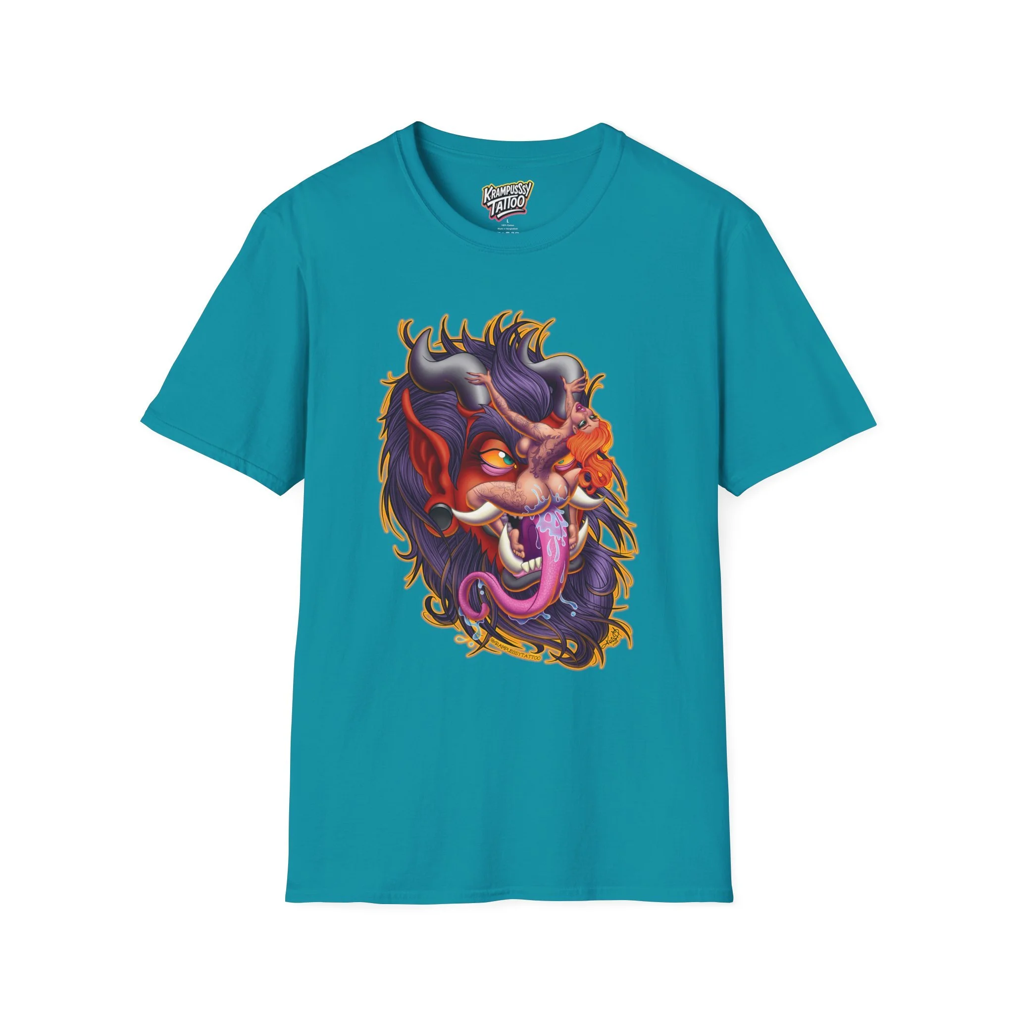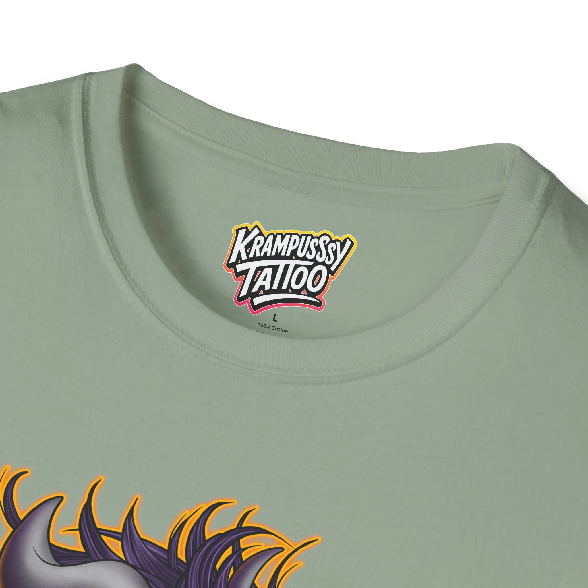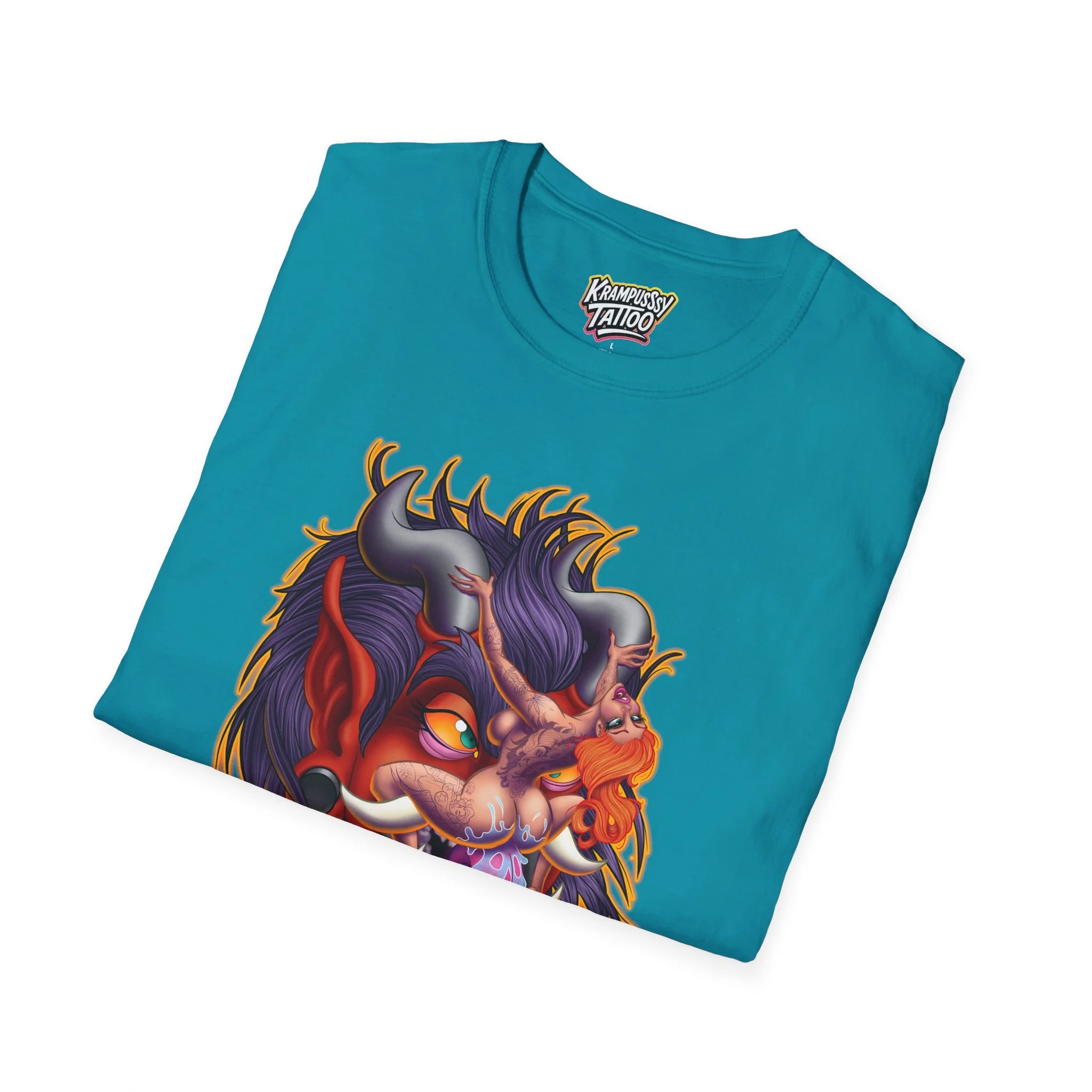 A unisex softstyle T-shirt featuring an illustration of Krampus, perfect for those who enjoy dark and alternative designs. Ideal for adults looking for a statement piece to wear during Halloween or Christmas celebrations.