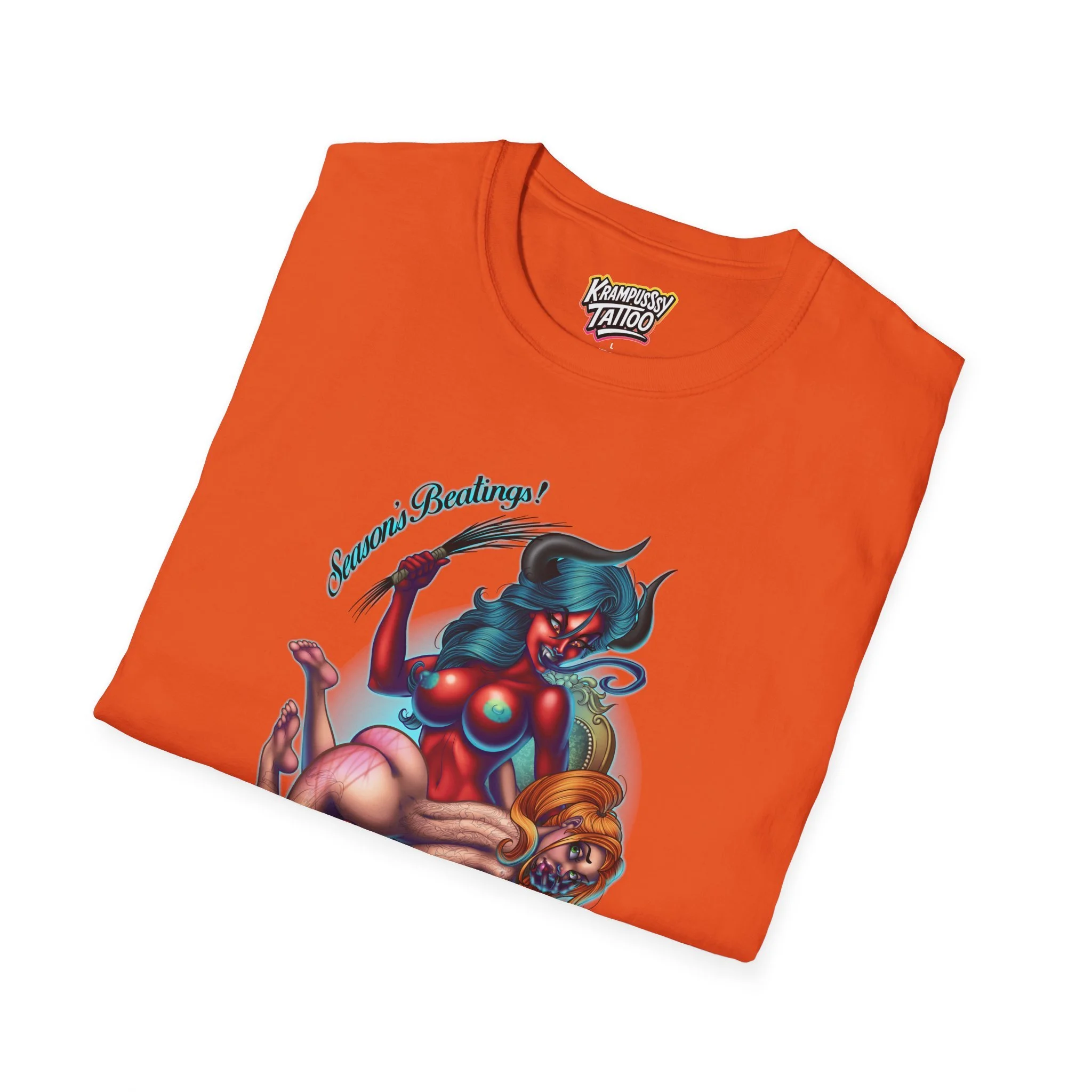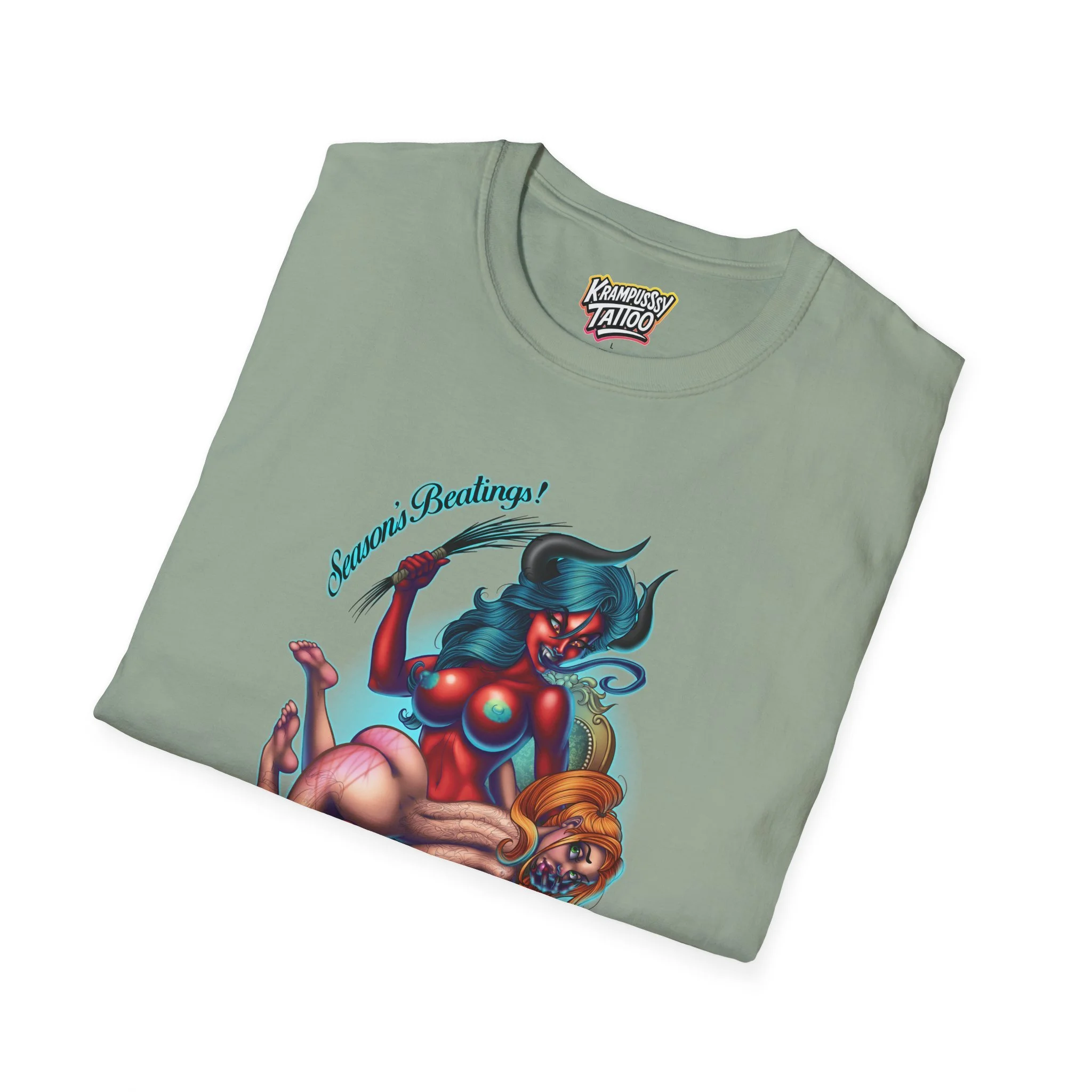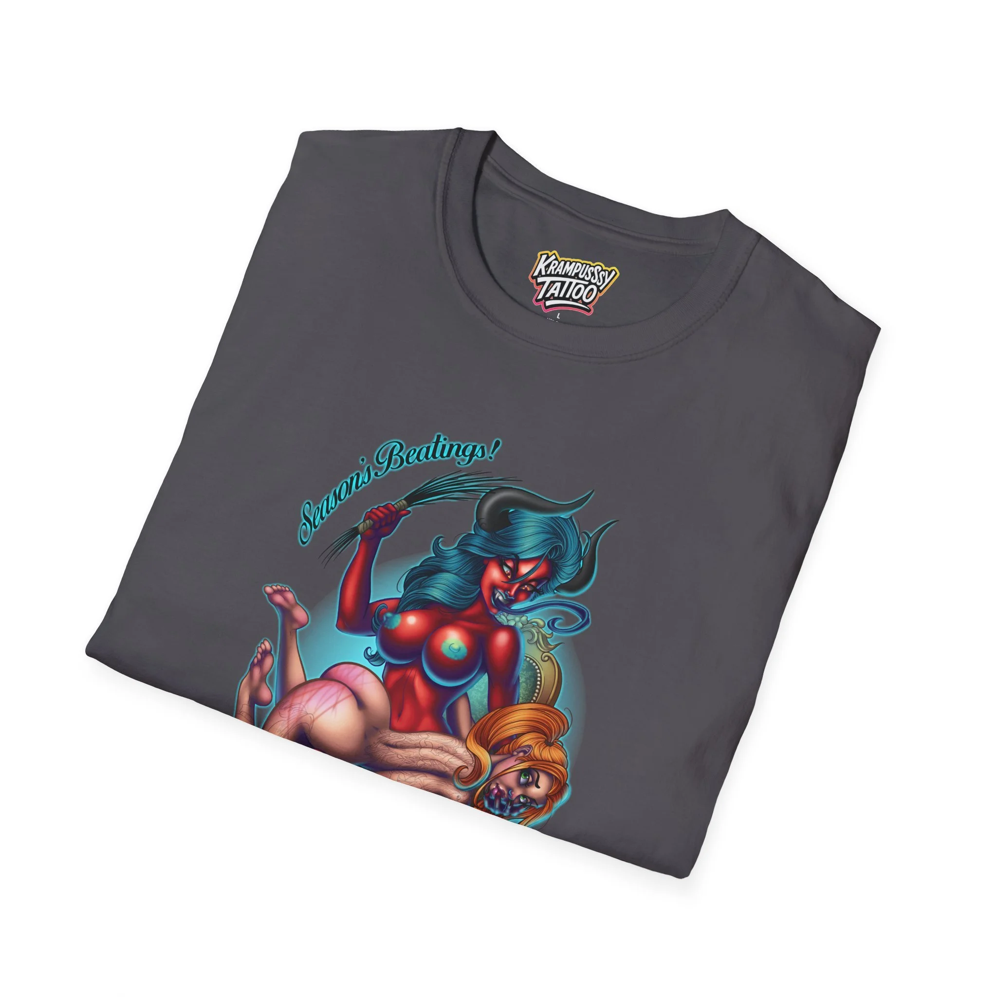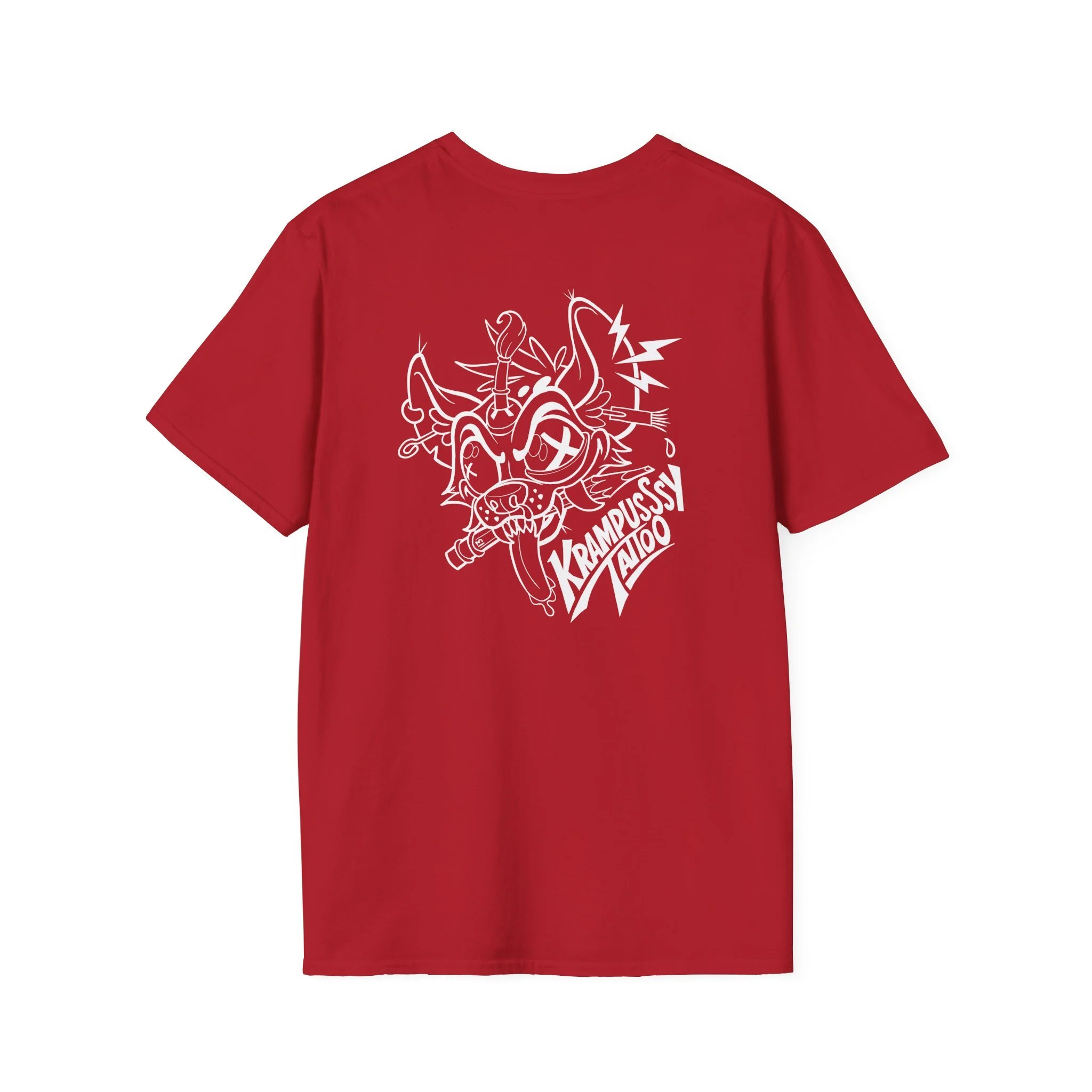 A unisex softstyle T-shirt featuring an illustration of Krampus, perfect for those who enjoy dark and alternative designs. Ideal for adults looking for a statement piece to wear during Halloween or Christmas celebrations.