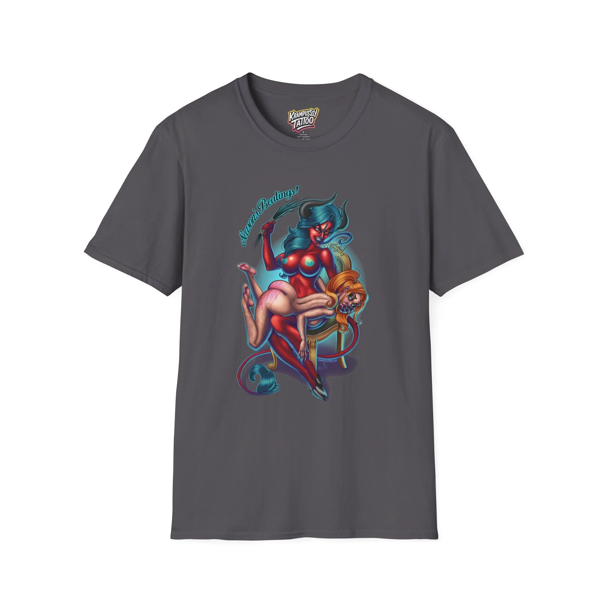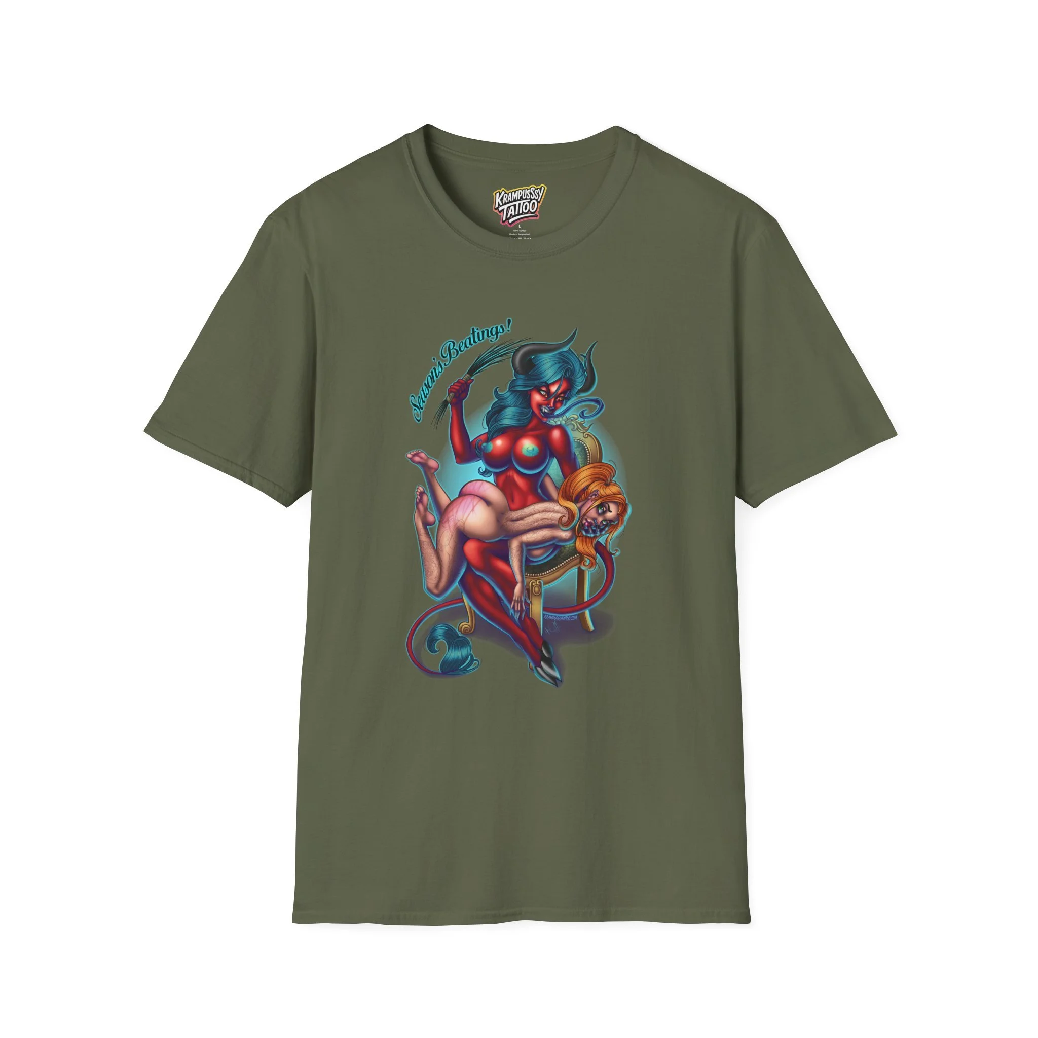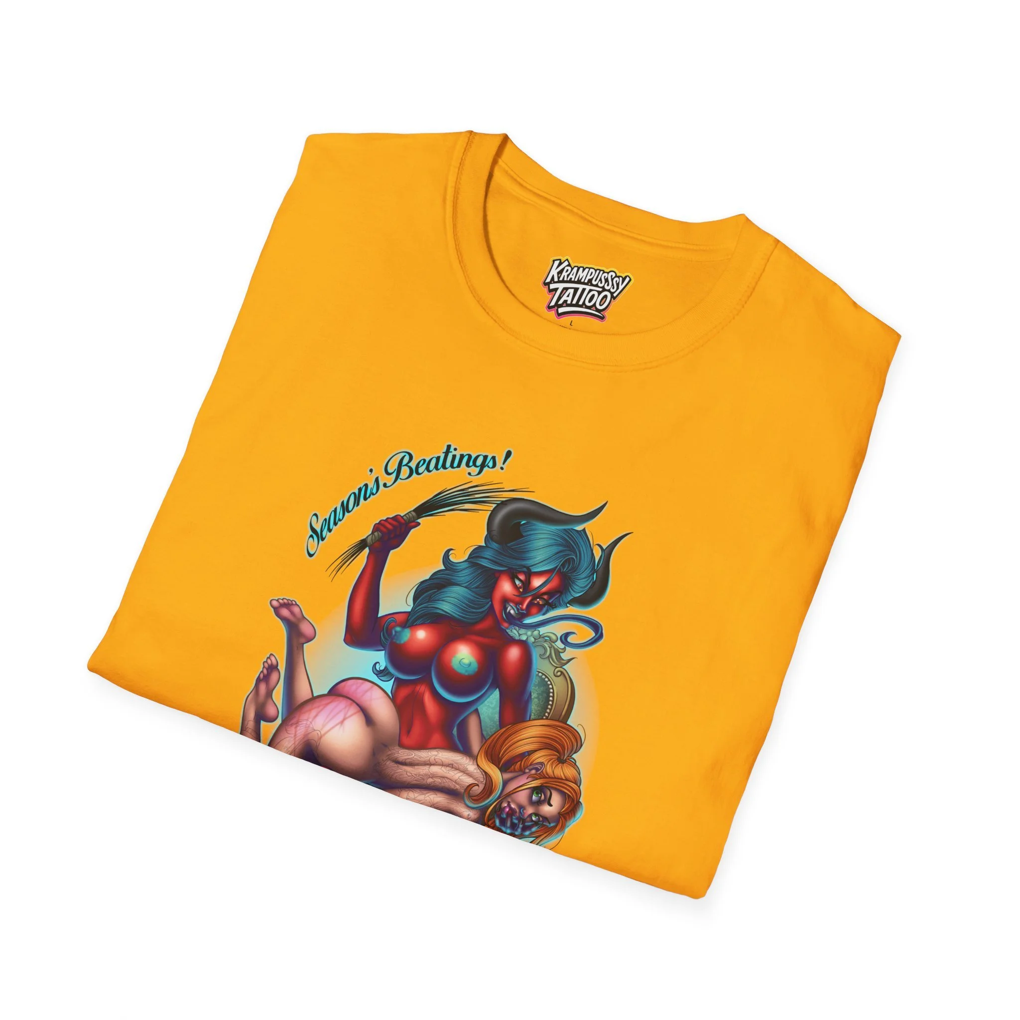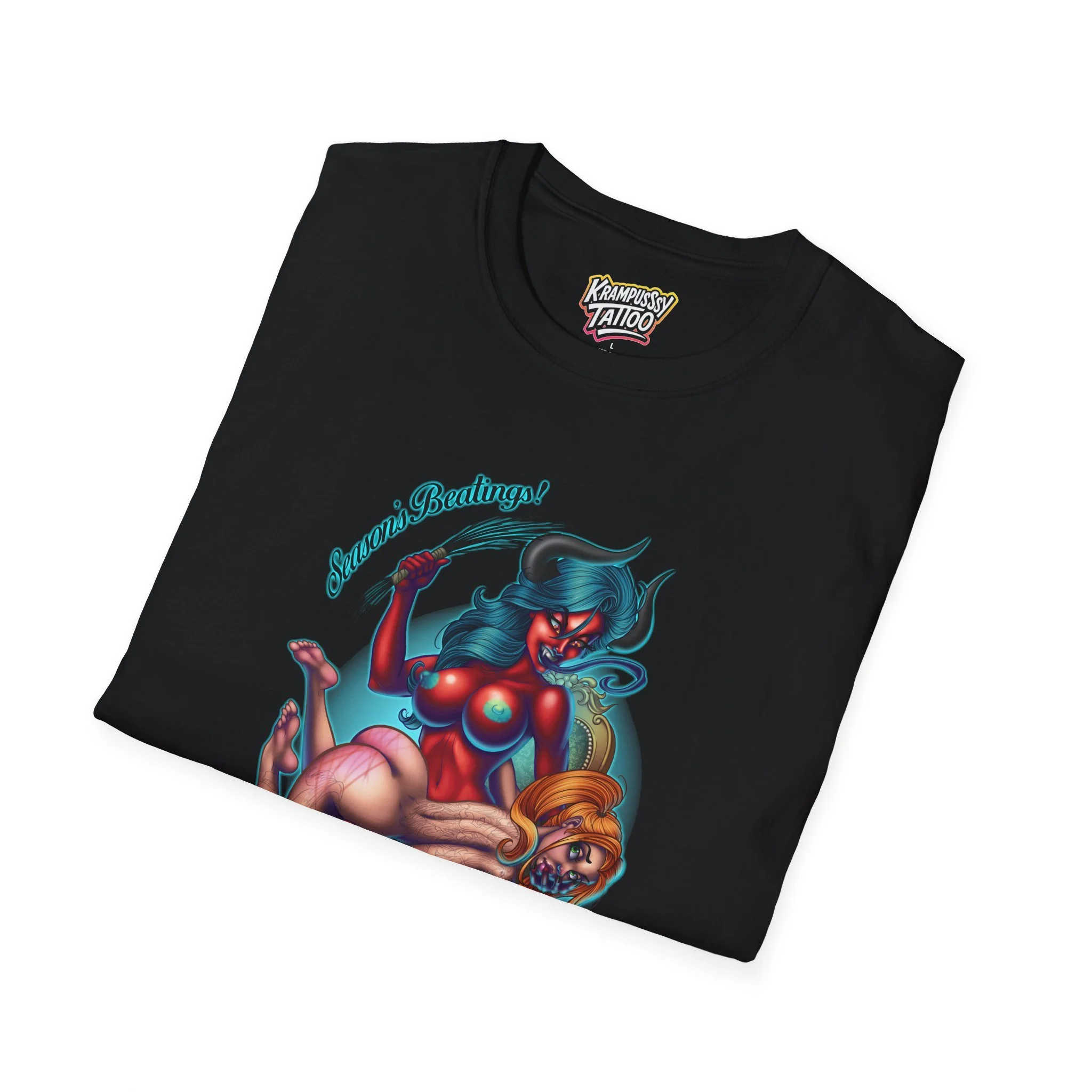 A unisex softstyle T-shirt featuring an illustration of Krampus, perfect for those who enjoy dark and alternative designs. Ideal for adults looking for a statement piece to wear during Halloween or Christmas celebrations.