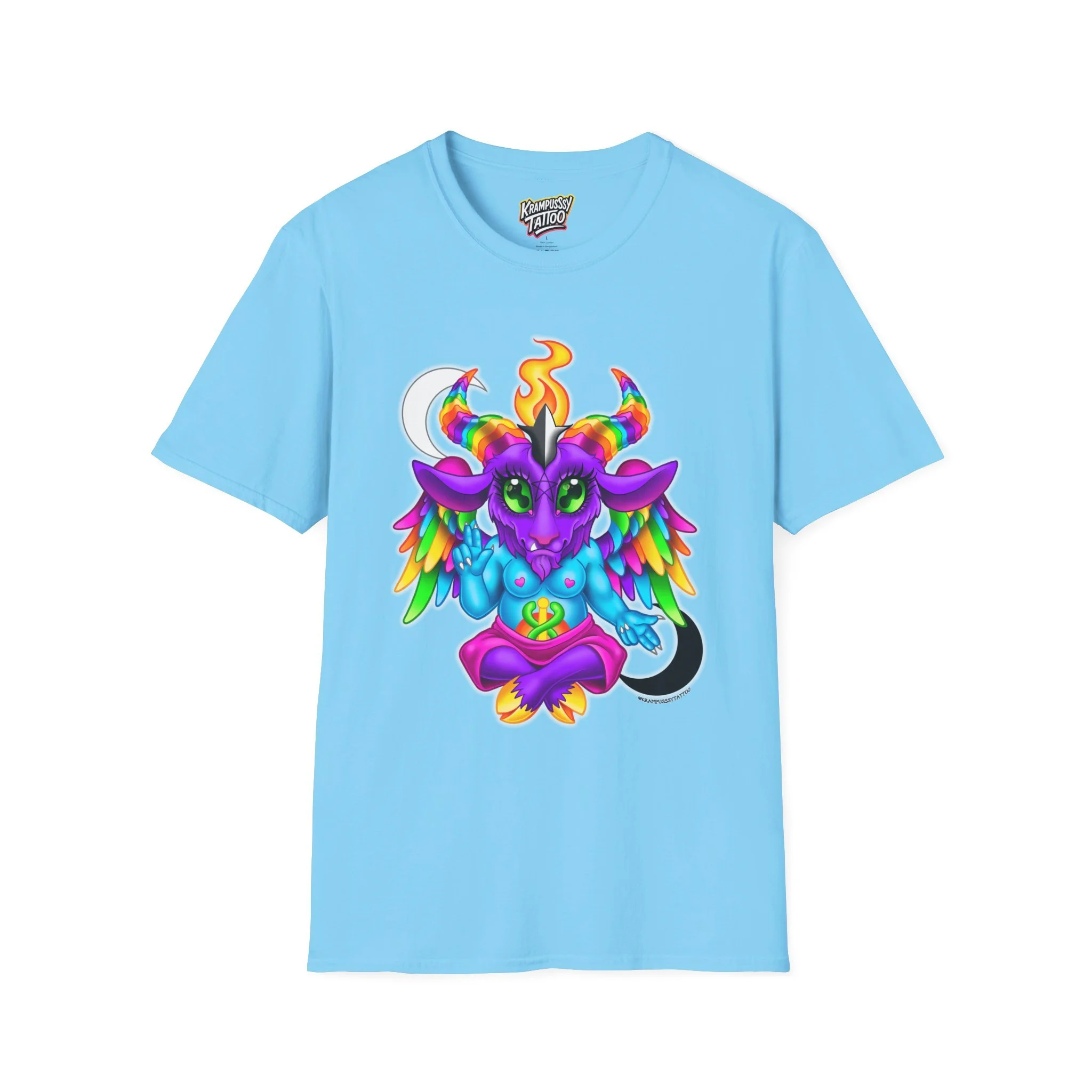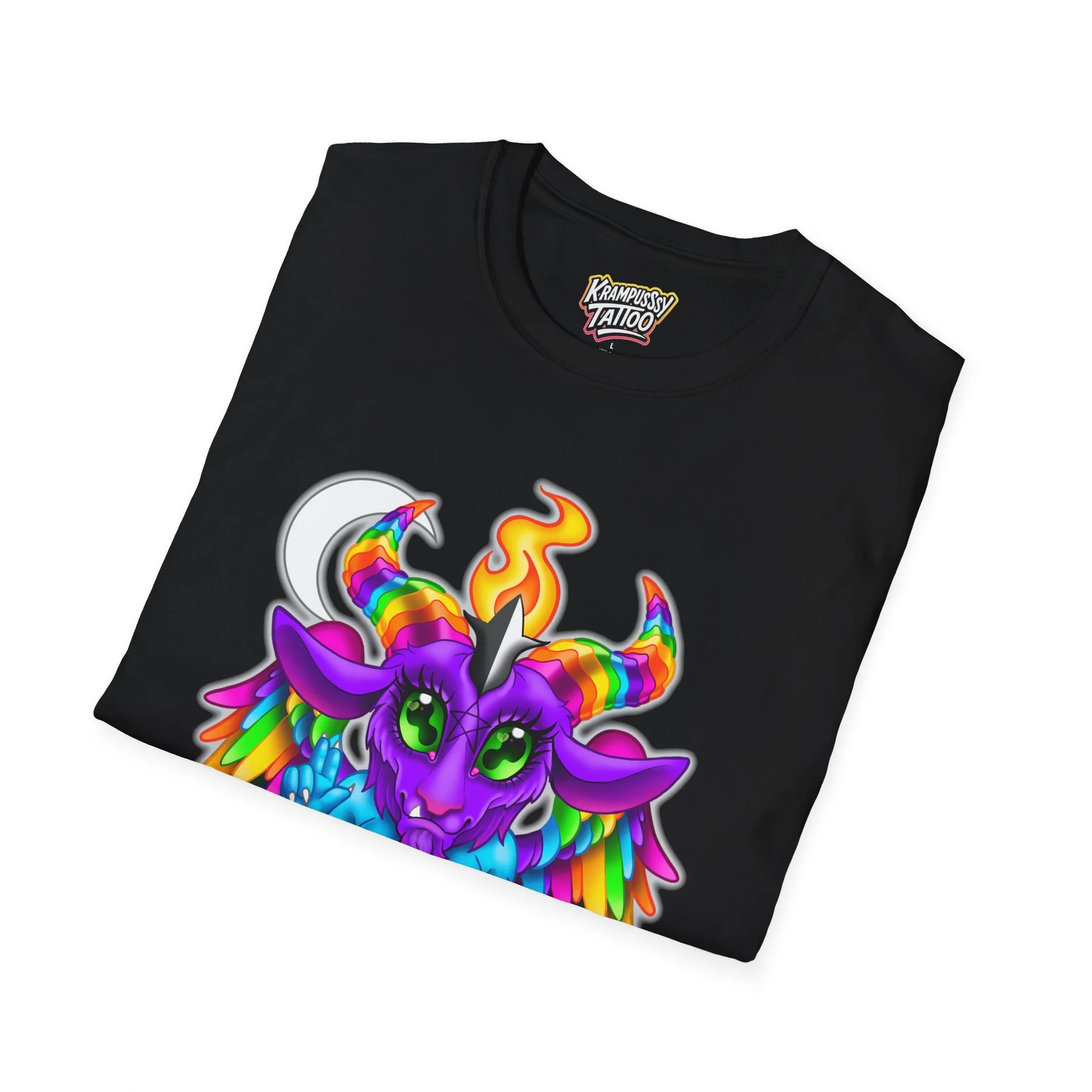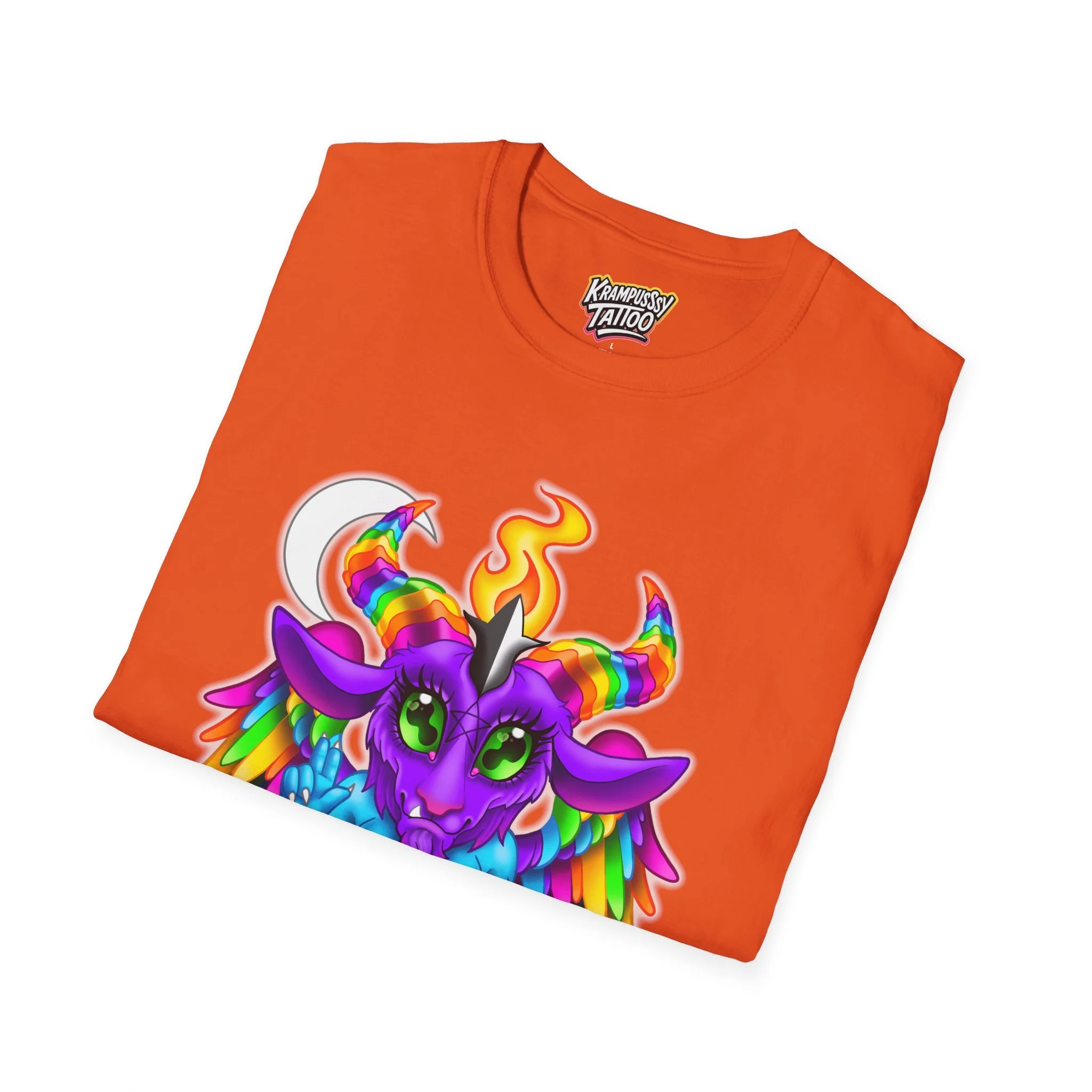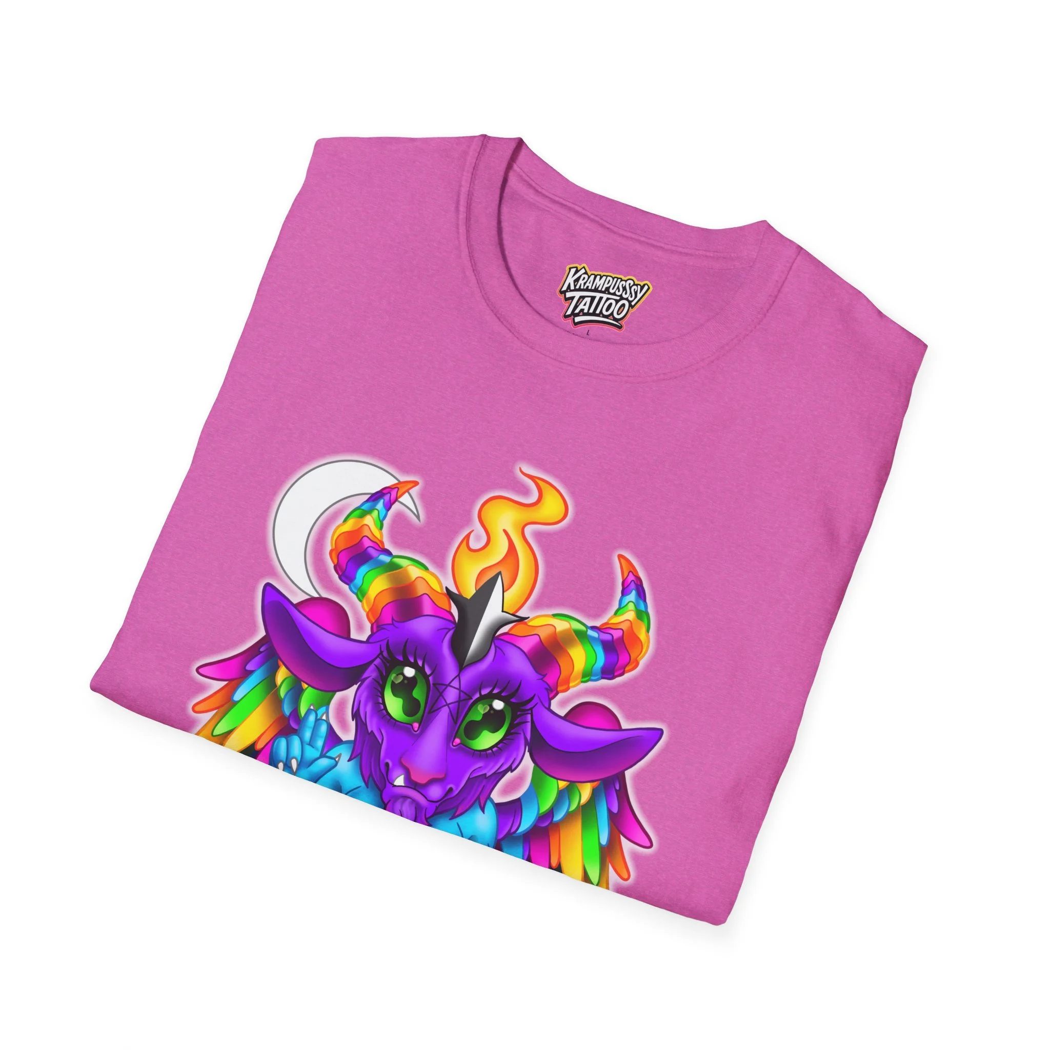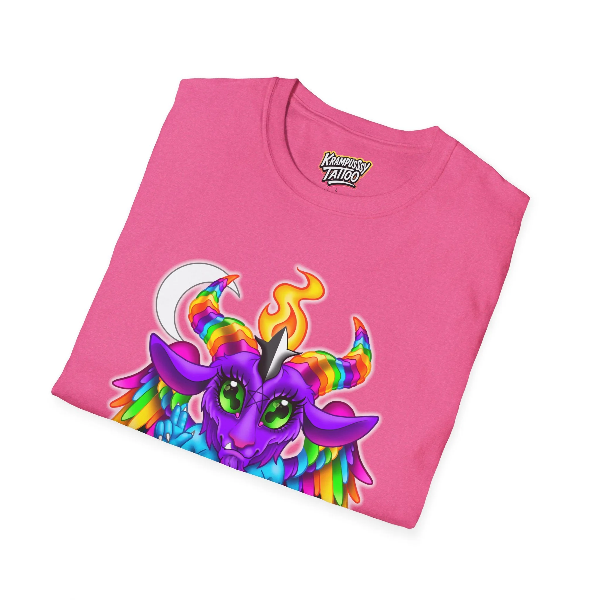 Colorful and cute Baphomet design, perfect for those who love unique and fun fashion. This unisex softstyle T-shirt is made from durable fabric for printing, with a classic fit and crew neckline suitable for various occasions. Ideal for adults looking to add a playful touch to their wardrobe.