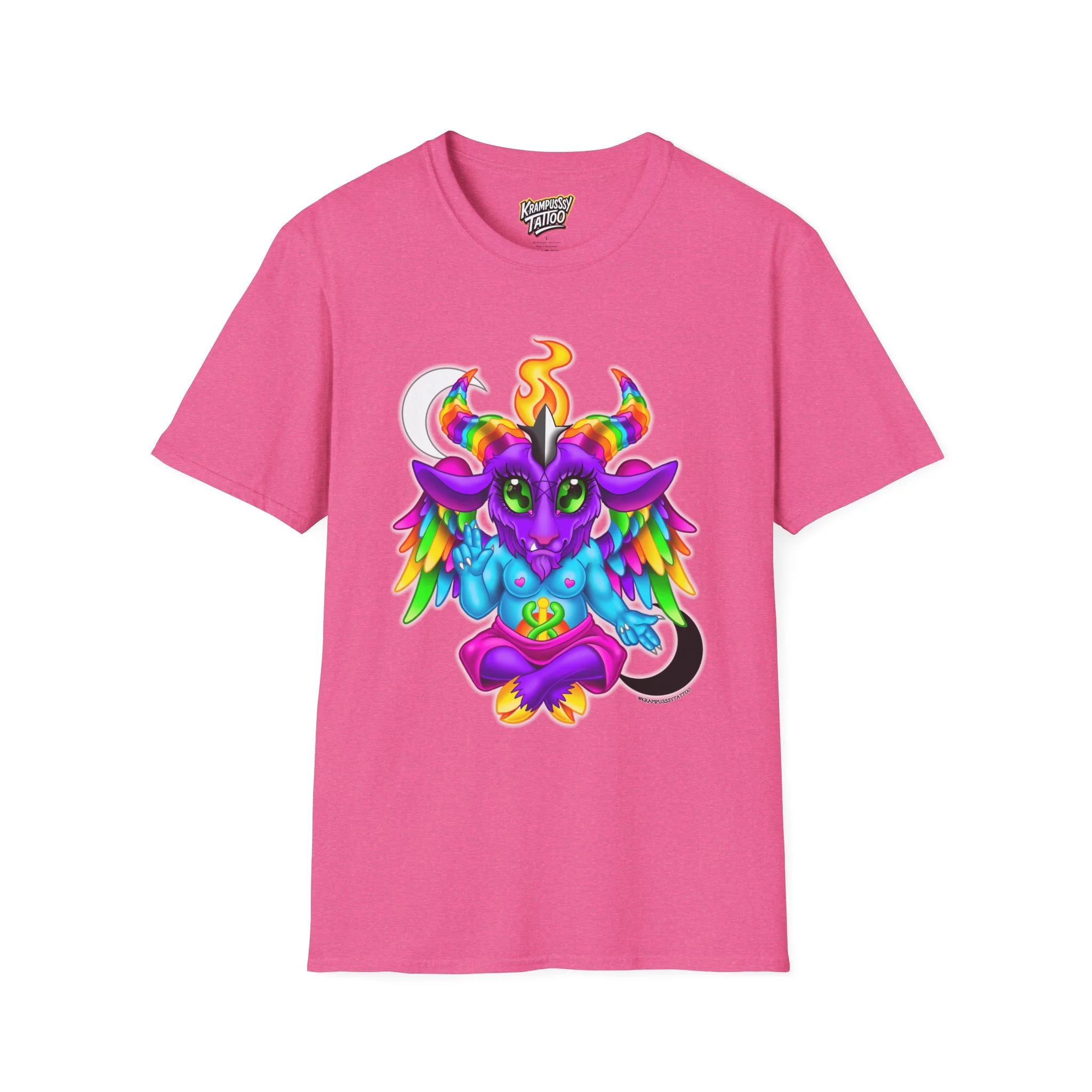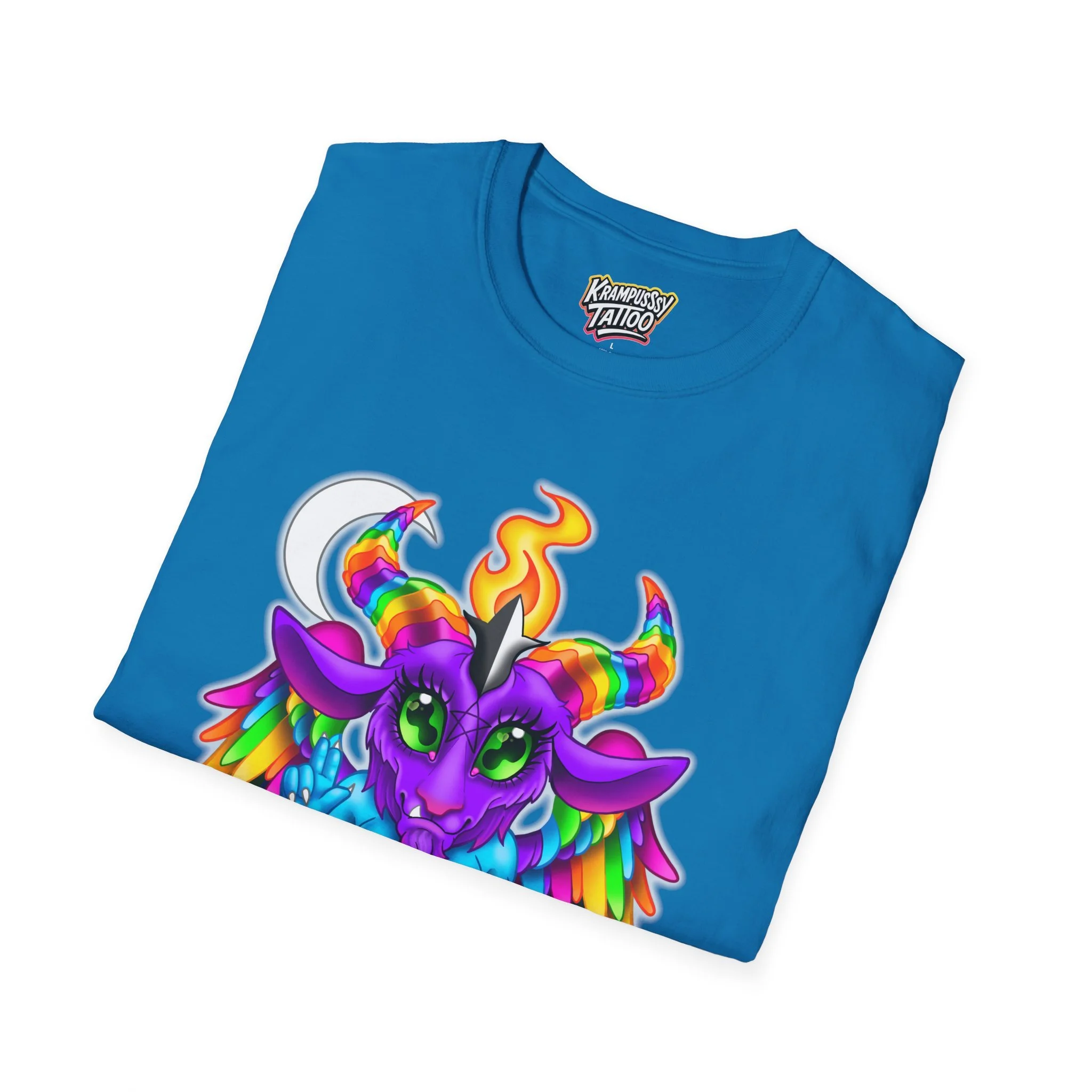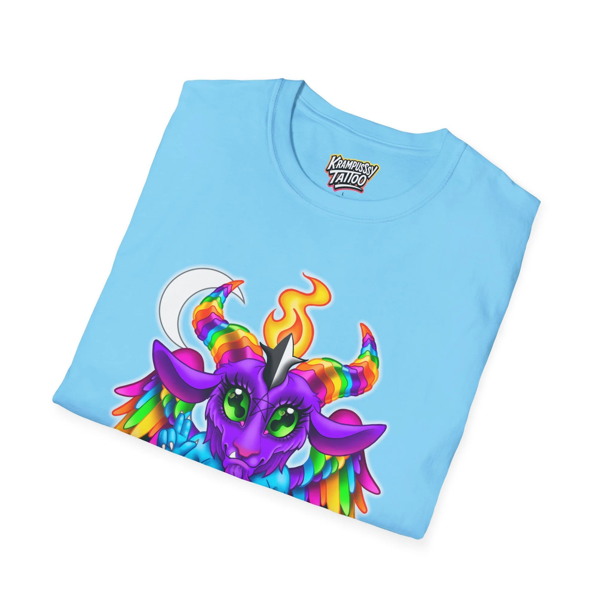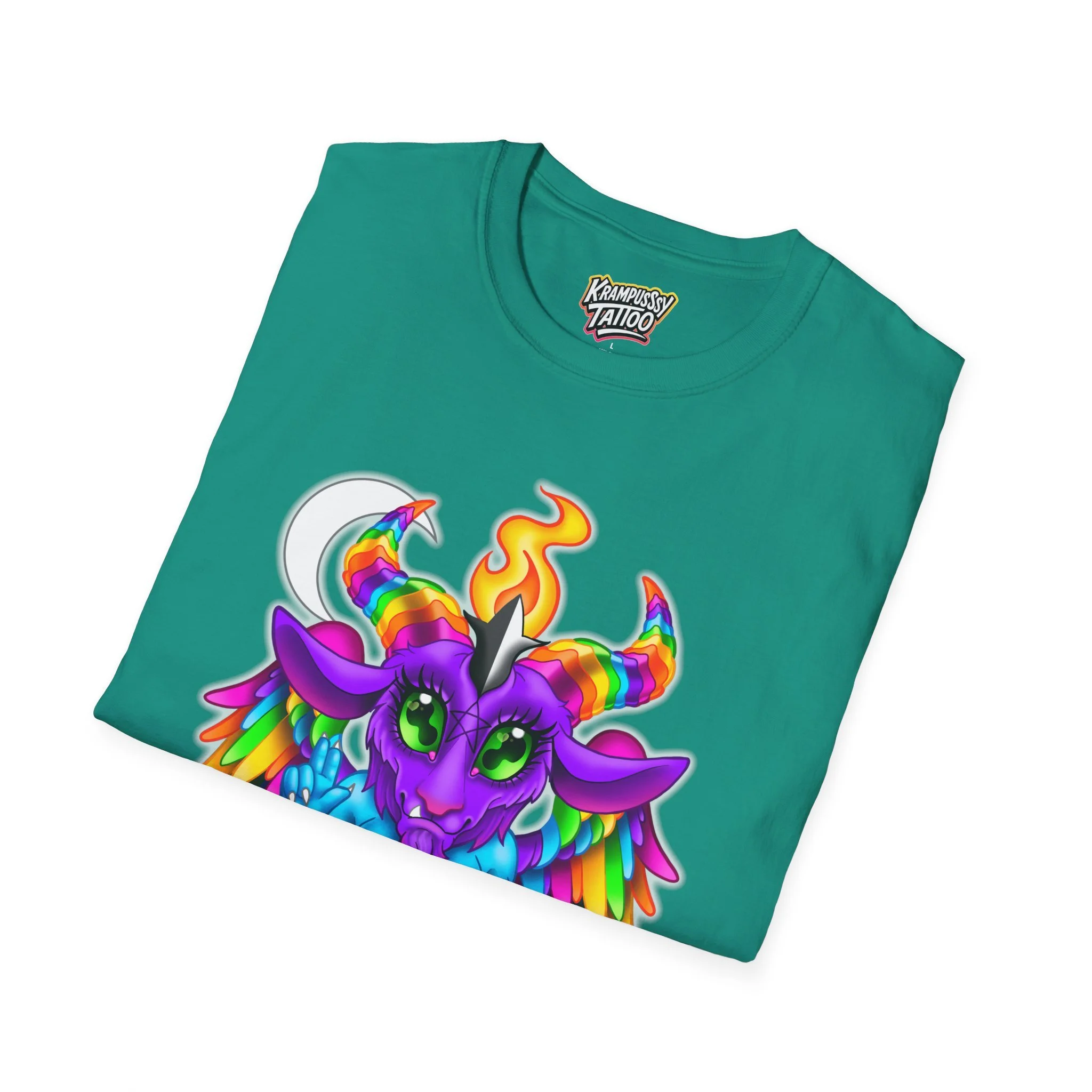 Colorful and cute Baphomet design, perfect for those who love unique and fun fashion. This unisex softstyle T-shirt is made from durable fabric for printing, with a classic fit and crew neckline suitable for various occasions. Ideal for adults looking to add a playful touch to their wardrobe.