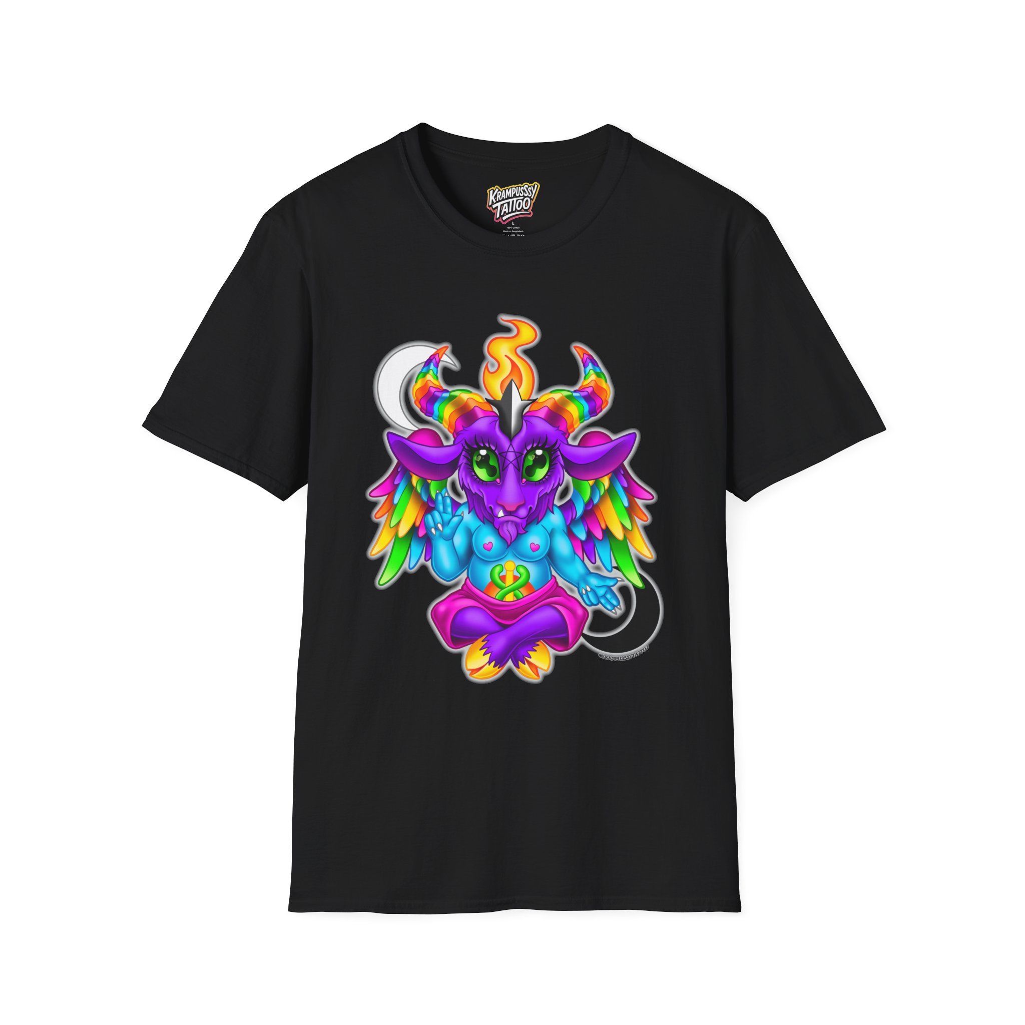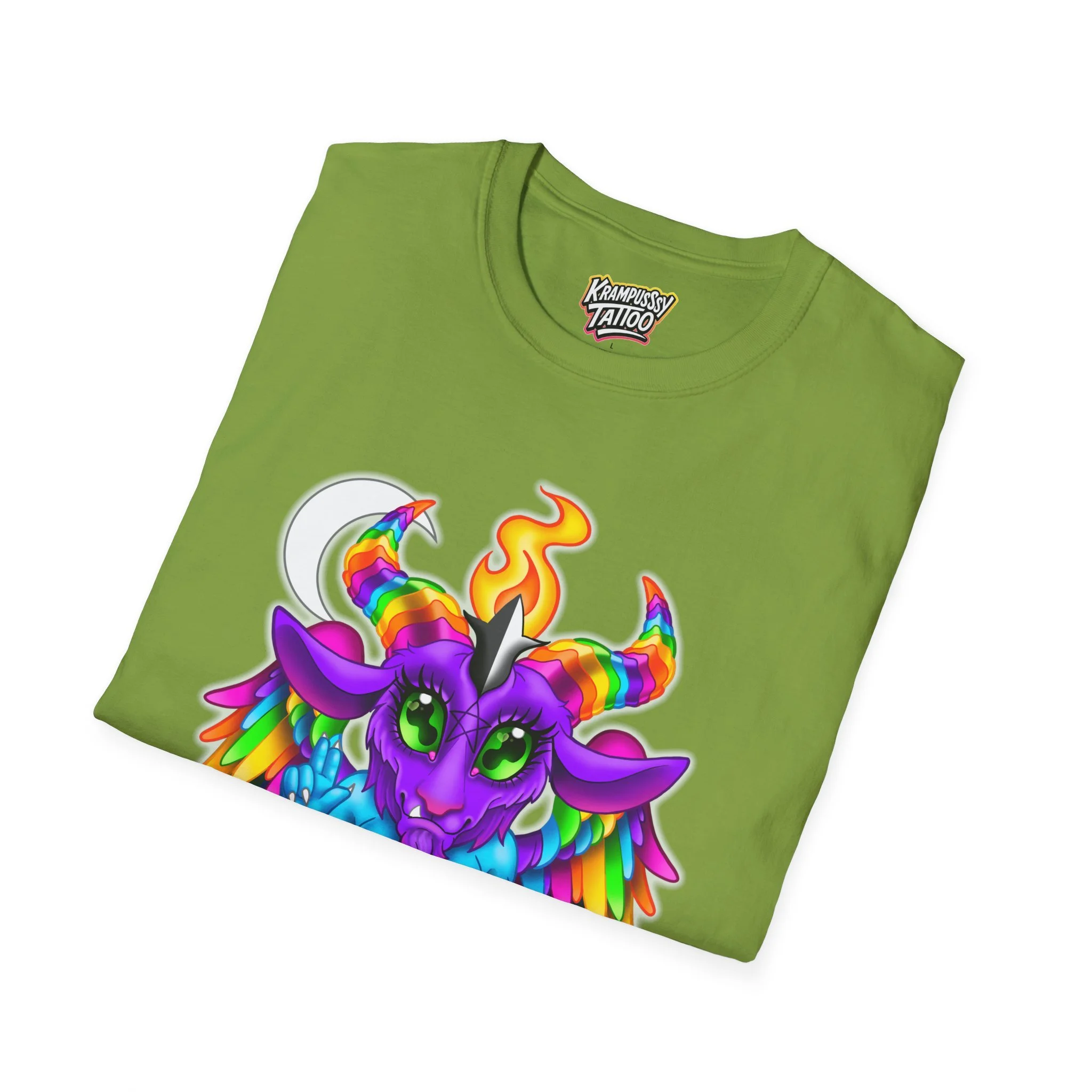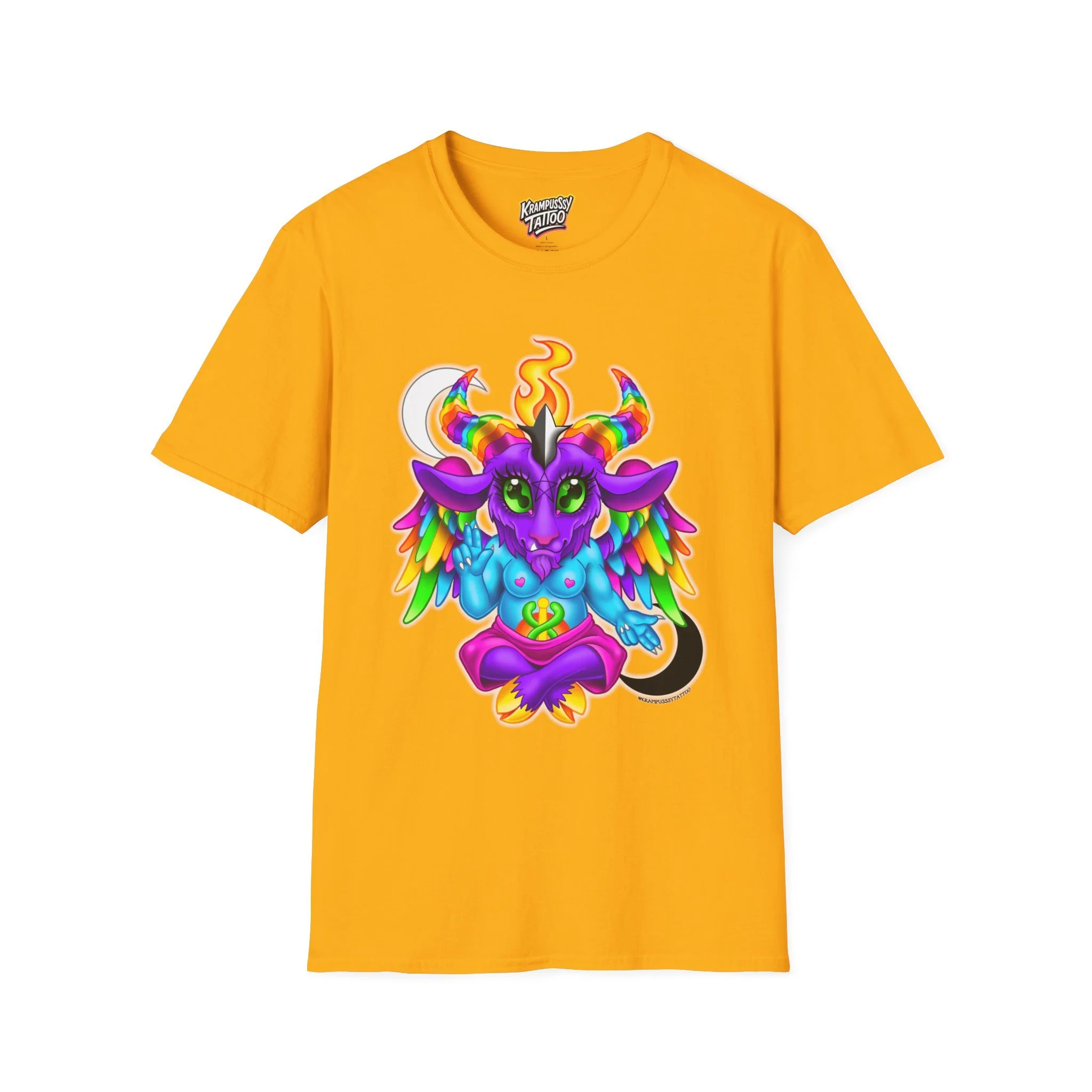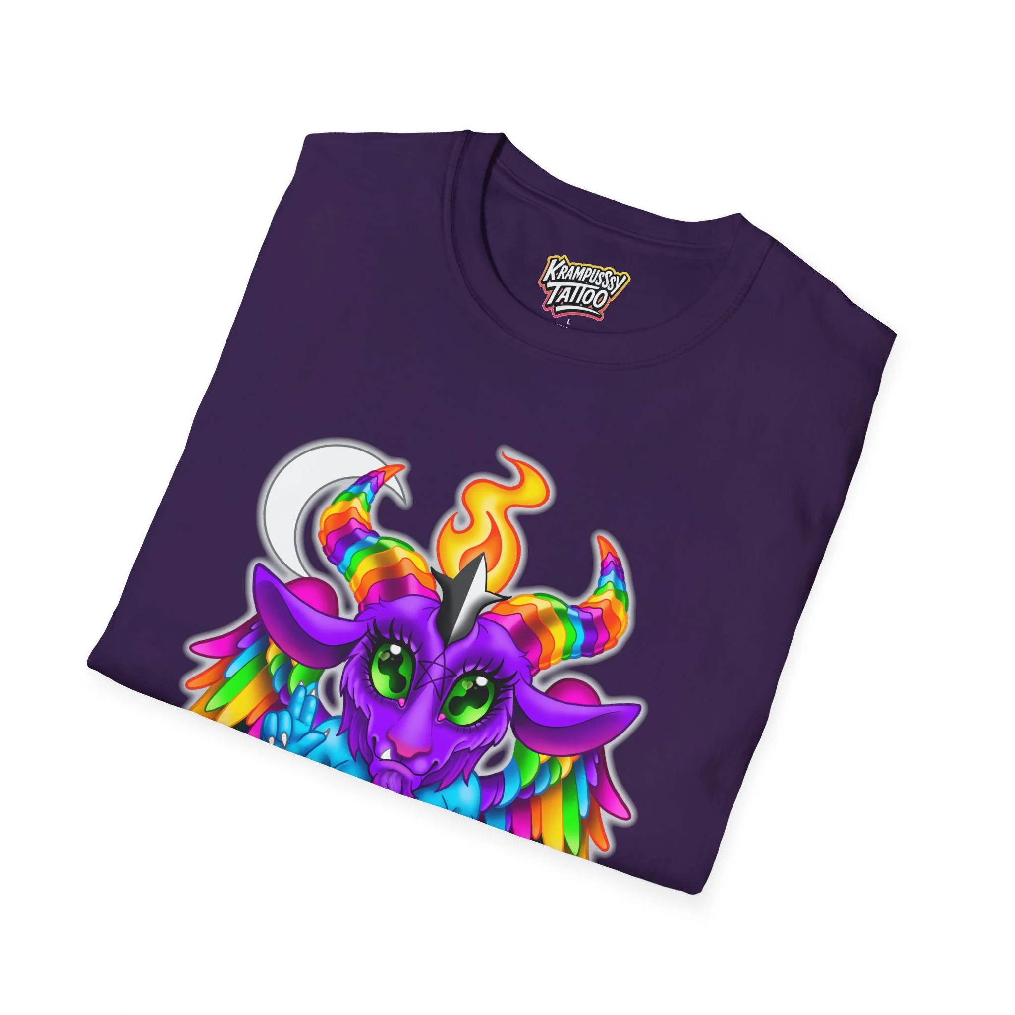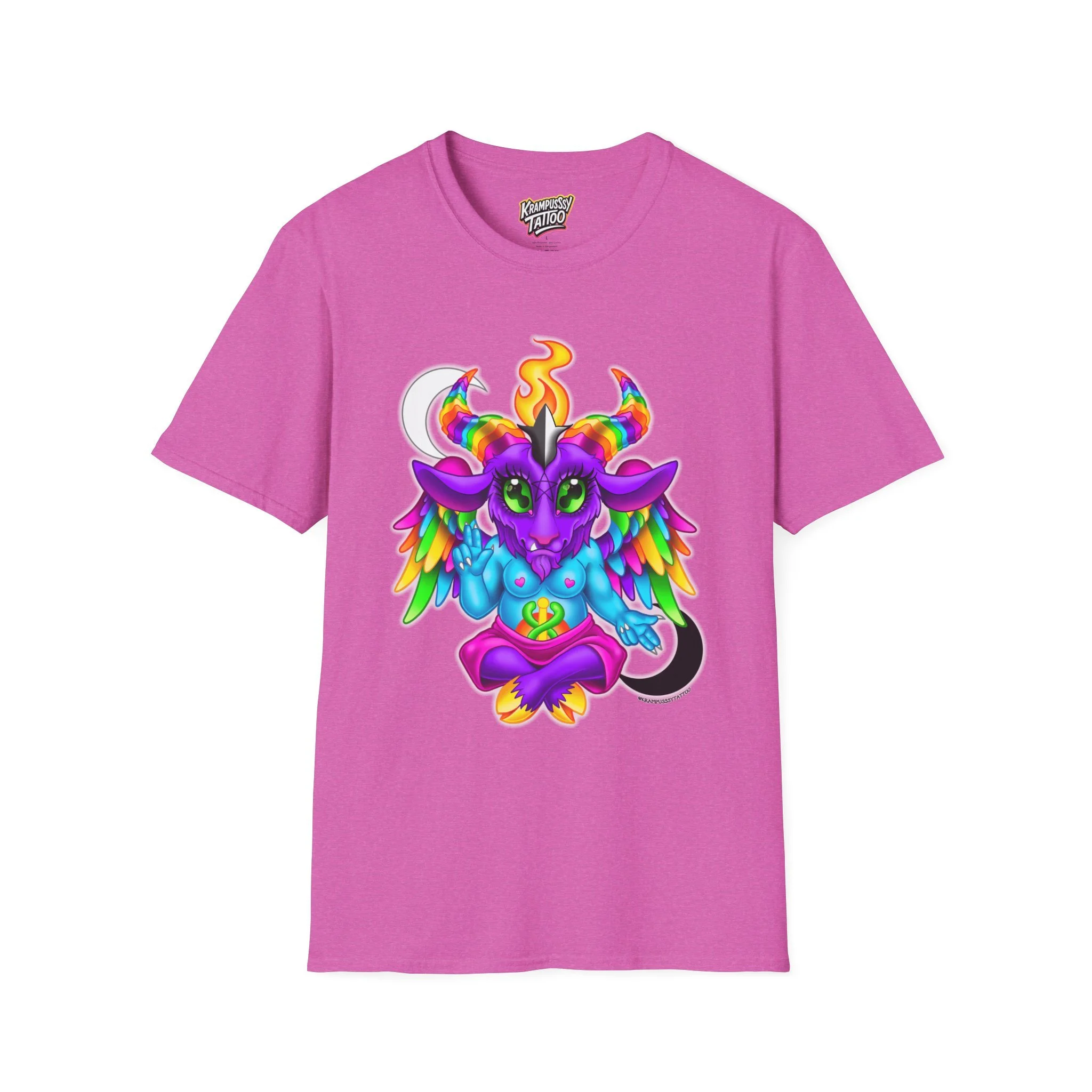 Colorful and cute Baphomet design, perfect for those who love unique and fun fashion. This unisex softstyle T-shirt is made from durable fabric for printing, with a classic fit and crew neckline suitable for various occasions. Ideal for adults looking to add a playful touch to their wardrobe.