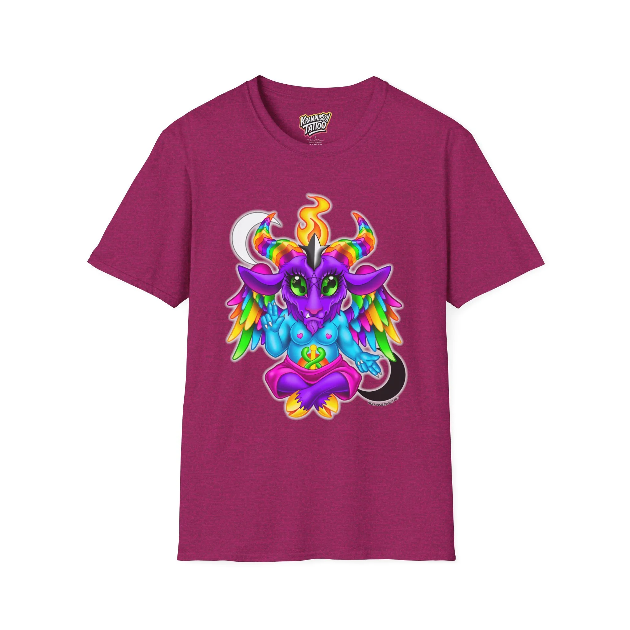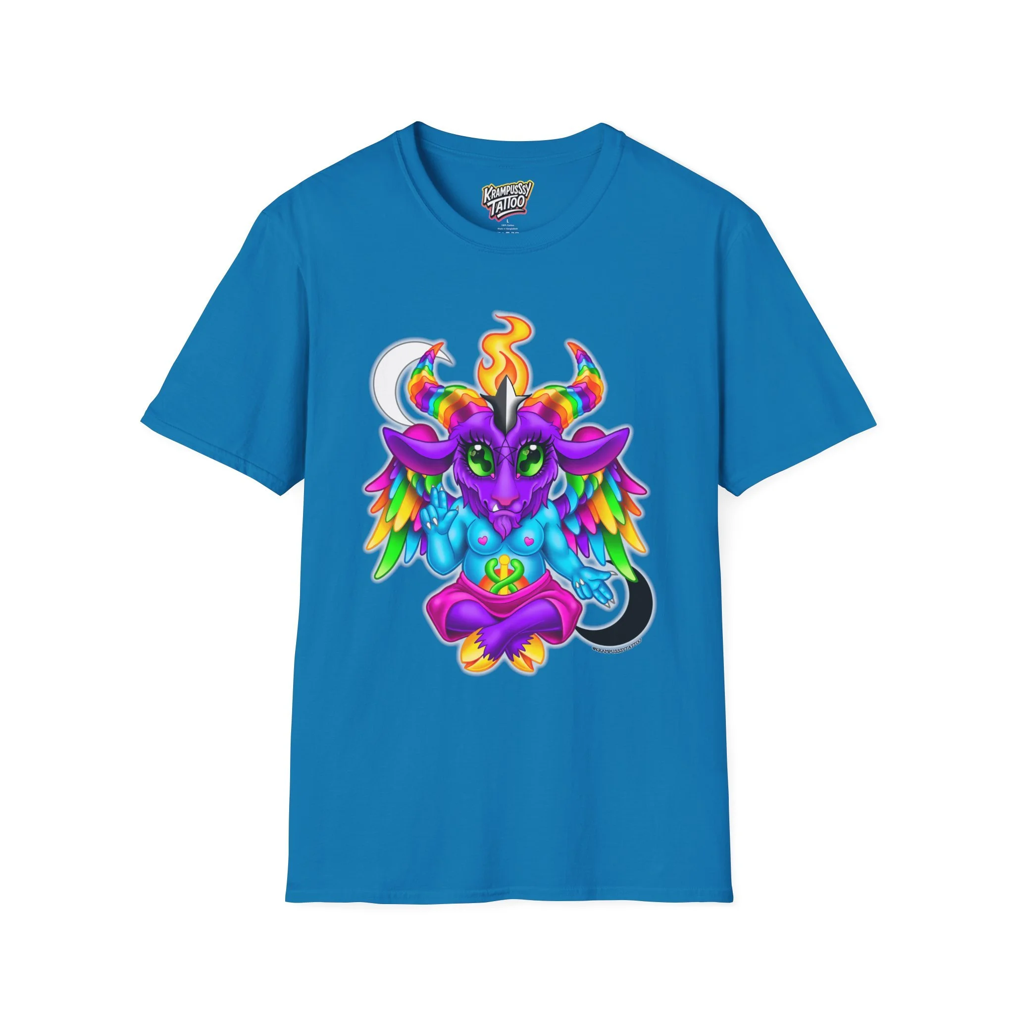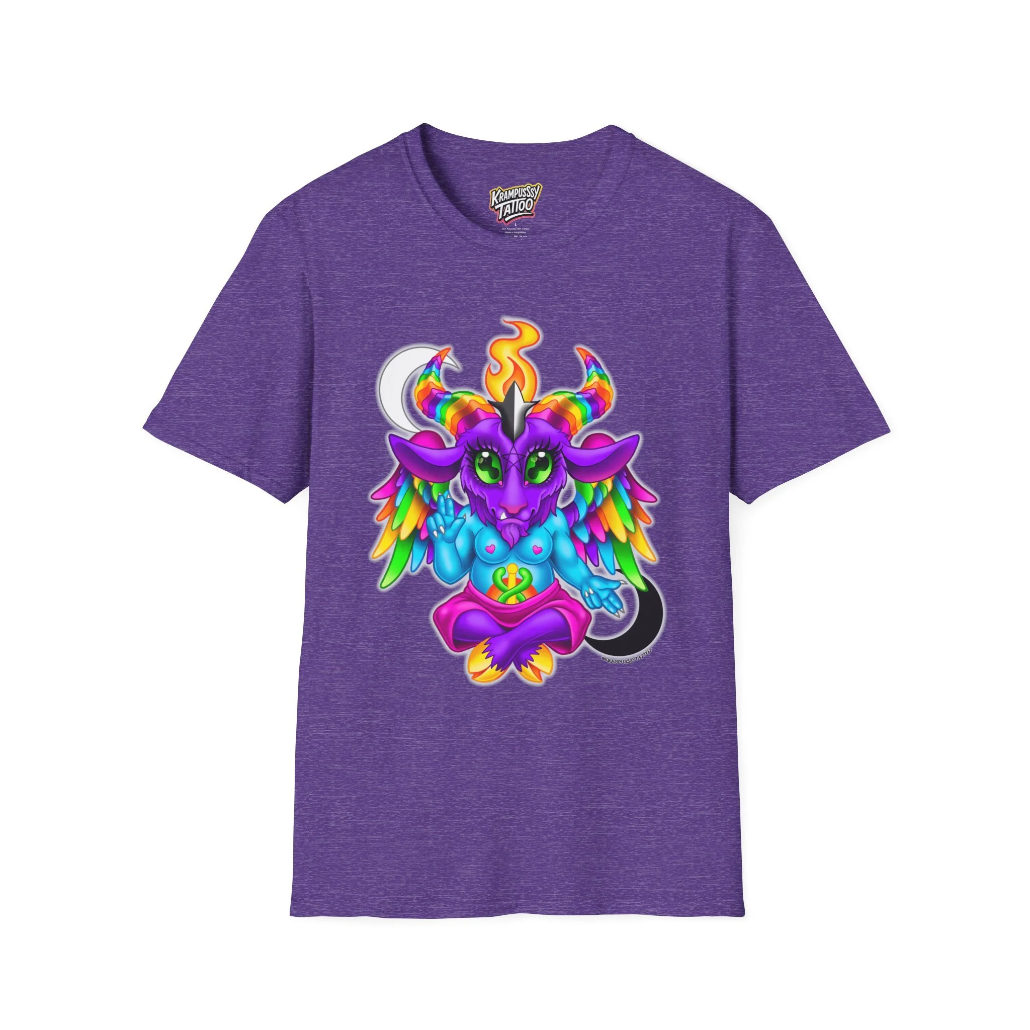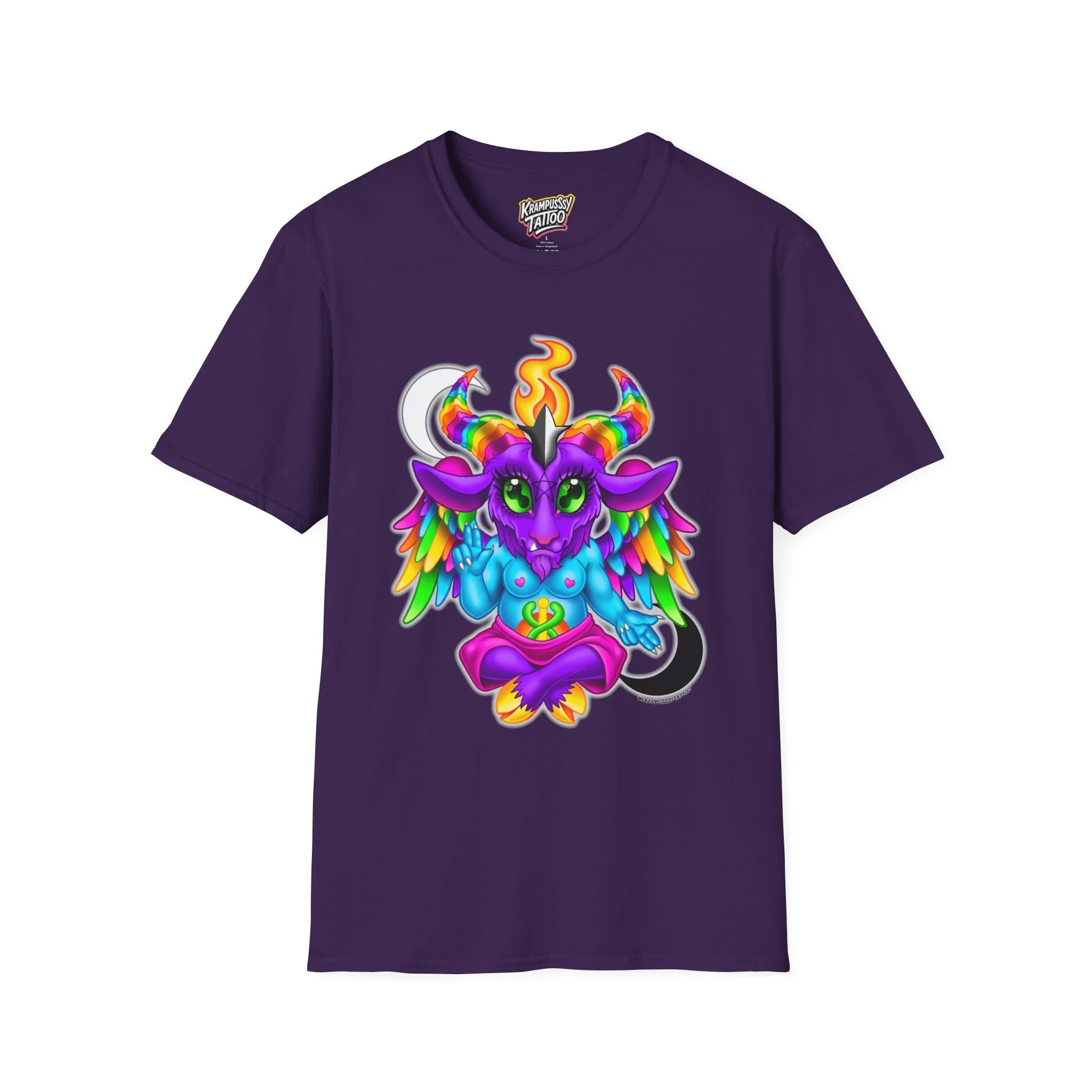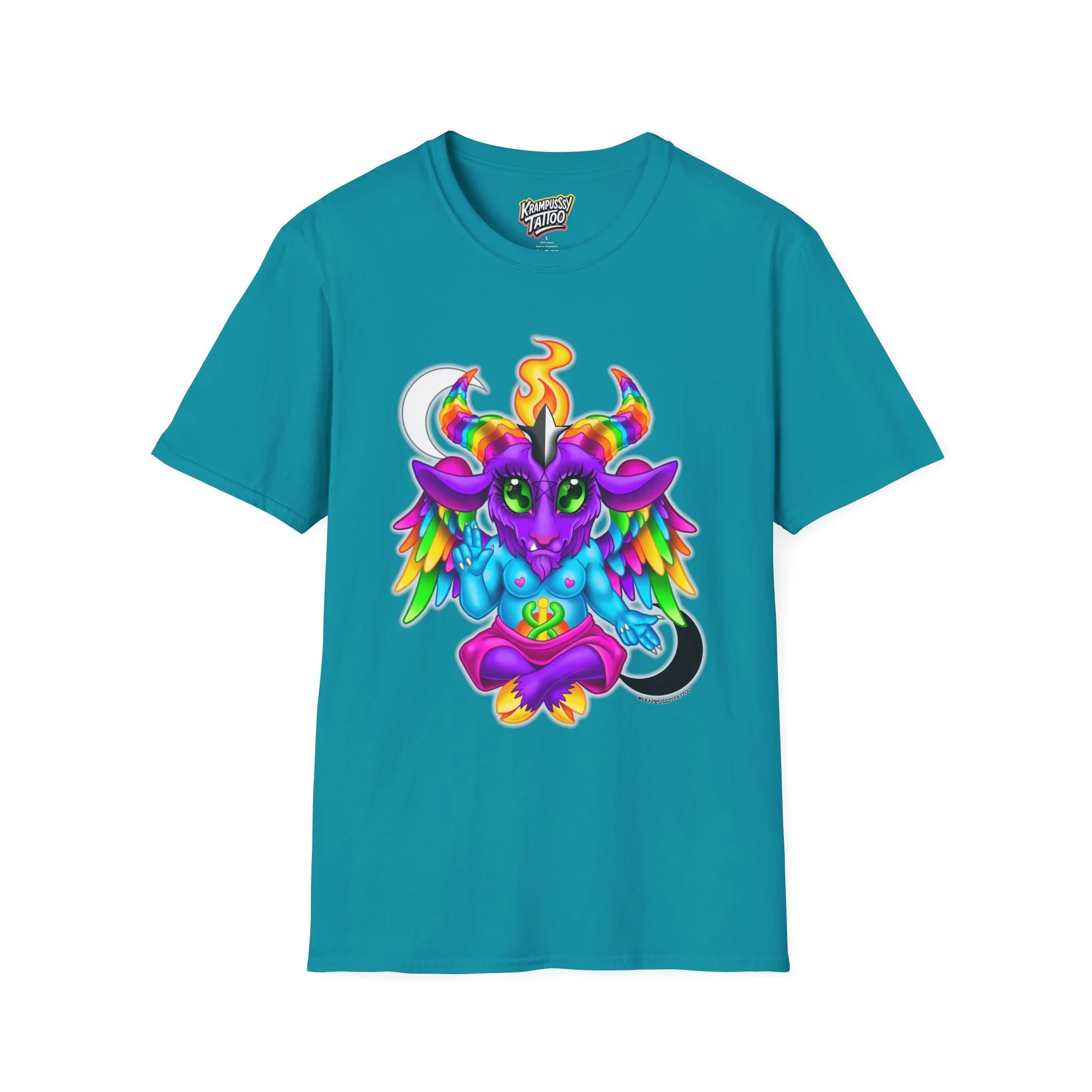 Colorful and cute Baphomet design, perfect for those who love unique and fun fashion. This unisex softstyle T-shirt is made from durable fabric for printing, with a classic fit and crew neckline suitable for various occasions. Ideal for adults looking to add a playful touch to their wardrobe.