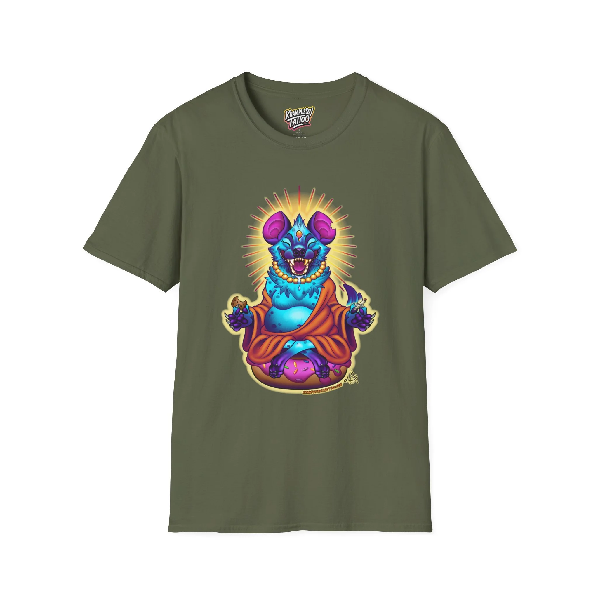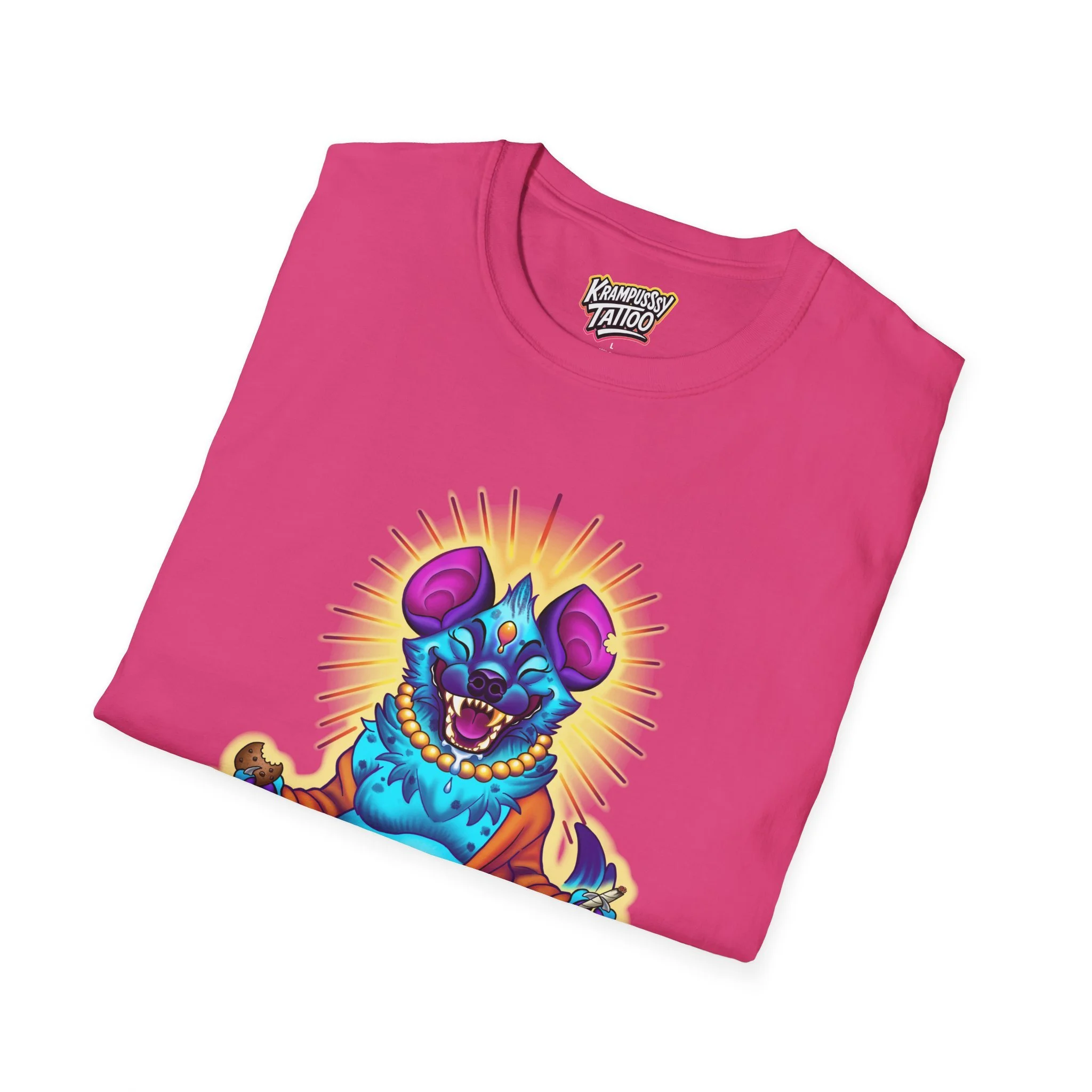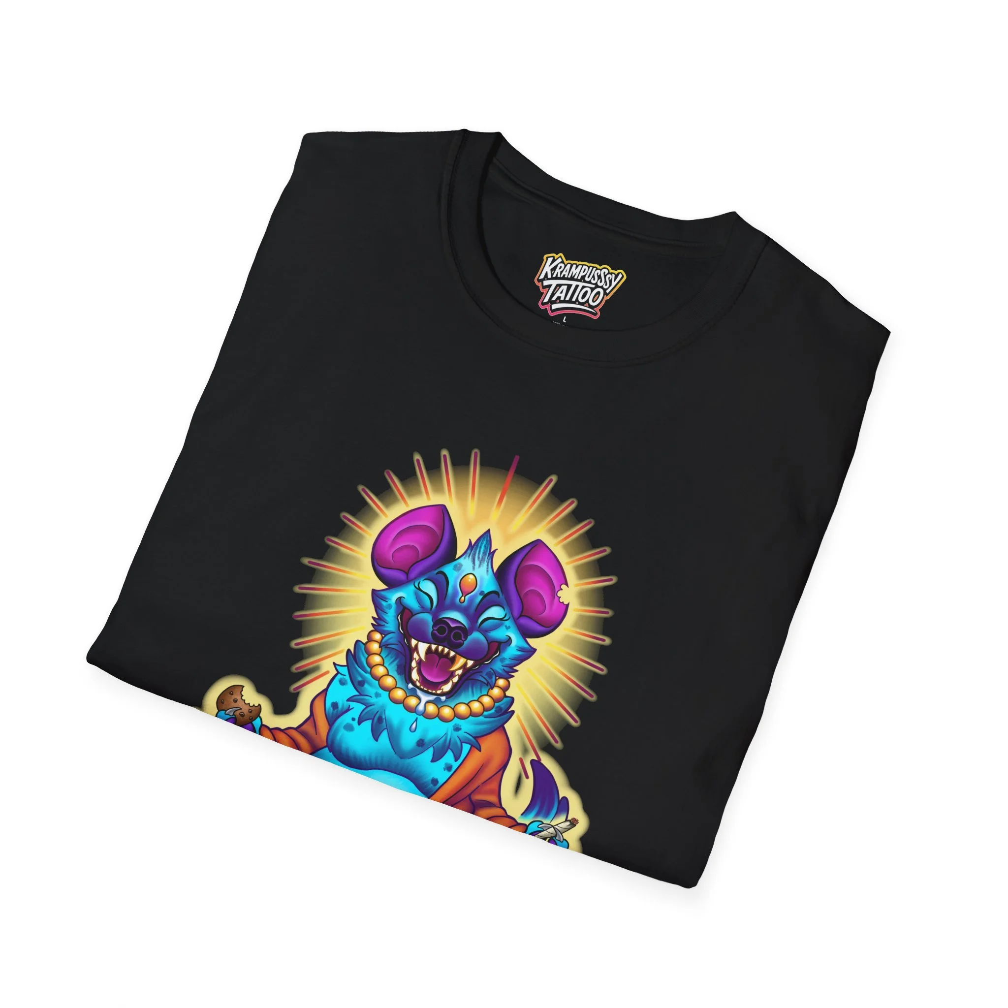 Fun and quirky T-Shirt featuring a cute happy fat hyena buddah smoking weed and eating a cookie. Perfect for anyone who loves unique and humorous designs. Ideal for casual wear or as a statement piece for holidays and celebrations.