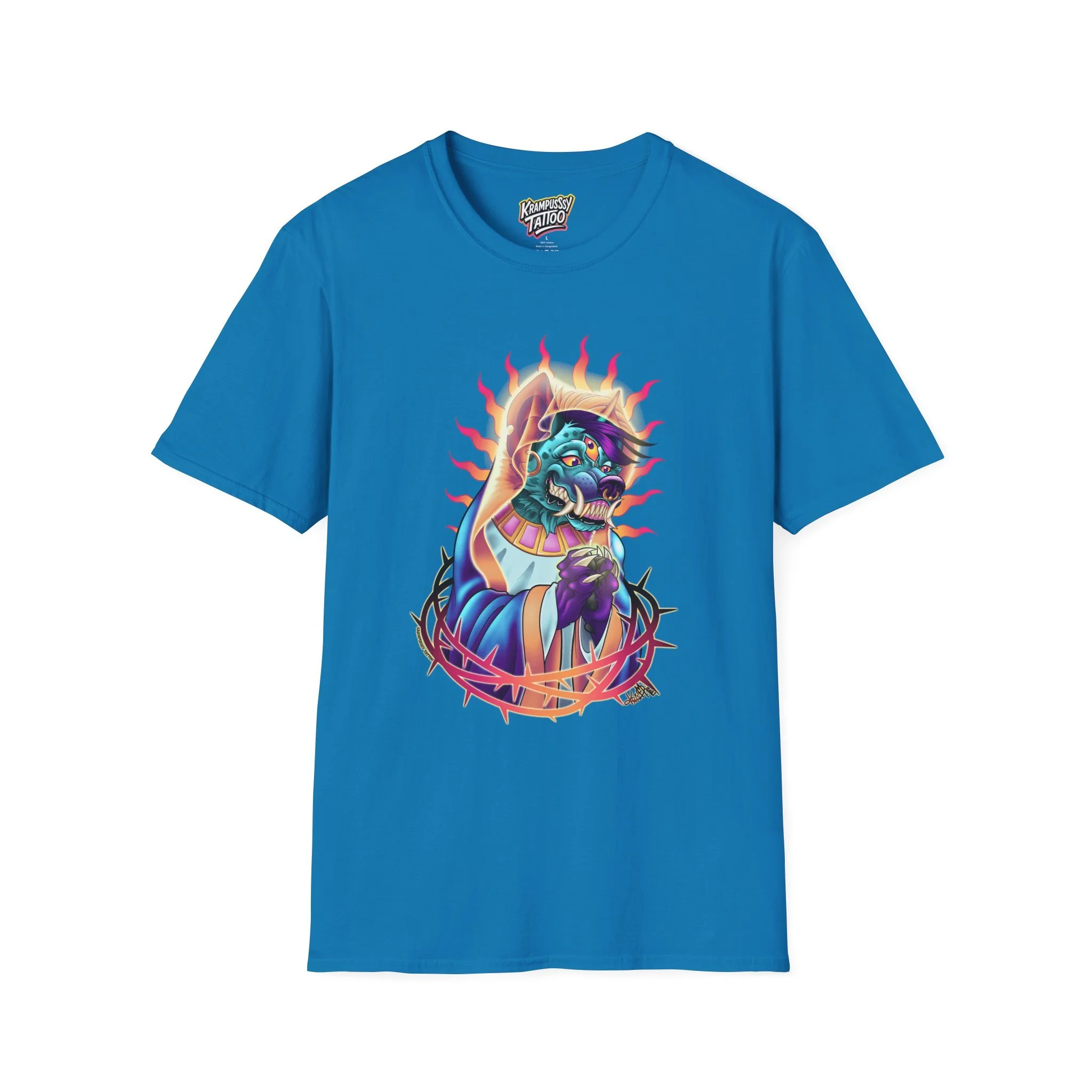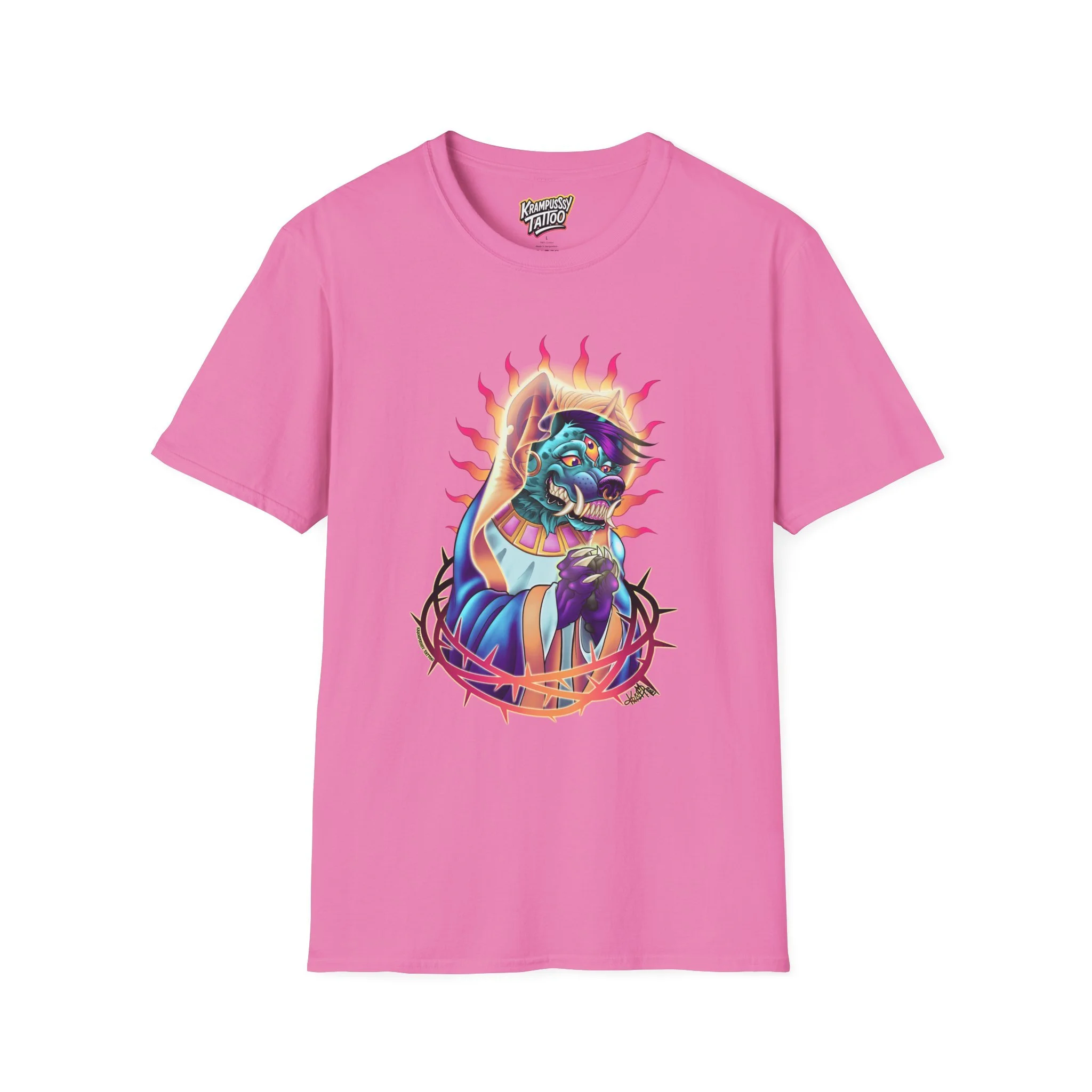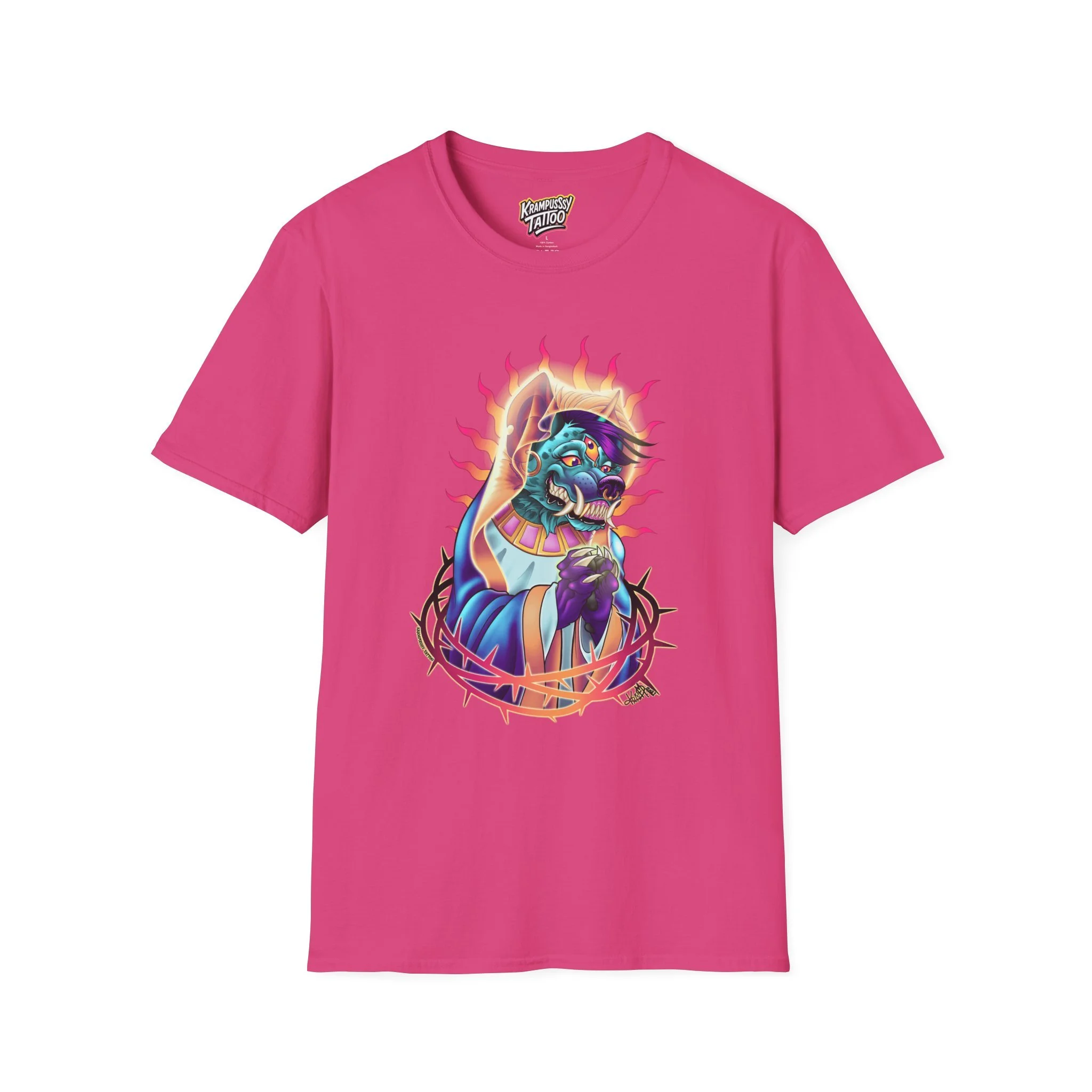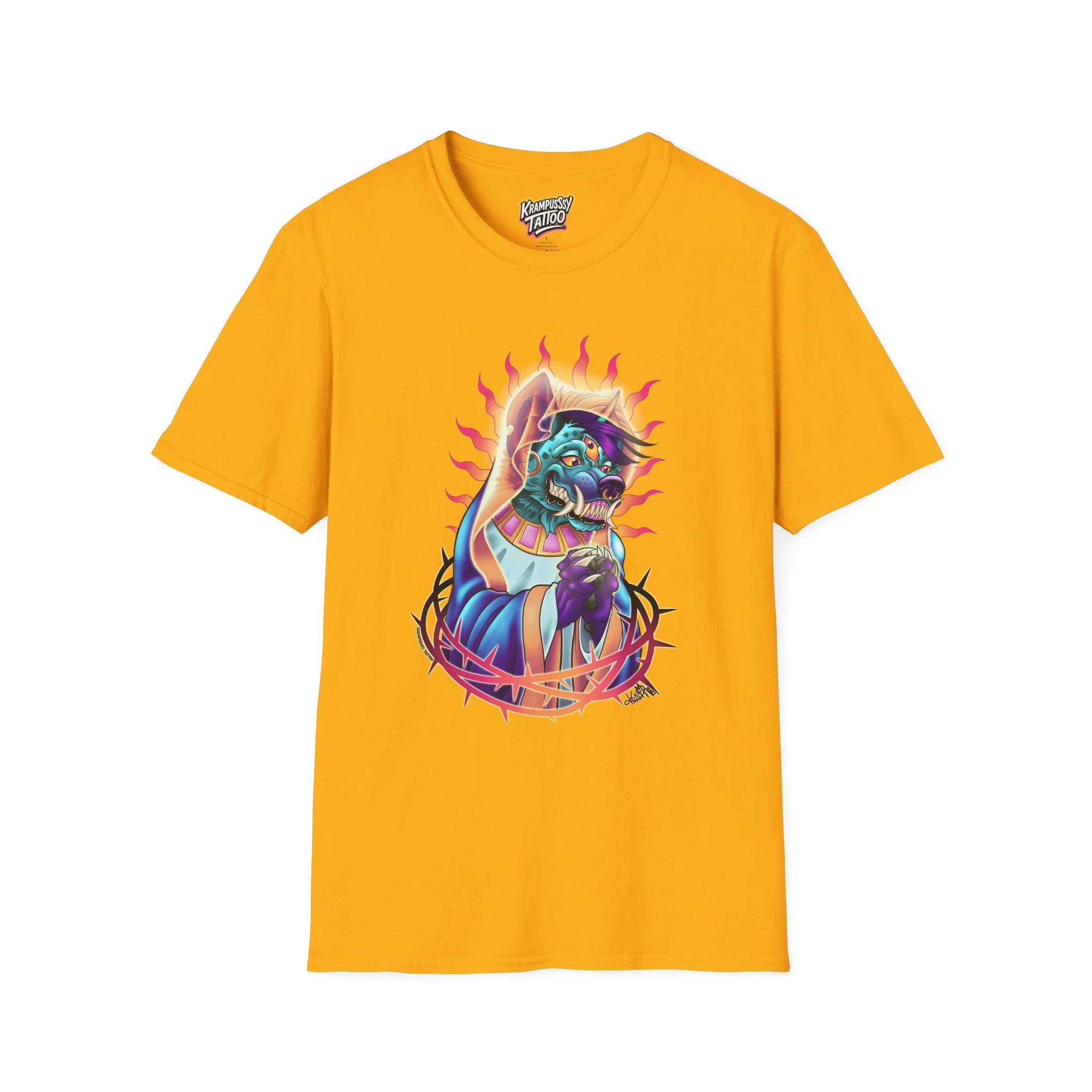 A vibrant T-shirt featuring a hyena praying design in bold, bright colors. Perfect for those looking to make a statement with their outfit. Ideal for animal lovers and those who appreciate unique and eye-catching designs. Suitable for casual wear, as well as special occasions and events.