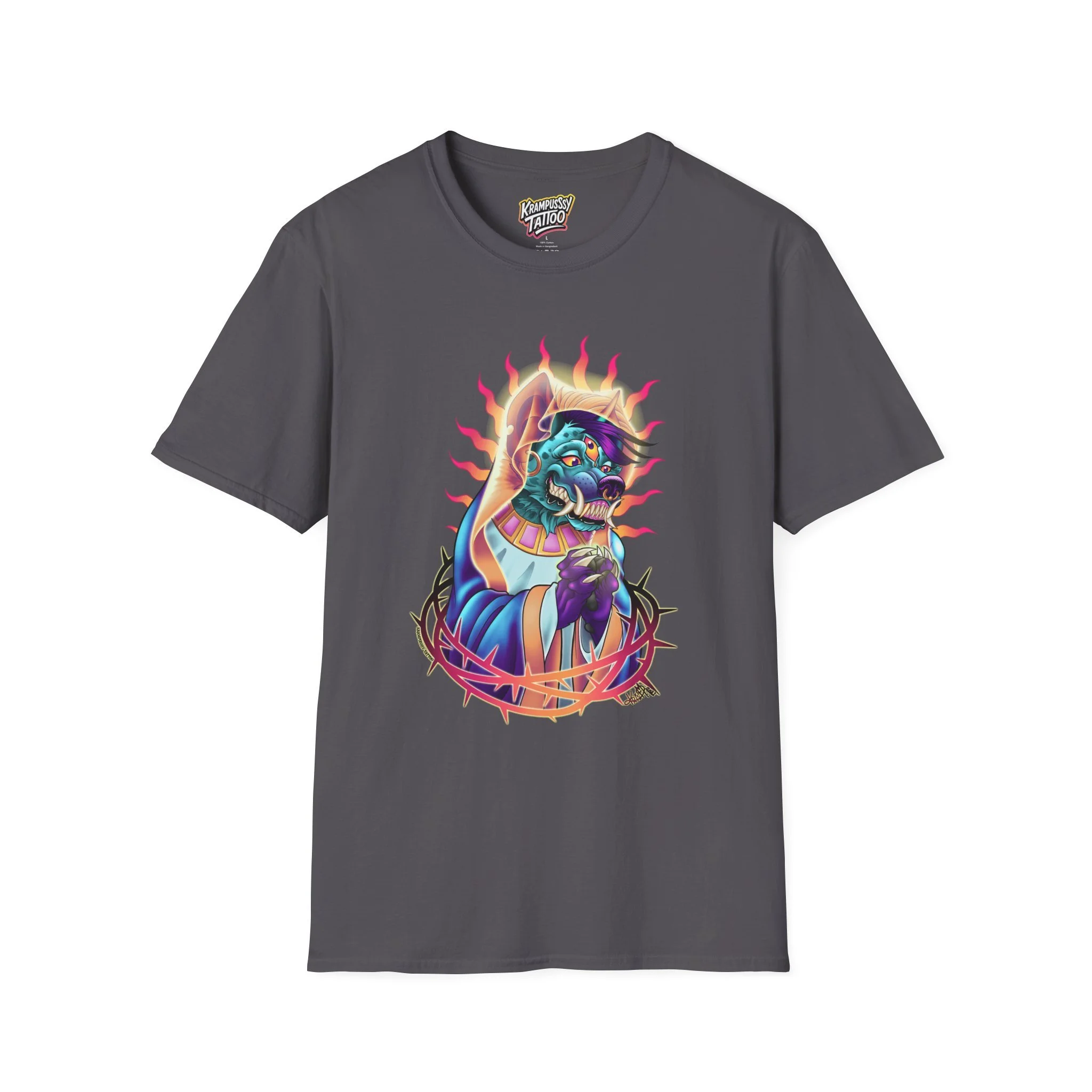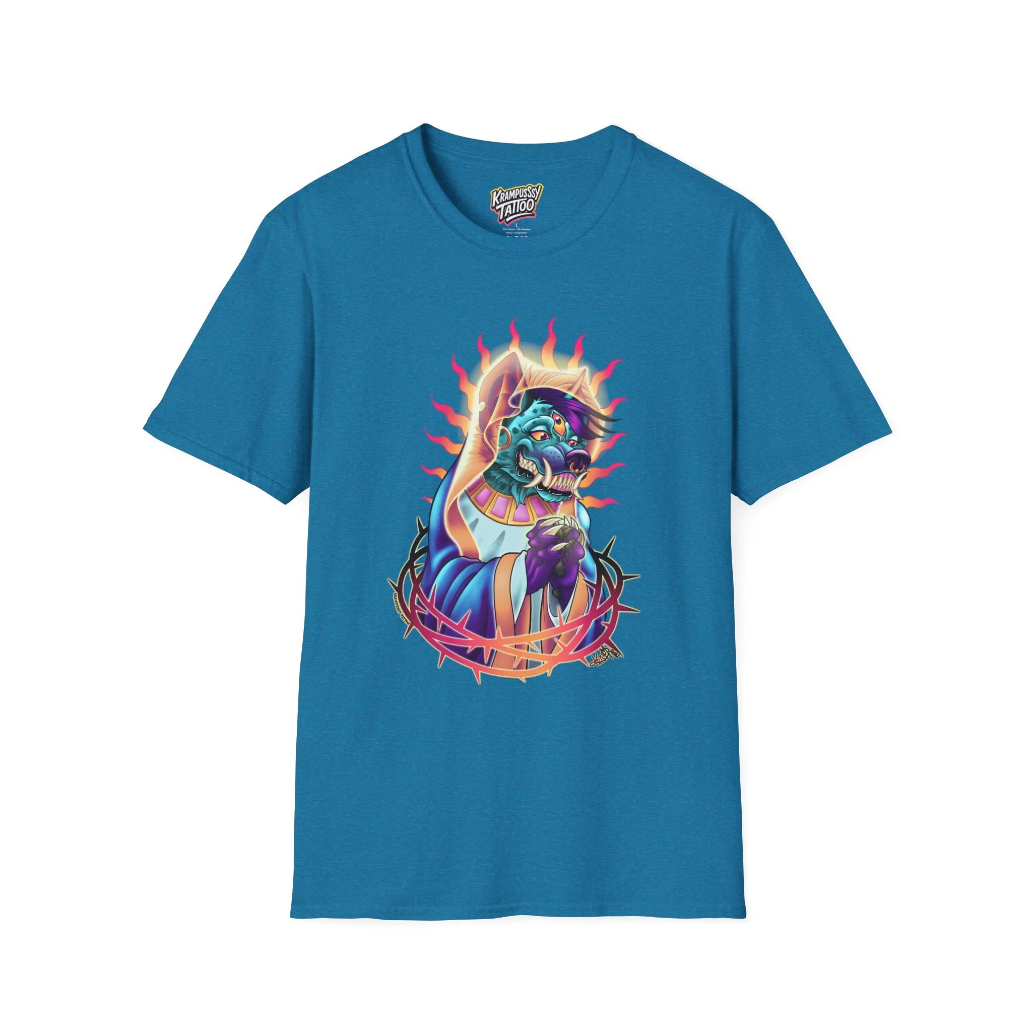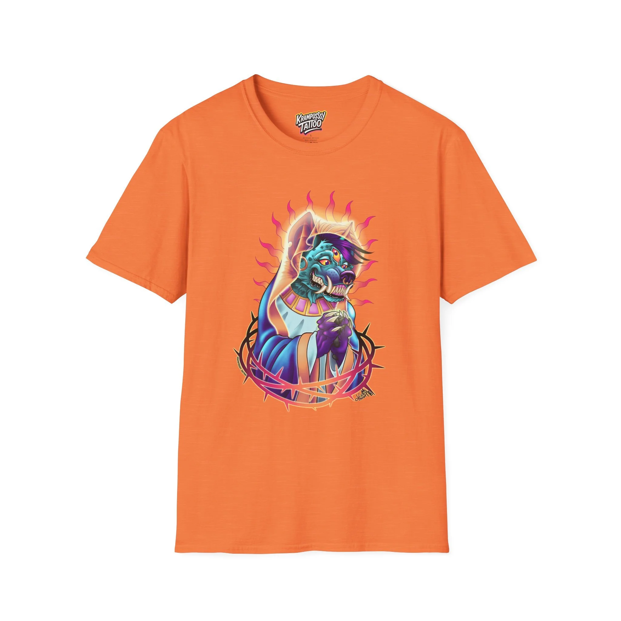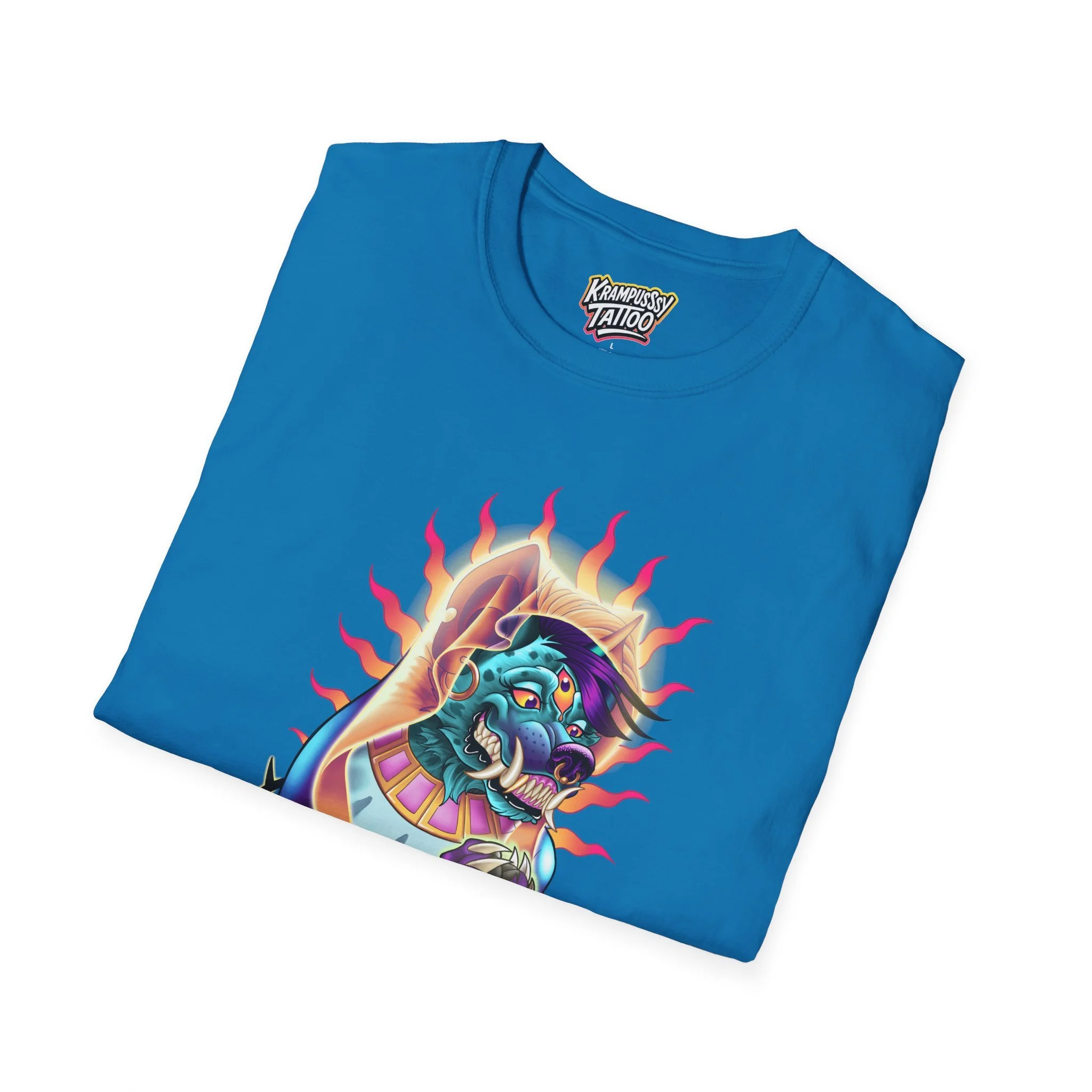 A vibrant T-shirt featuring a hyena praying design in bold, bright colors. Perfect for those looking to make a statement with their outfit. Ideal for animal lovers and those who appreciate unique and eye-catching designs. Suitable for casual wear, as well as special occasions and events.