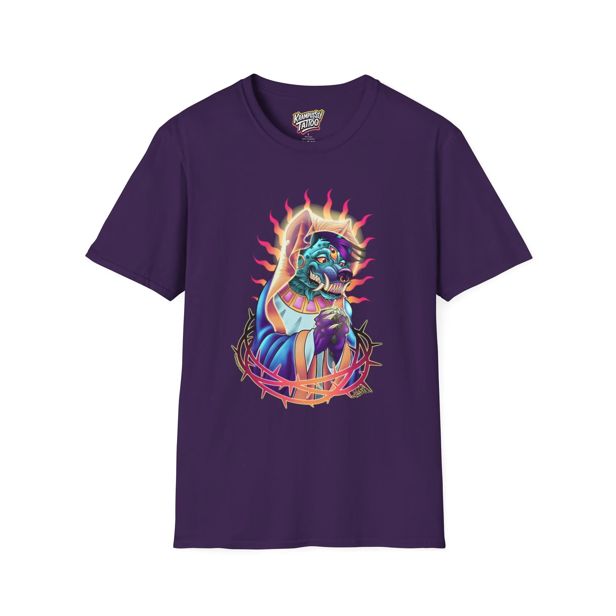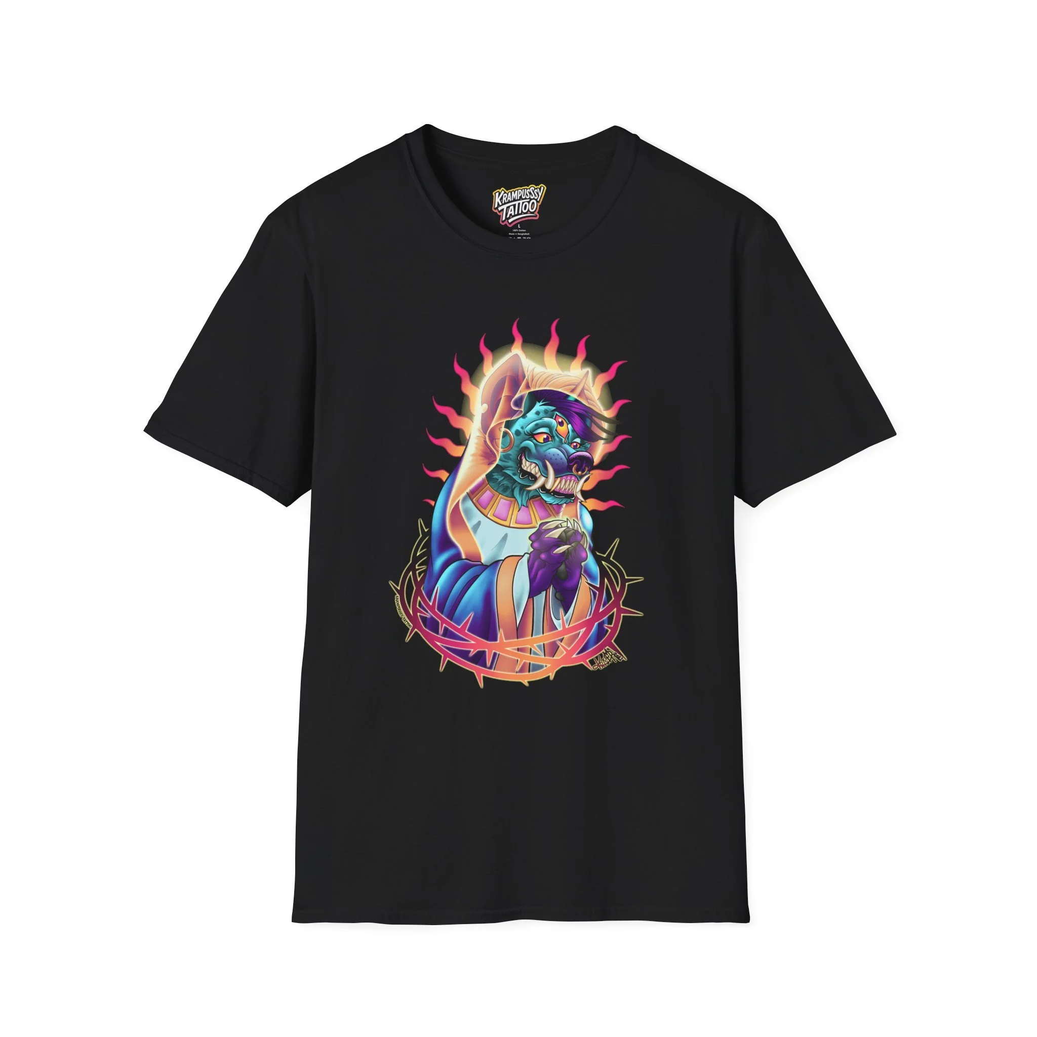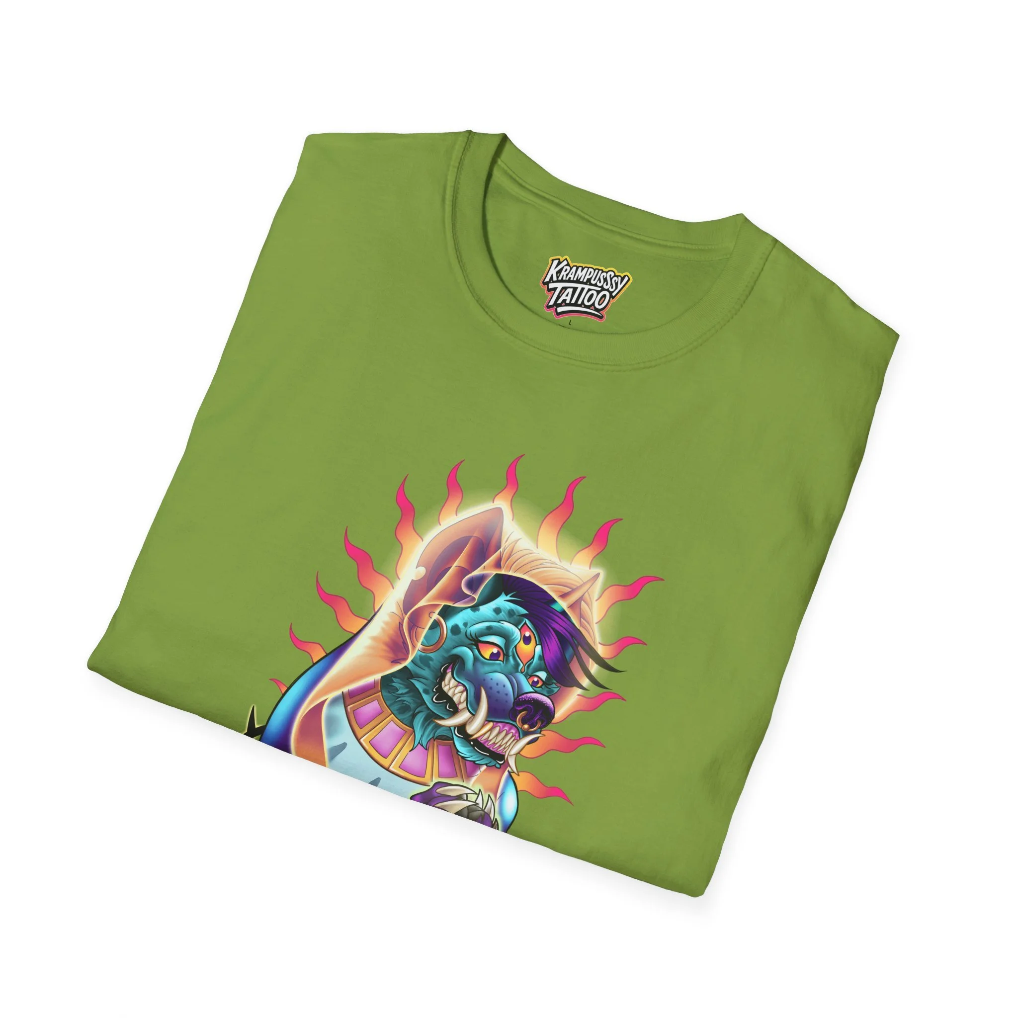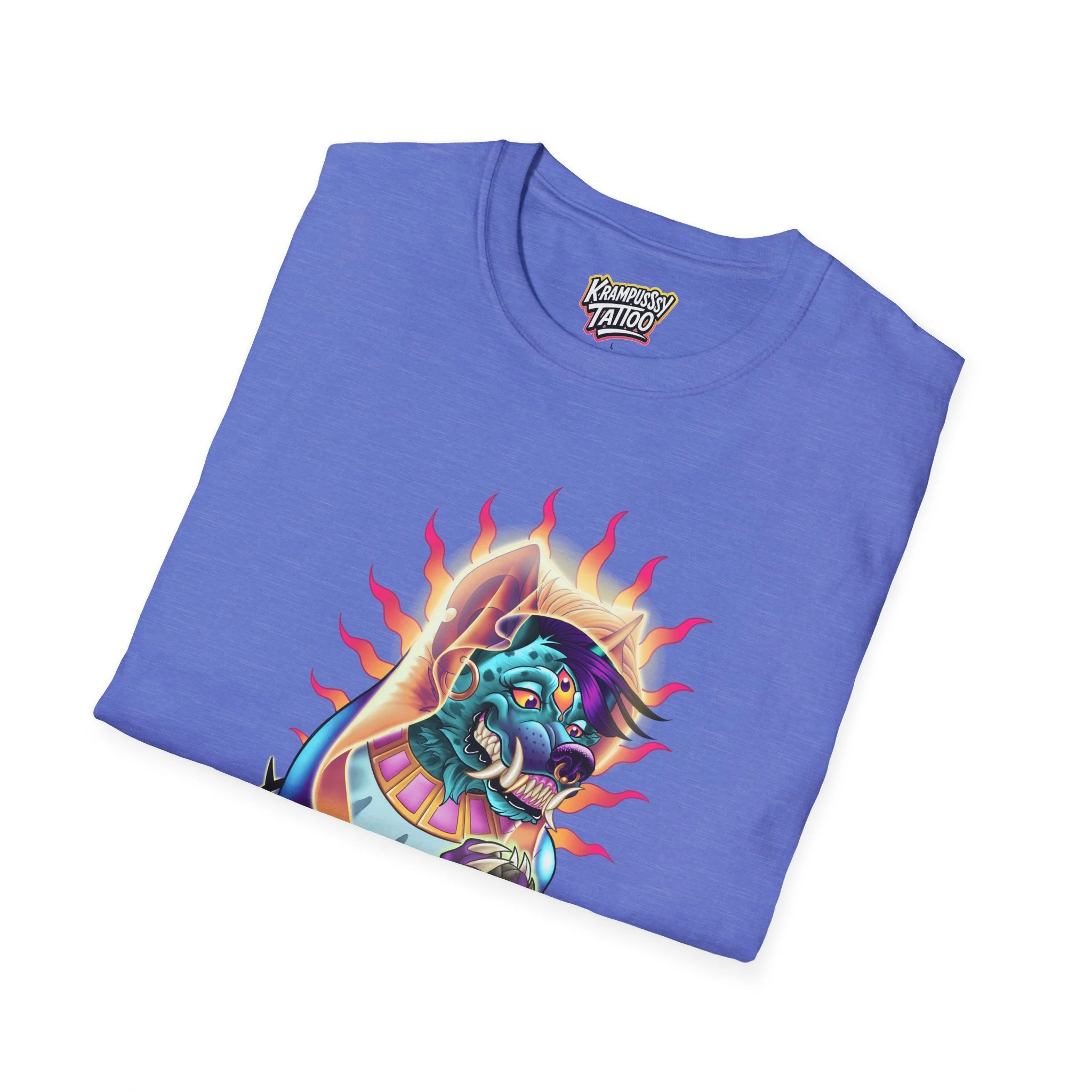 A vibrant T-shirt featuring a hyena praying design in bold, bright colors. Perfect for those looking to make a statement with their outfit. Ideal for animal lovers and those who appreciate unique and eye-catching designs. Suitable for casual wear, as well as special occasions and events.