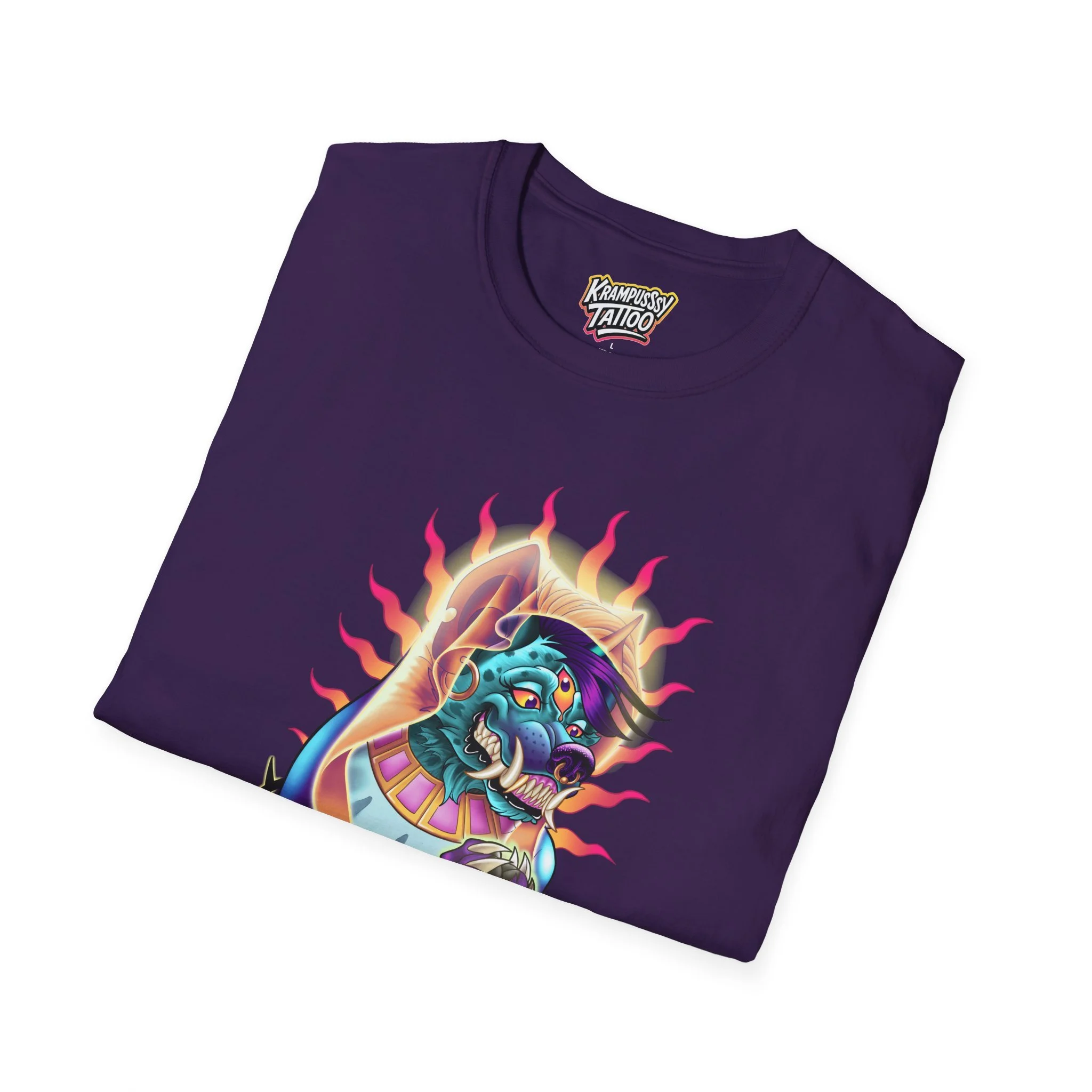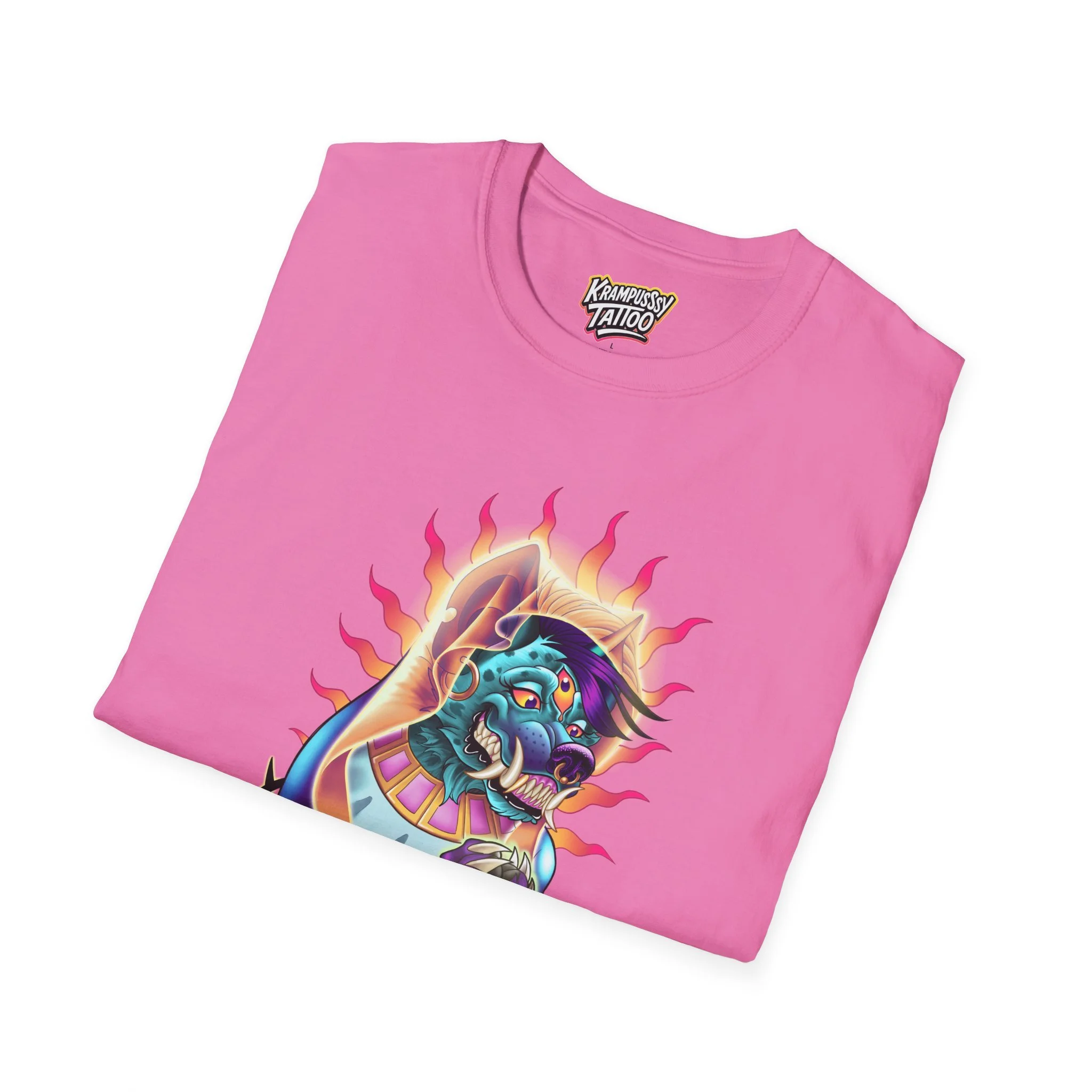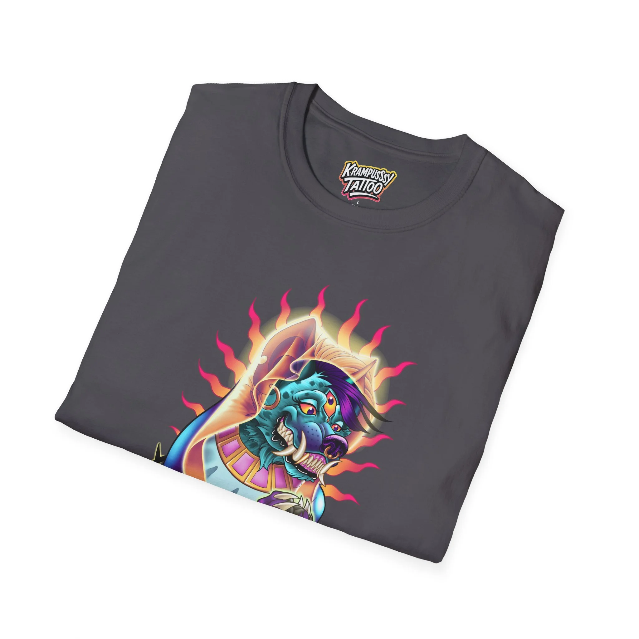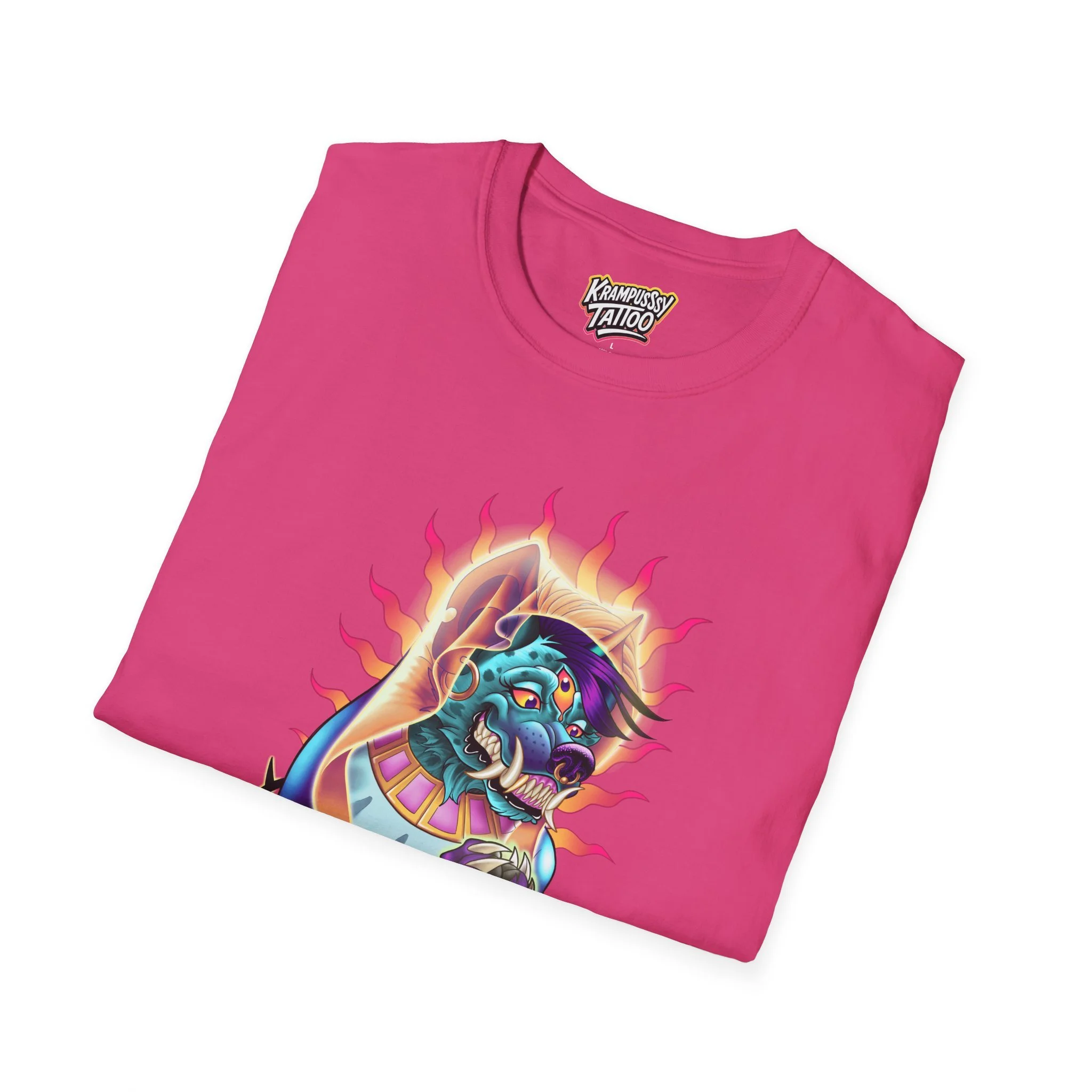A vibrant T-shirt featuring a hyena praying design in bold, bright colors. Perfect for those looking to make a statement with their outfit. Ideal for animal lovers and those who appreciate unique and eye-catching designs. Suitable for casual wear, as well as special occasions and events.
