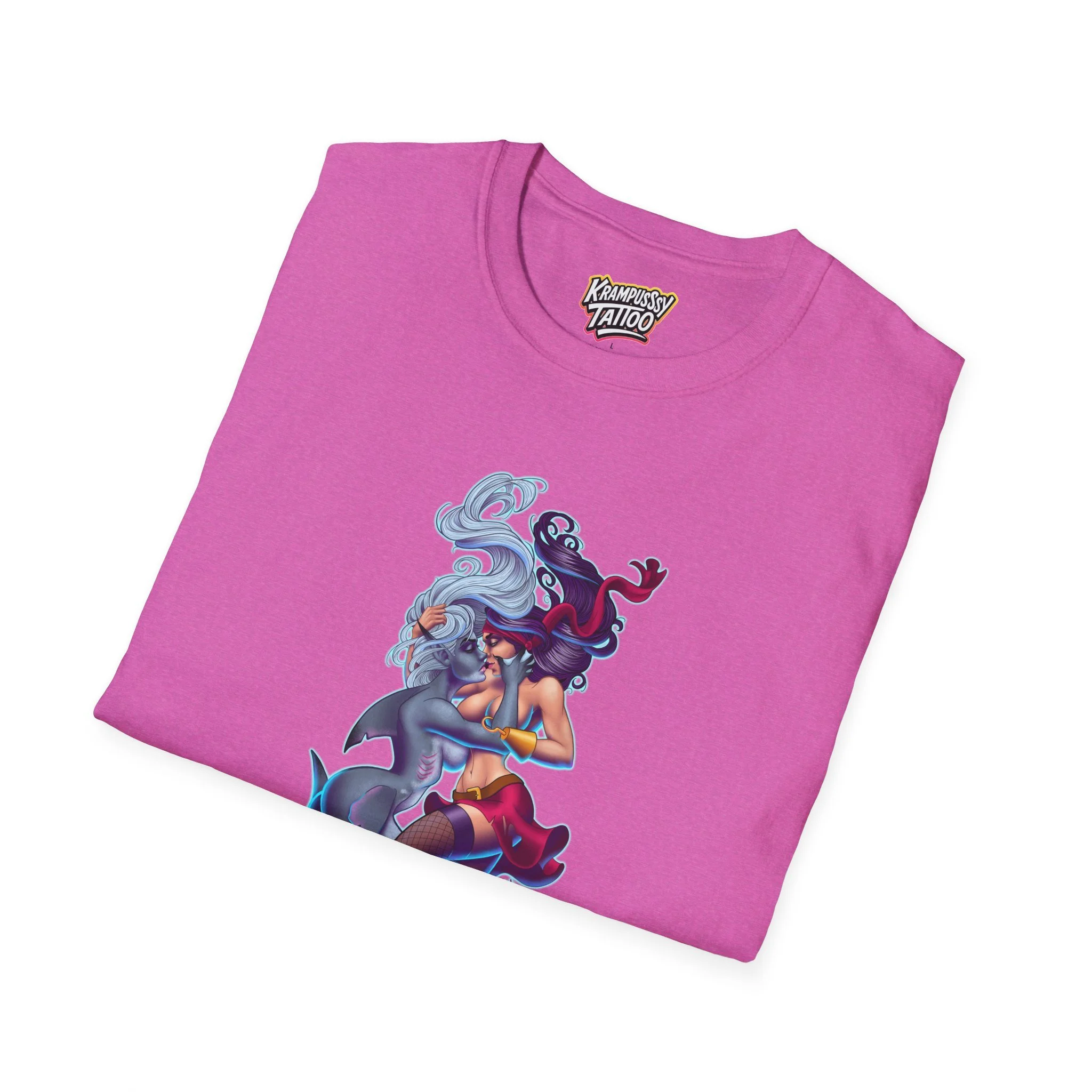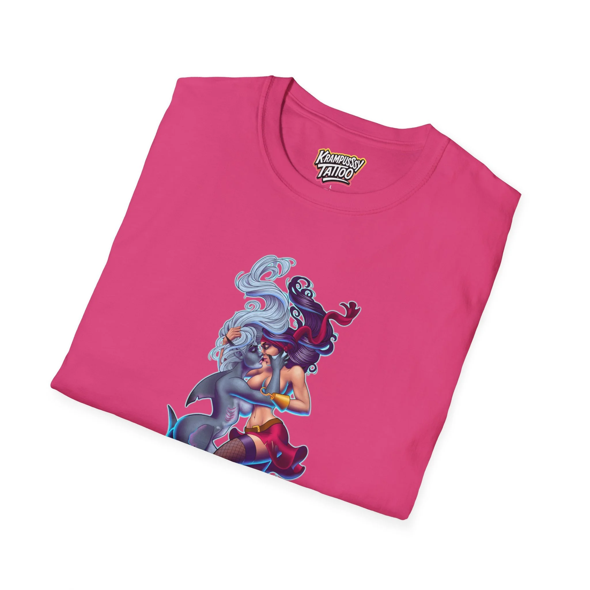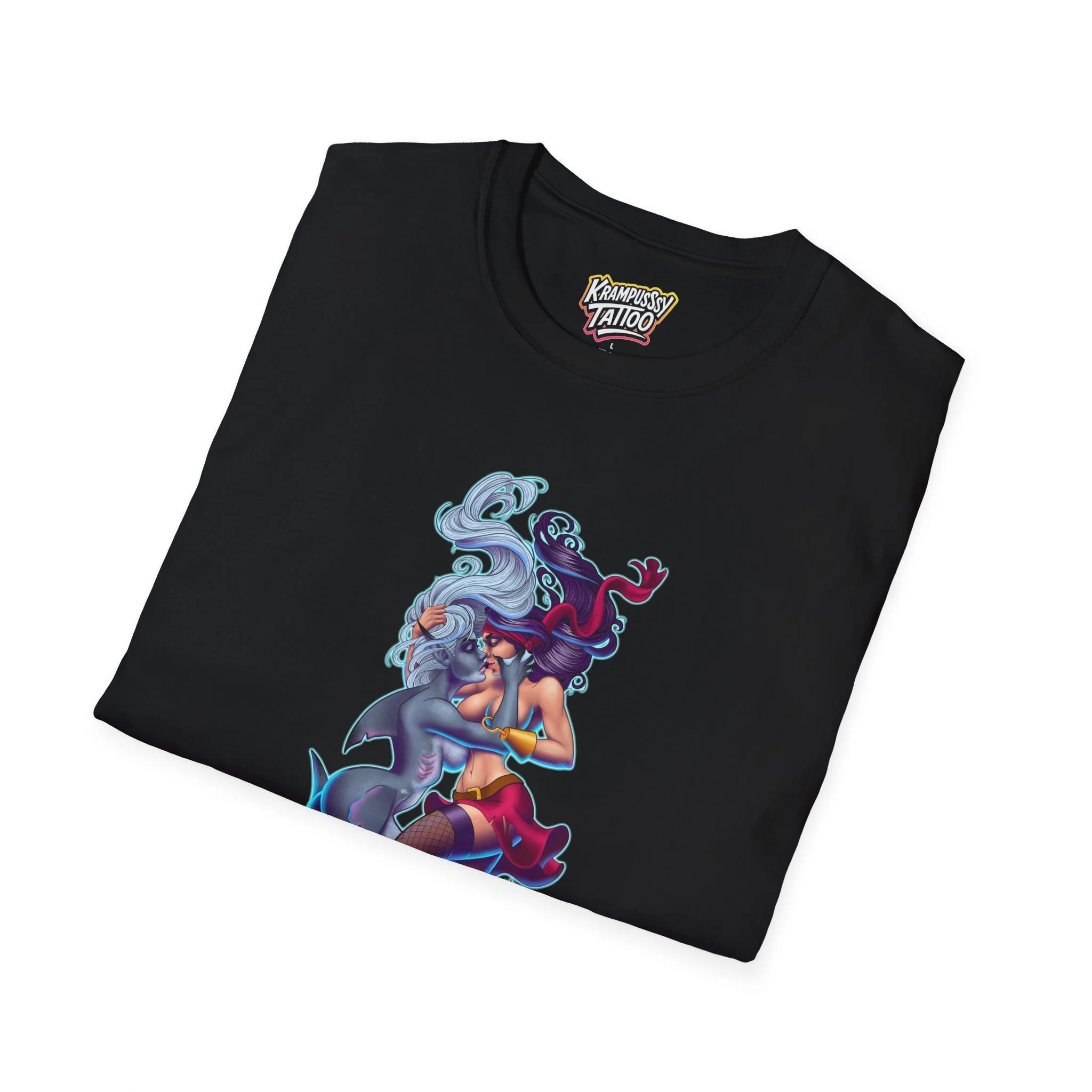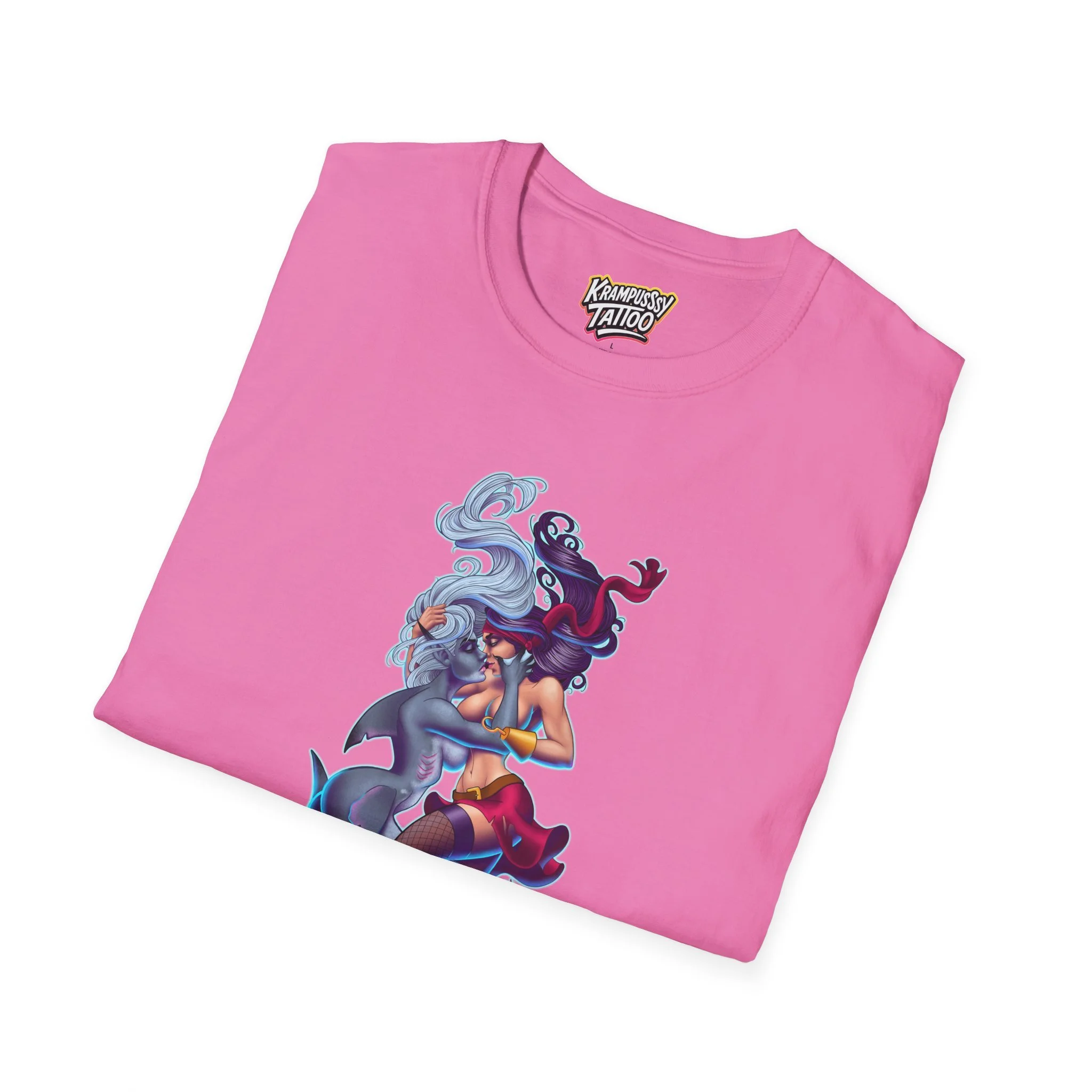 A soft and comfortable T-Shirt featuring a design of a female mermaid and a female pirate kissing, making it LGBTQ friendly. This T-Shirt is perfect for those who support LGBTQ rights and want to showcase their love for diversity and inclusivity. Ideal for Lesbians, Pride Month celebrations, LGBTQ events, or simply to spread a message of love and acceptance.