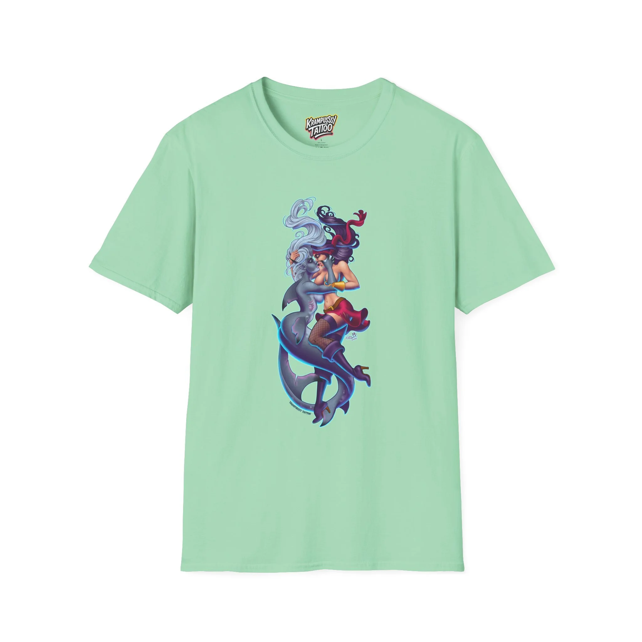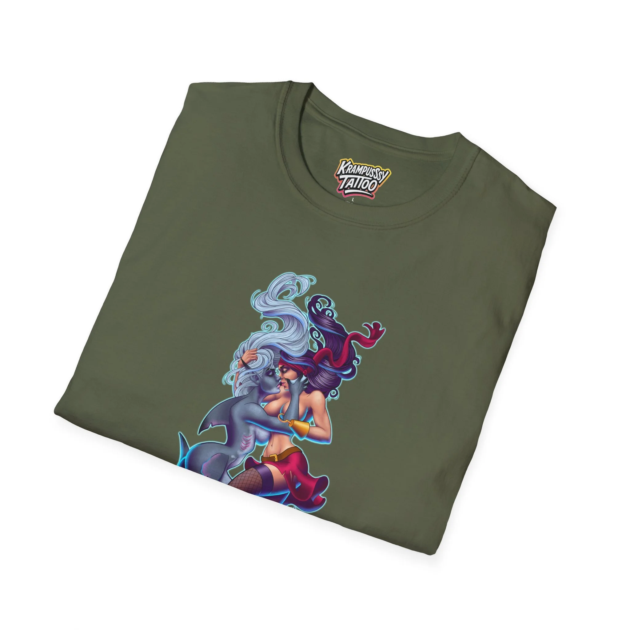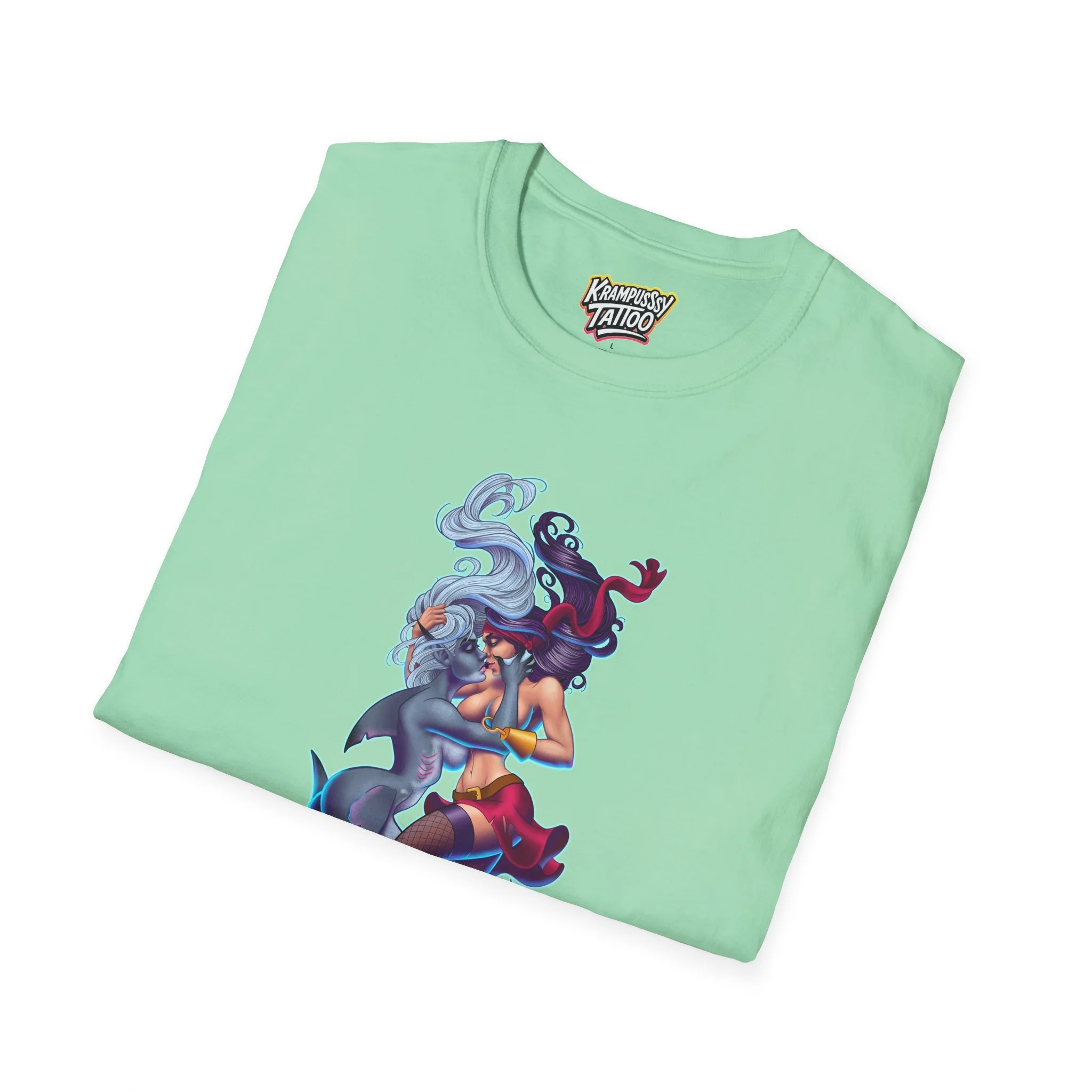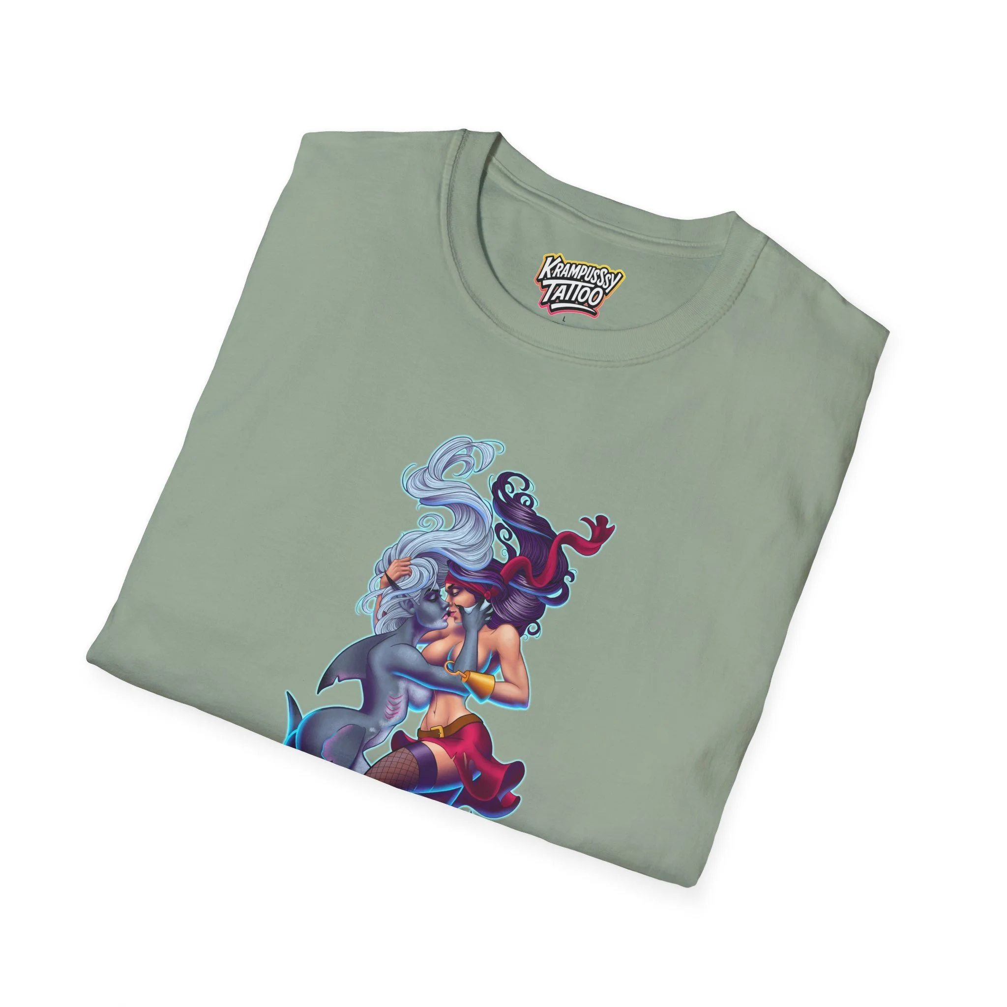 A soft and comfortable T-Shirt featuring a design of a female mermaid and a female pirate kissing, making it LGBTQ friendly. This T-Shirt is perfect for those who support LGBTQ rights and want to showcase their love for diversity and inclusivity. Ideal for Lesbians, Pride Month celebrations, LGBTQ events, or simply to spread a message of love and acceptance.