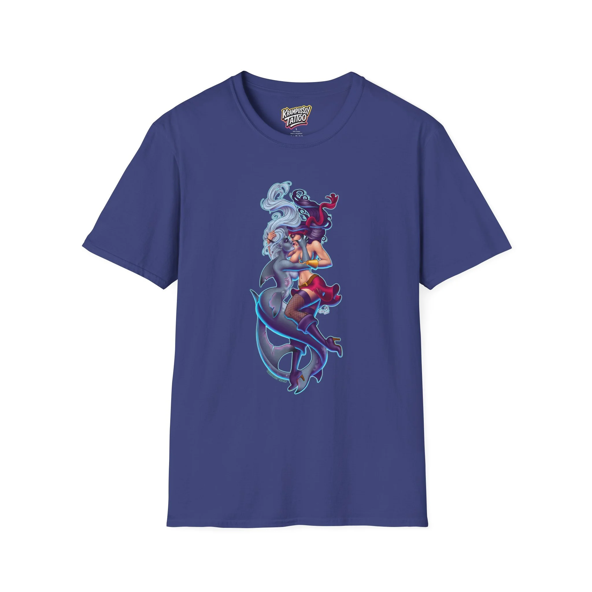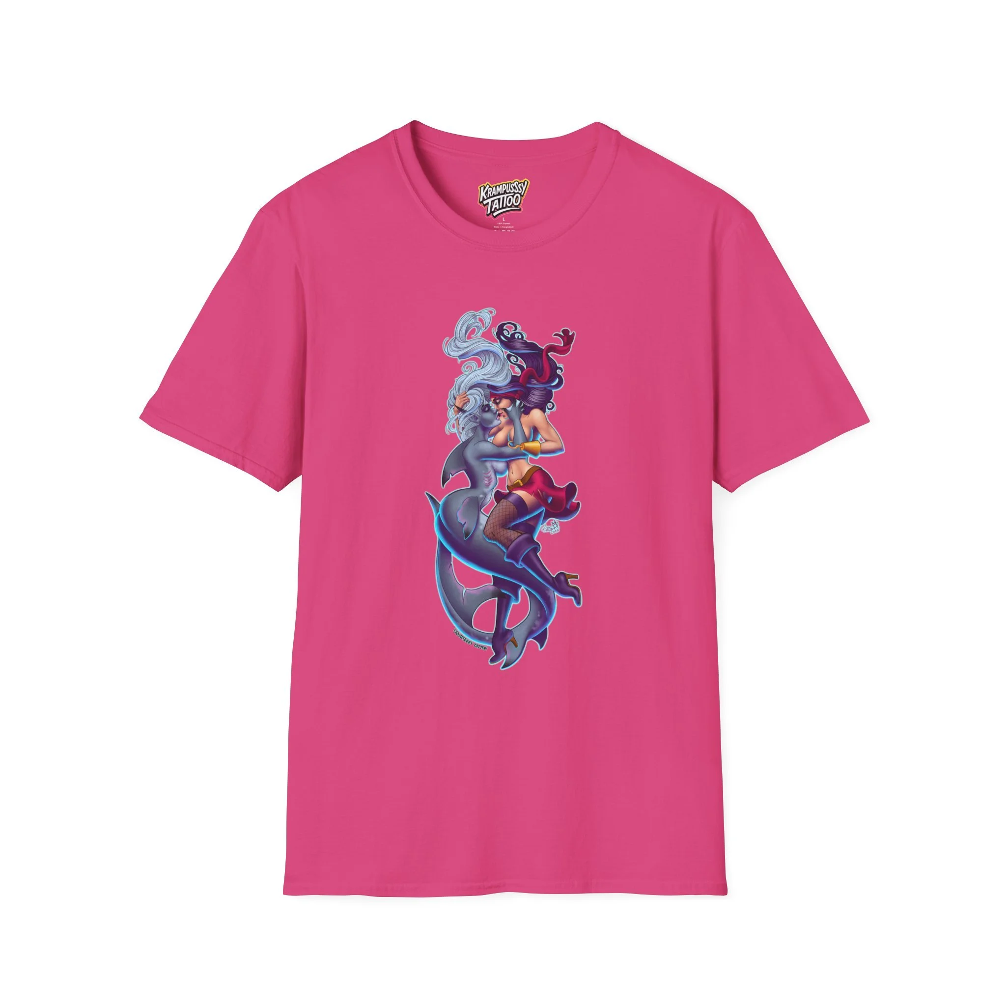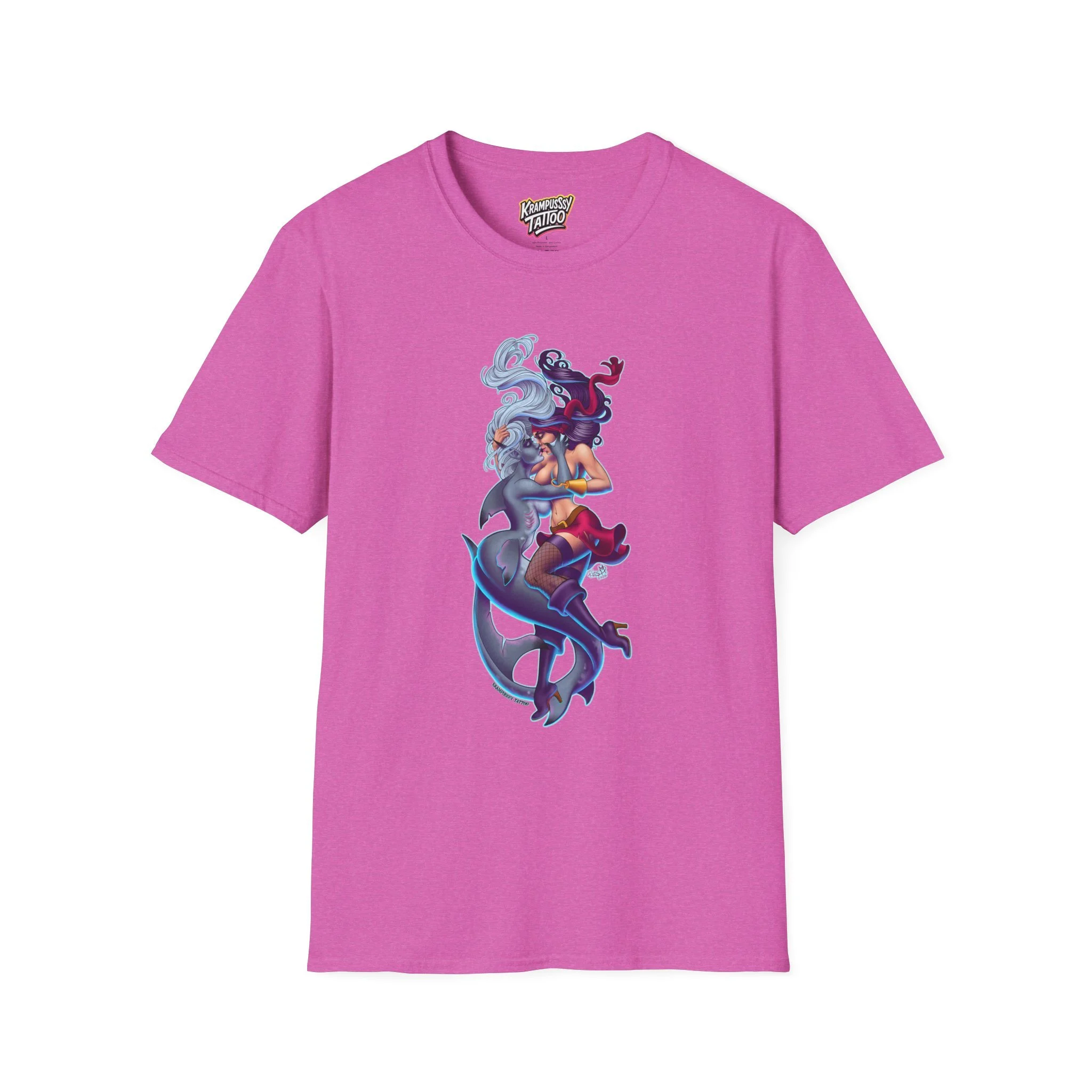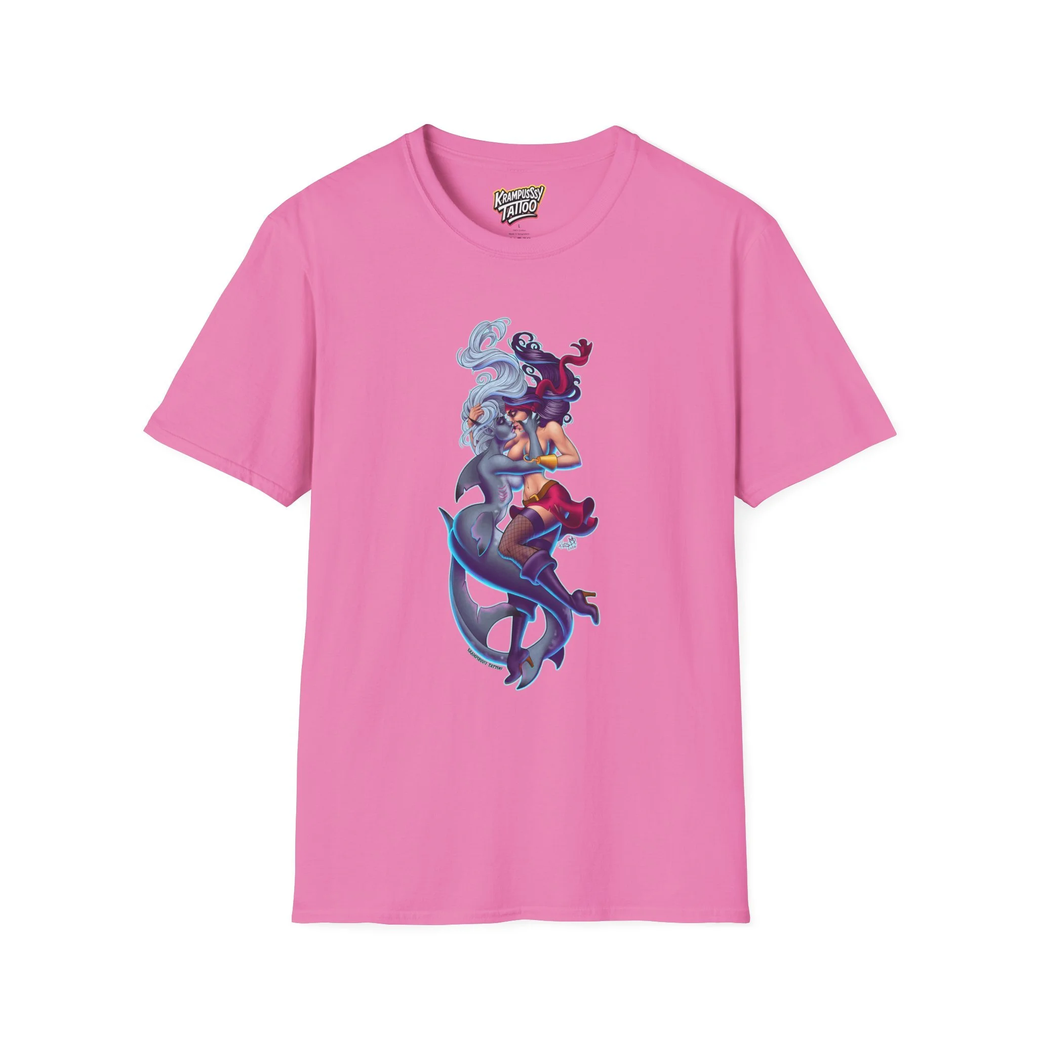 A soft and comfortable T-Shirt featuring a design of a female mermaid and a female pirate kissing, making it LGBTQ friendly. This T-Shirt is perfect for those who support LGBTQ rights and want to showcase their love for diversity and inclusivity. Ideal for Lesbians, Pride Month celebrations, LGBTQ events, or simply to spread a message of love and acceptance.