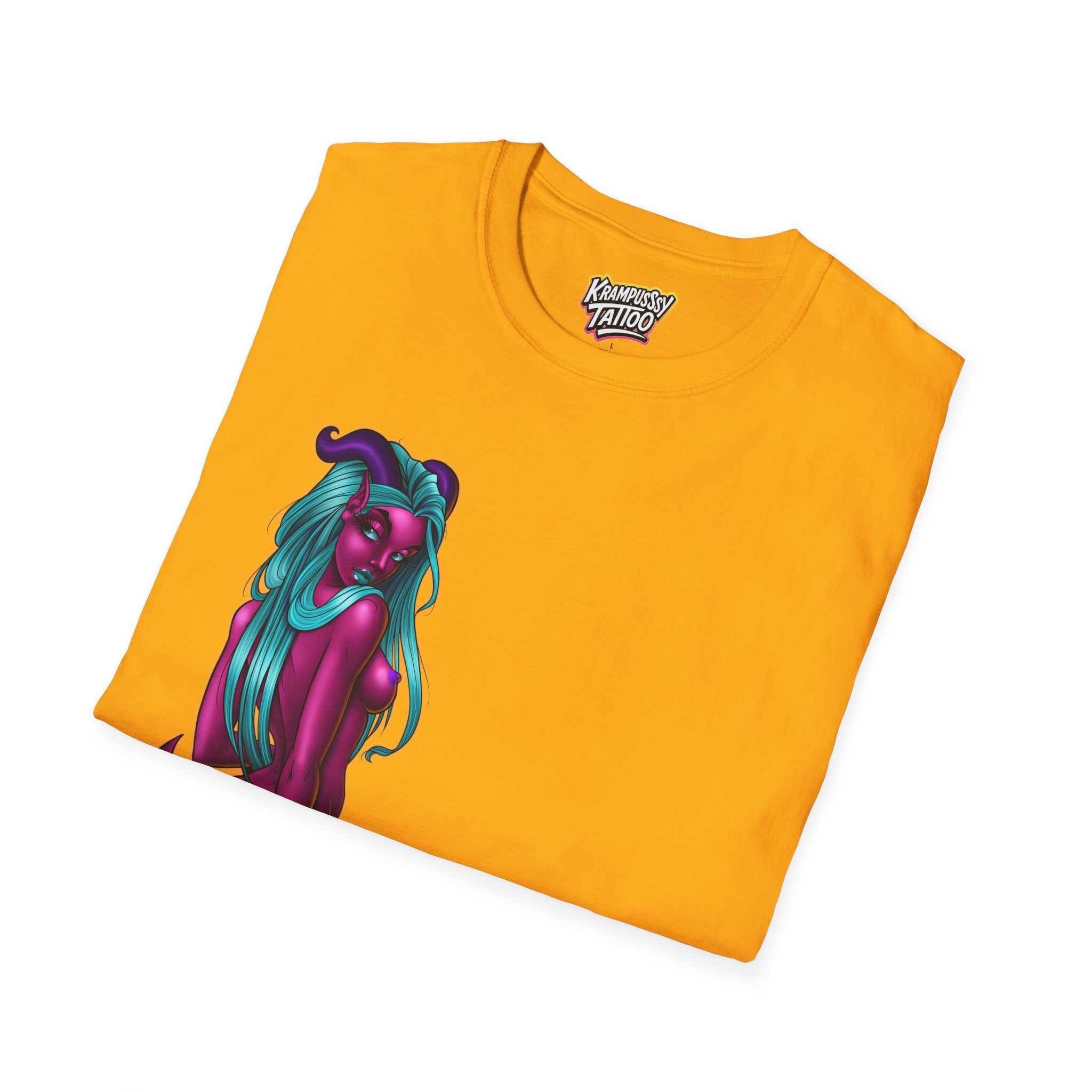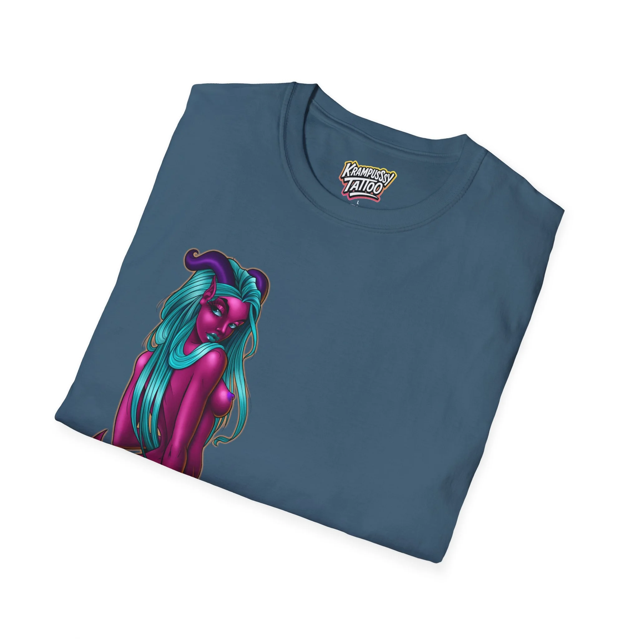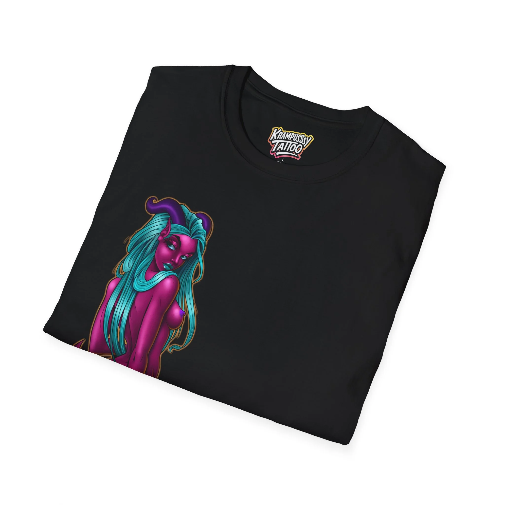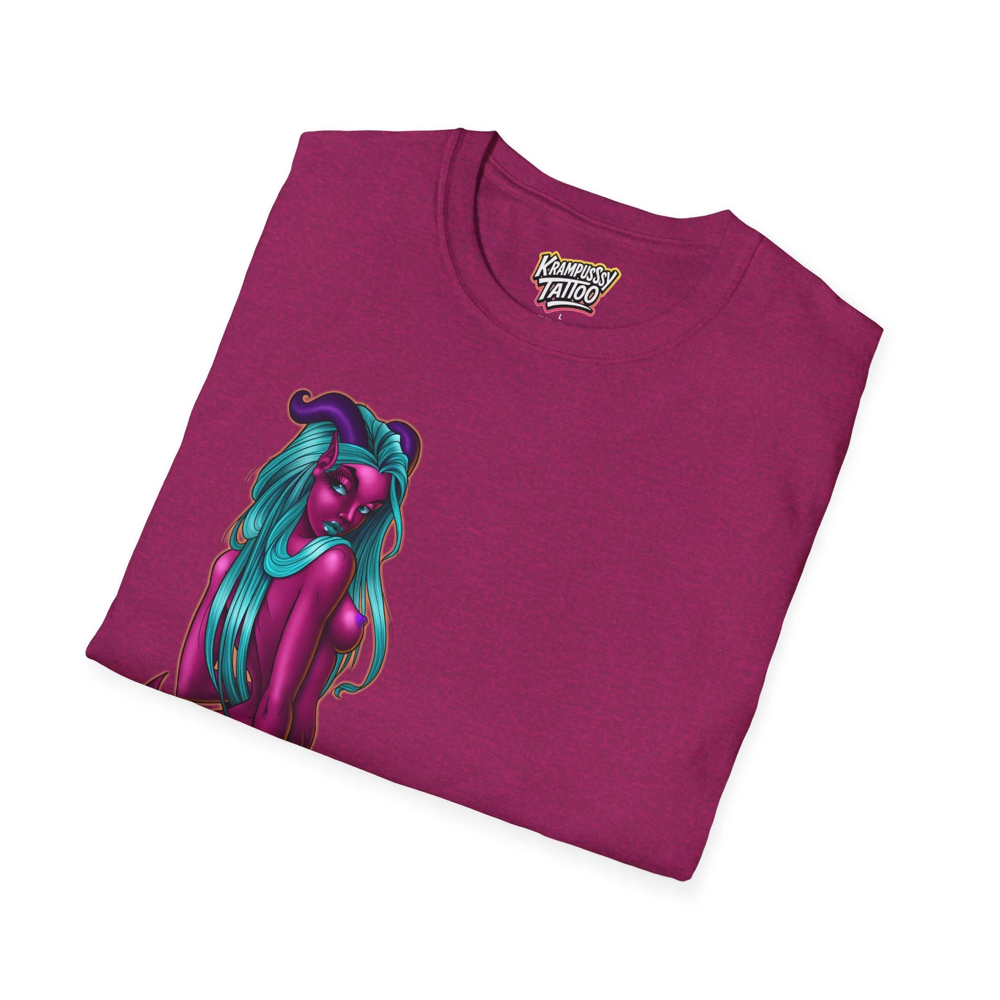 A sexy succubus pinup design on a unisex softstyle T-shirt. This shirt is made from durable and smooth fabric, perfect for printing and offers a comfortable fit. Suitable for adults looking for a unique and edgy addition to their wardrobe. Perfect for Halloween celebrations and fans of dark fantasy themes.