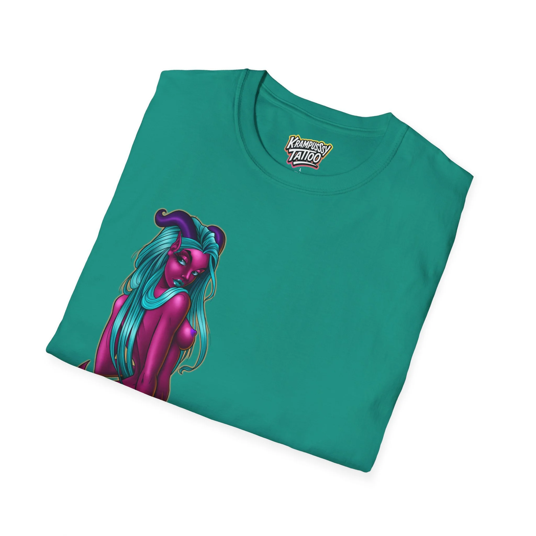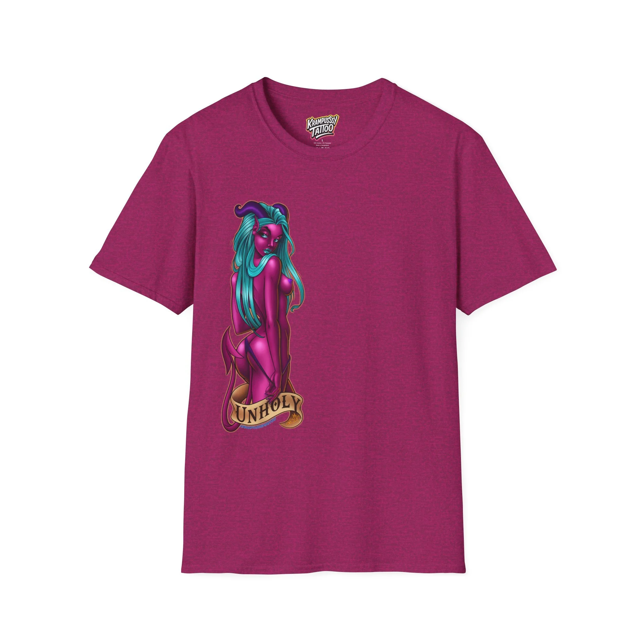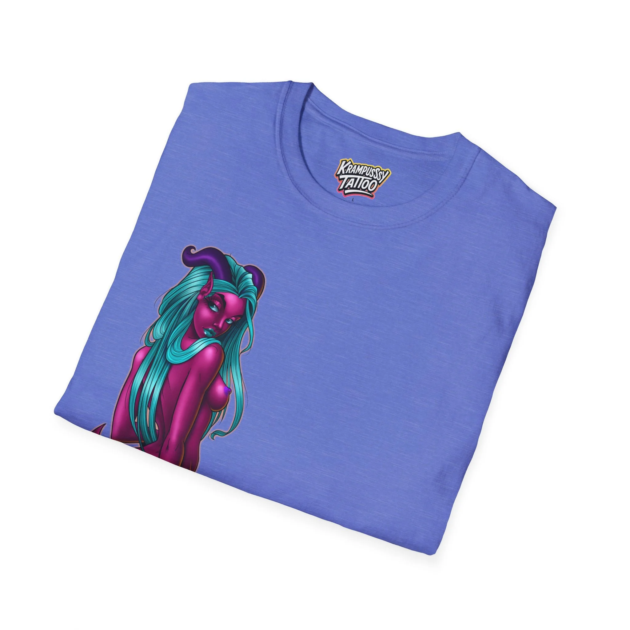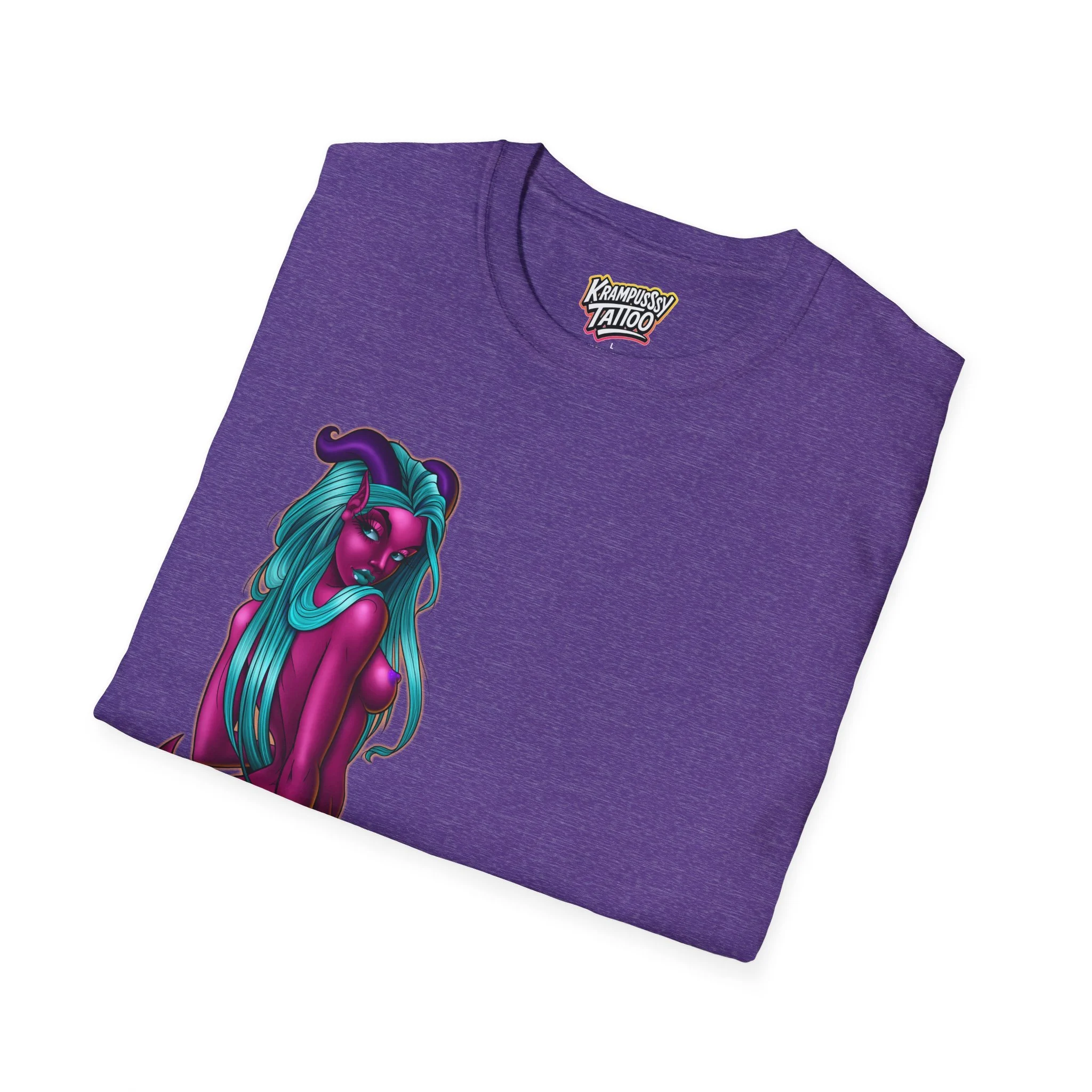 A sexy succubus pinup design on a unisex softstyle T-shirt. This shirt is made from durable and smooth fabric, perfect for printing and offers a comfortable fit. Suitable for adults looking for a unique and edgy addition to their wardrobe. Perfect for Halloween celebrations and fans of dark fantasy themes.