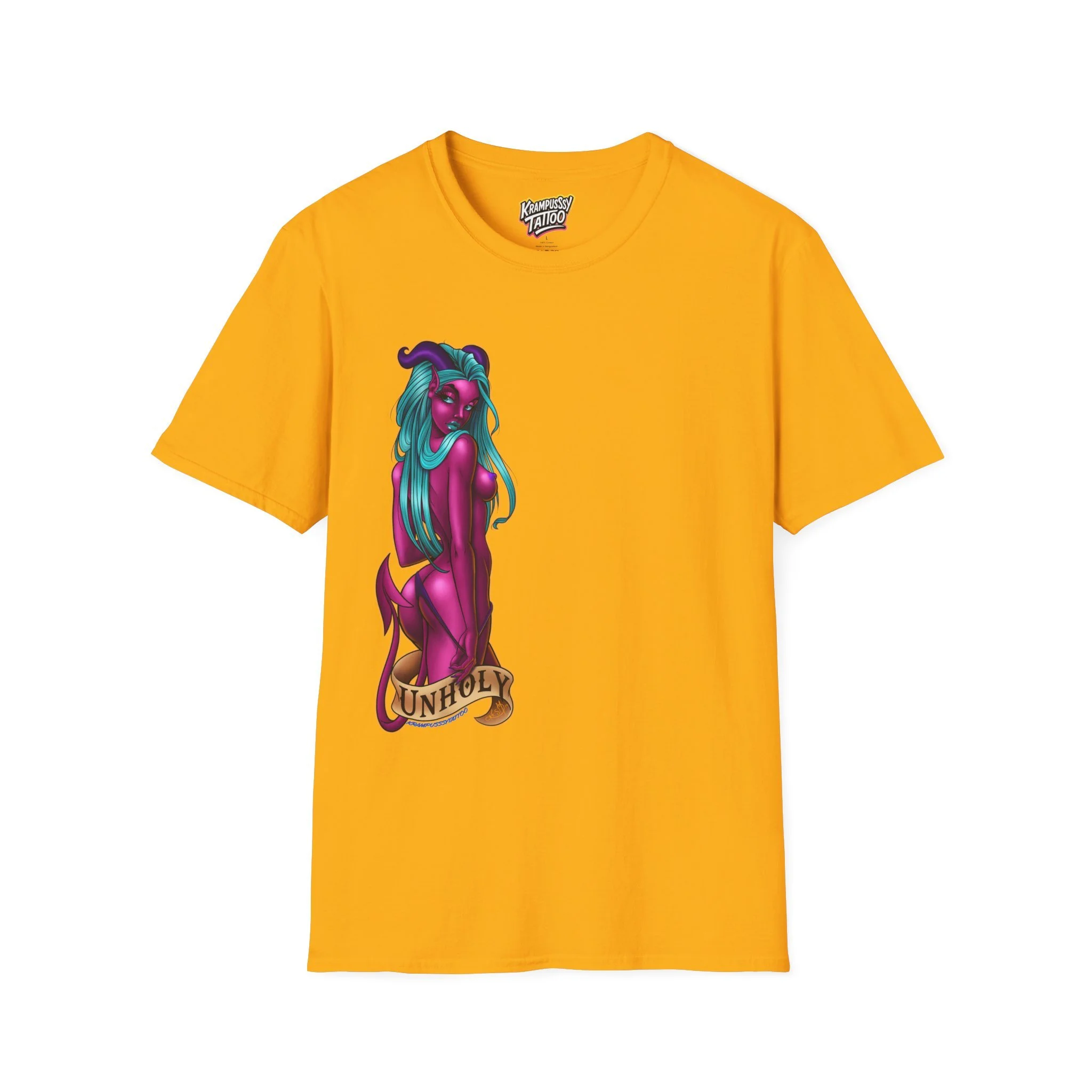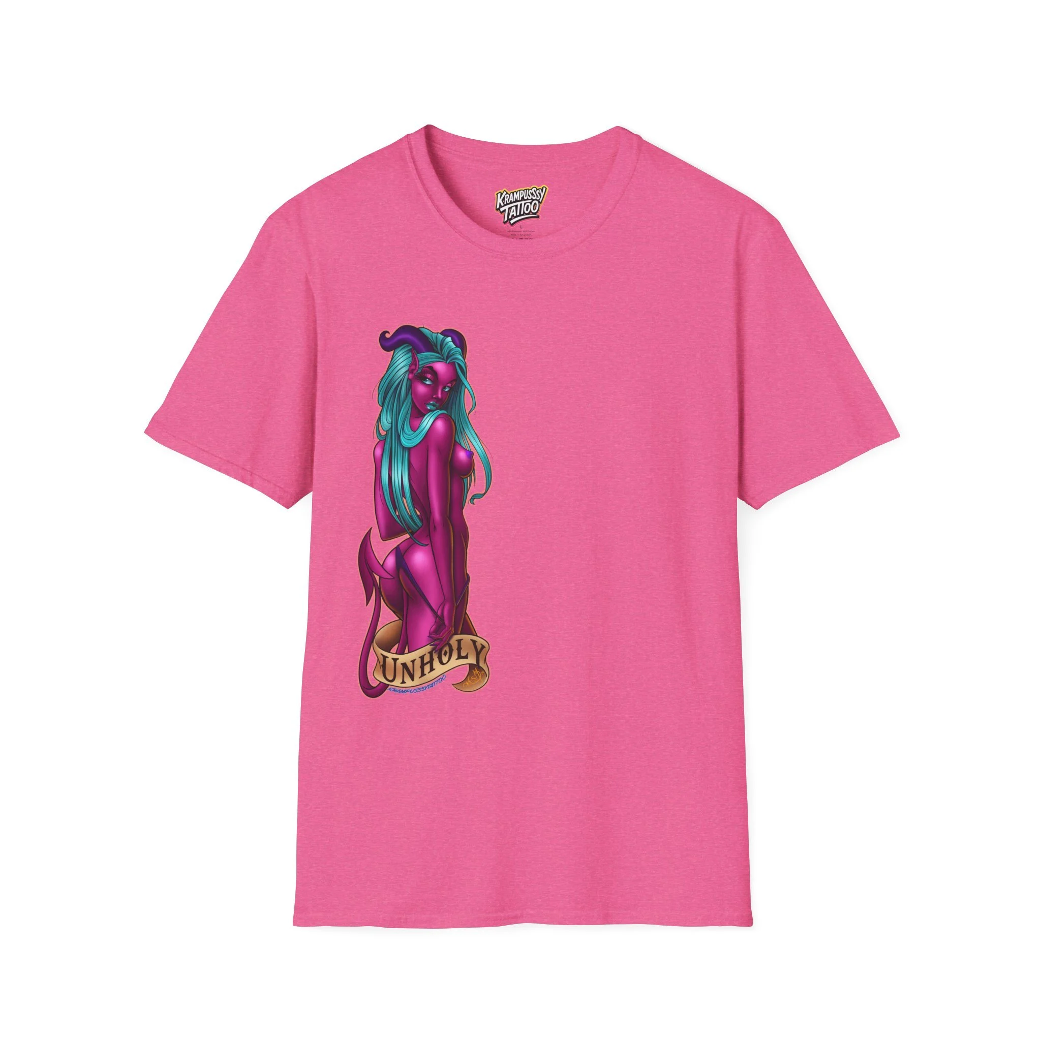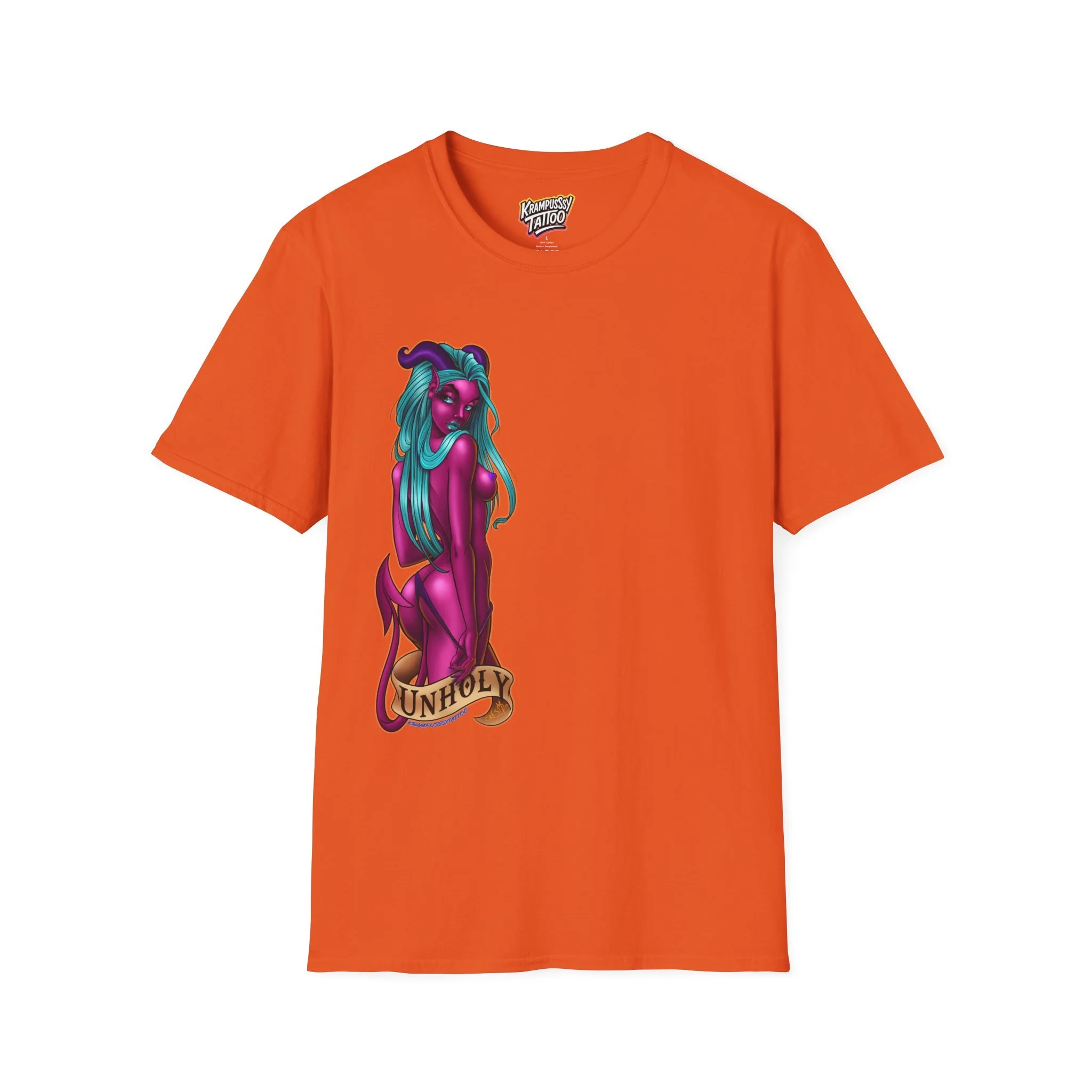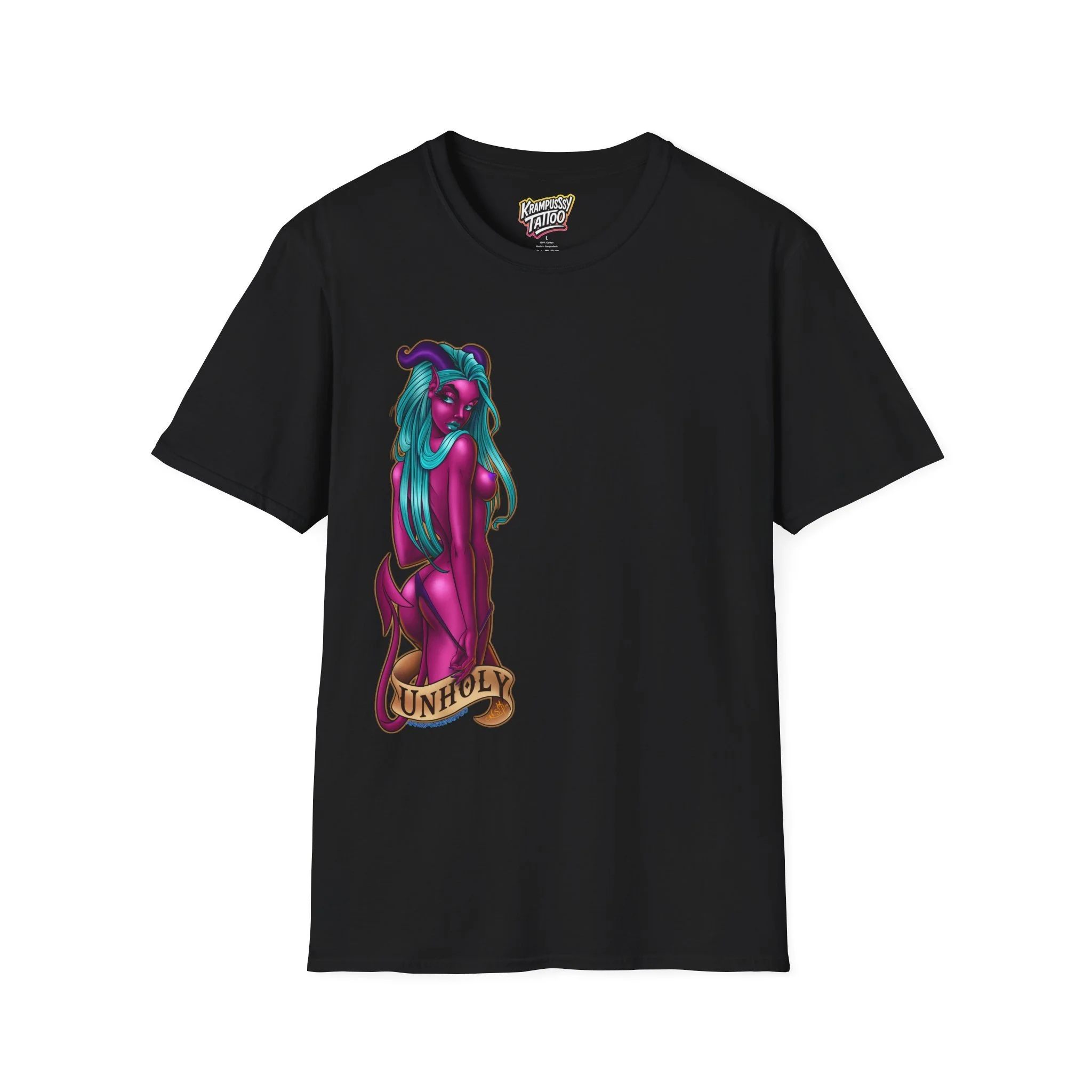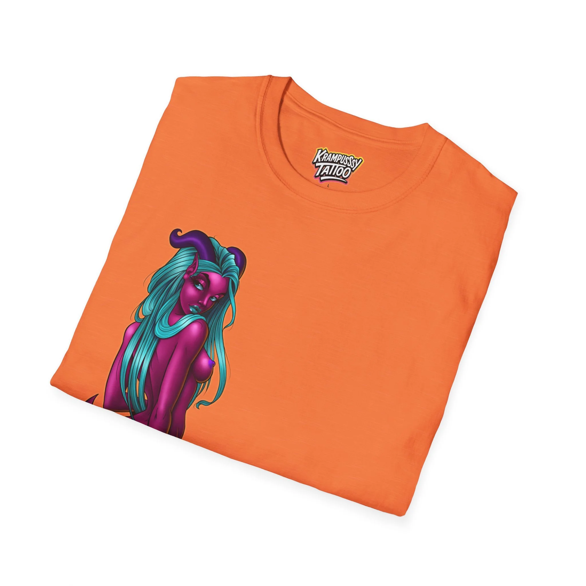 A sexy succubus pinup design on a unisex softstyle T-shirt. This shirt is made from durable and smooth fabric, perfect for printing and offers a comfortable fit. Suitable for adults looking for a unique and edgy addition to their wardrobe. Perfect for Halloween celebrations and fans of dark fantasy themes.