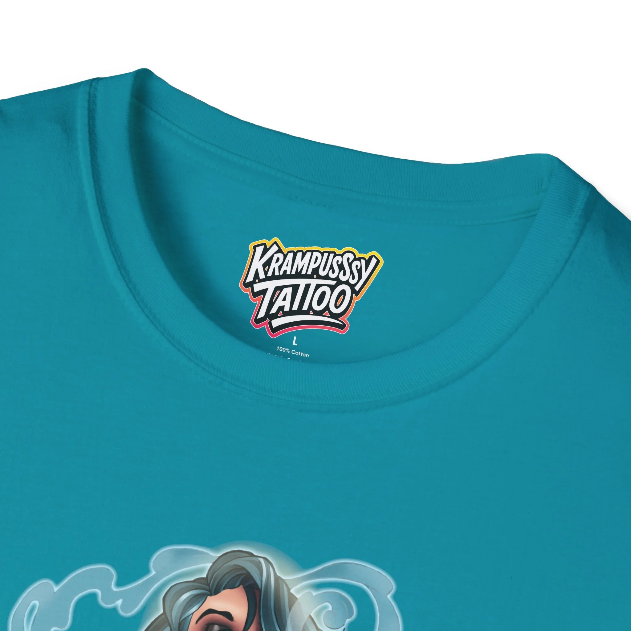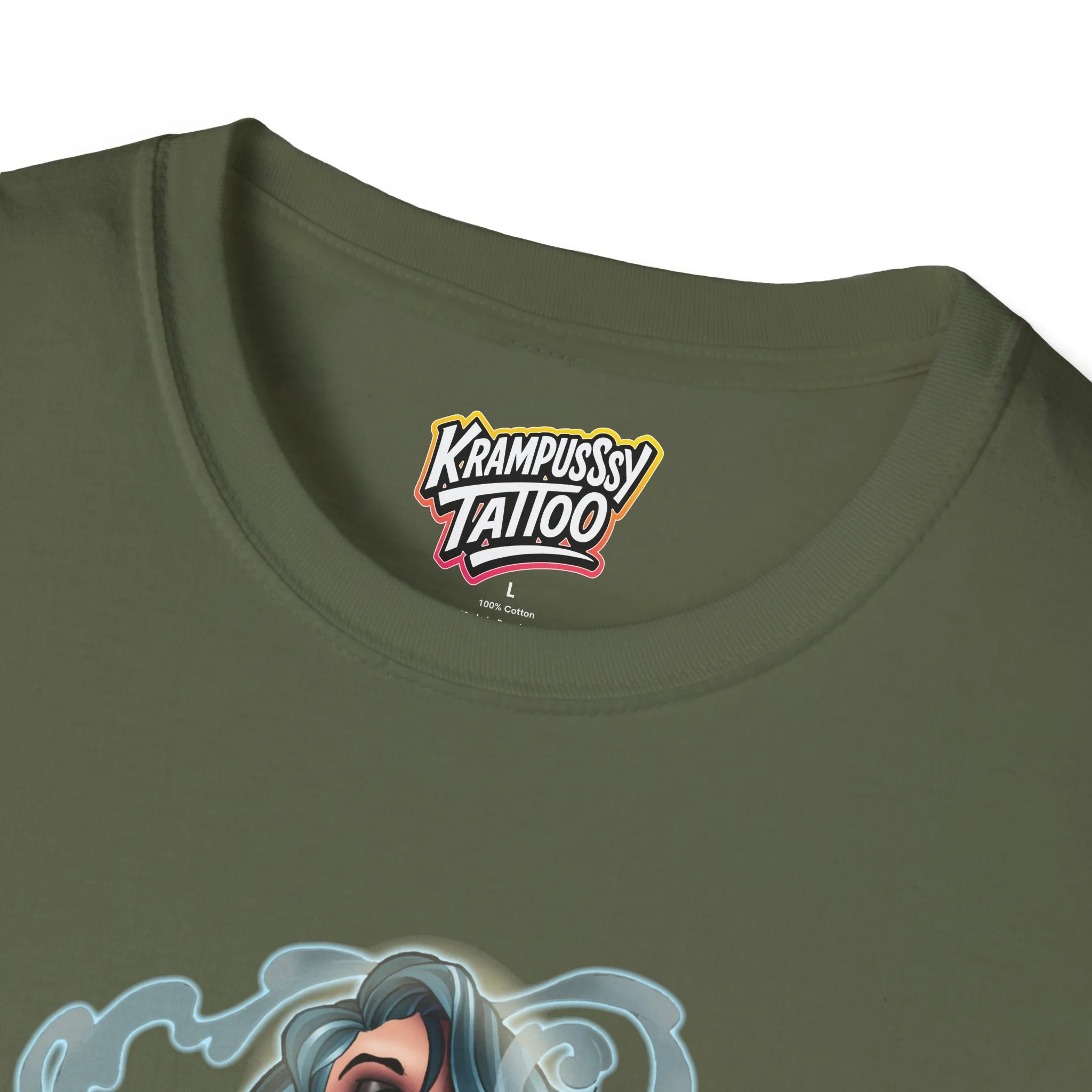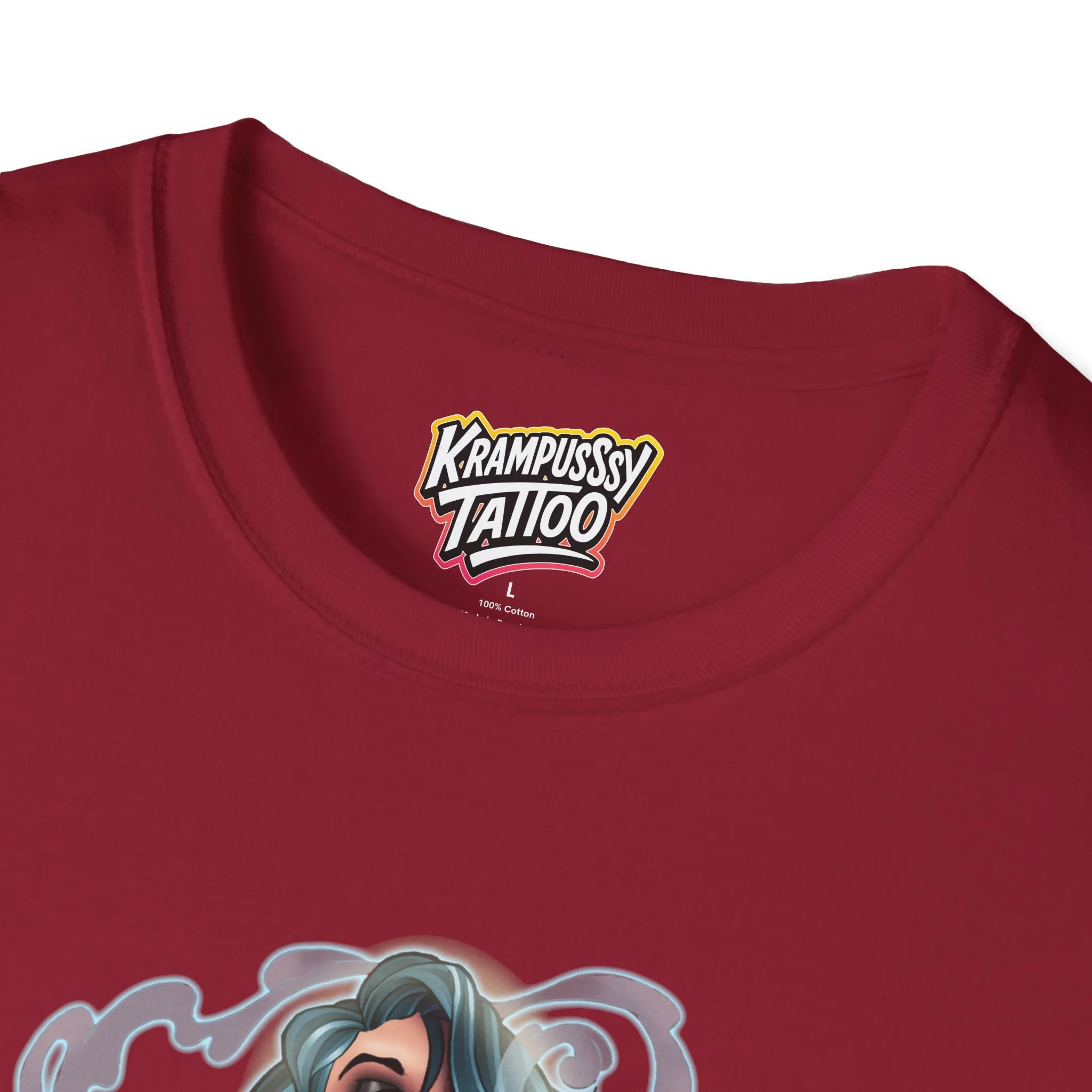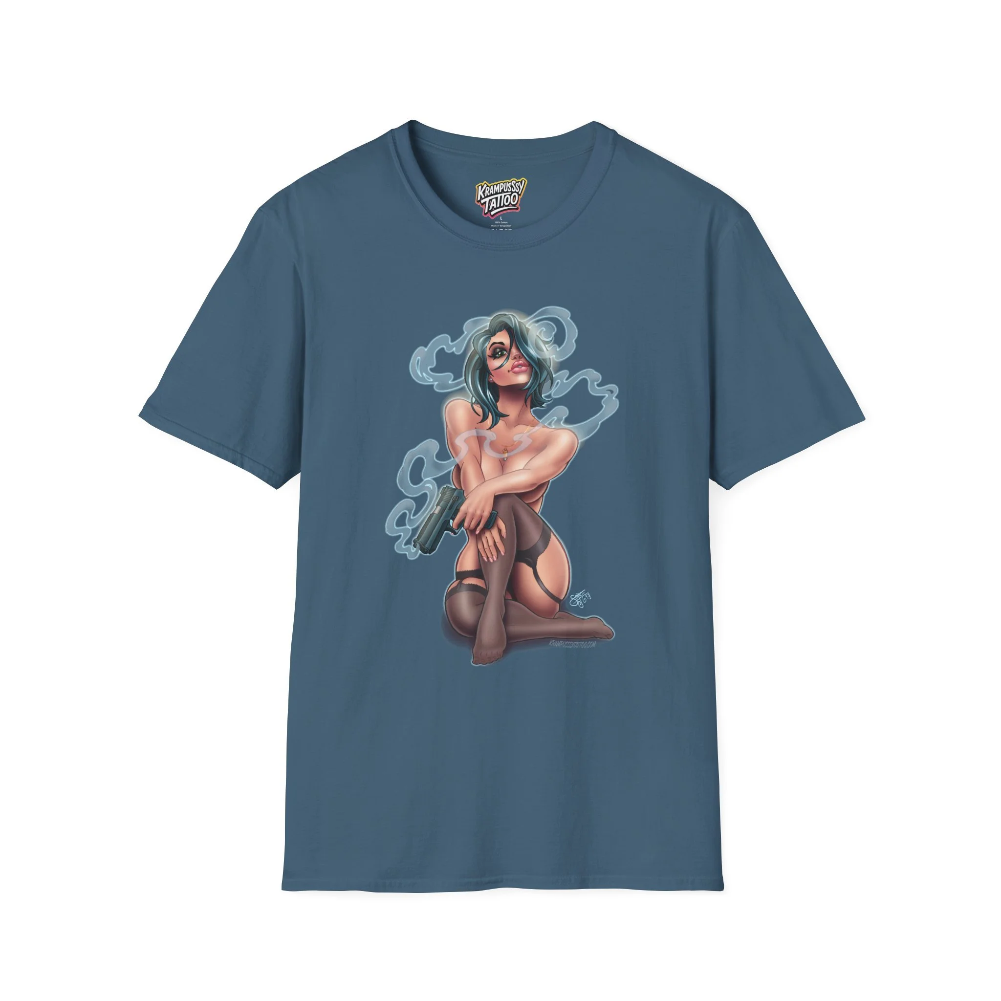 A unique T-Shirt featuring a beautiful brunette femme fatale, holding a smoking 9MM. This T-Shirt exudes a mysterious and edgy vibe, perfect for those who love a touch of drama in their style. Ideal for individuals who enjoy dark aesthetics or have a fascination with crime-related themes. This T-Shirt is great for casual wear, but also suitable for events like Halloween or themed parties.