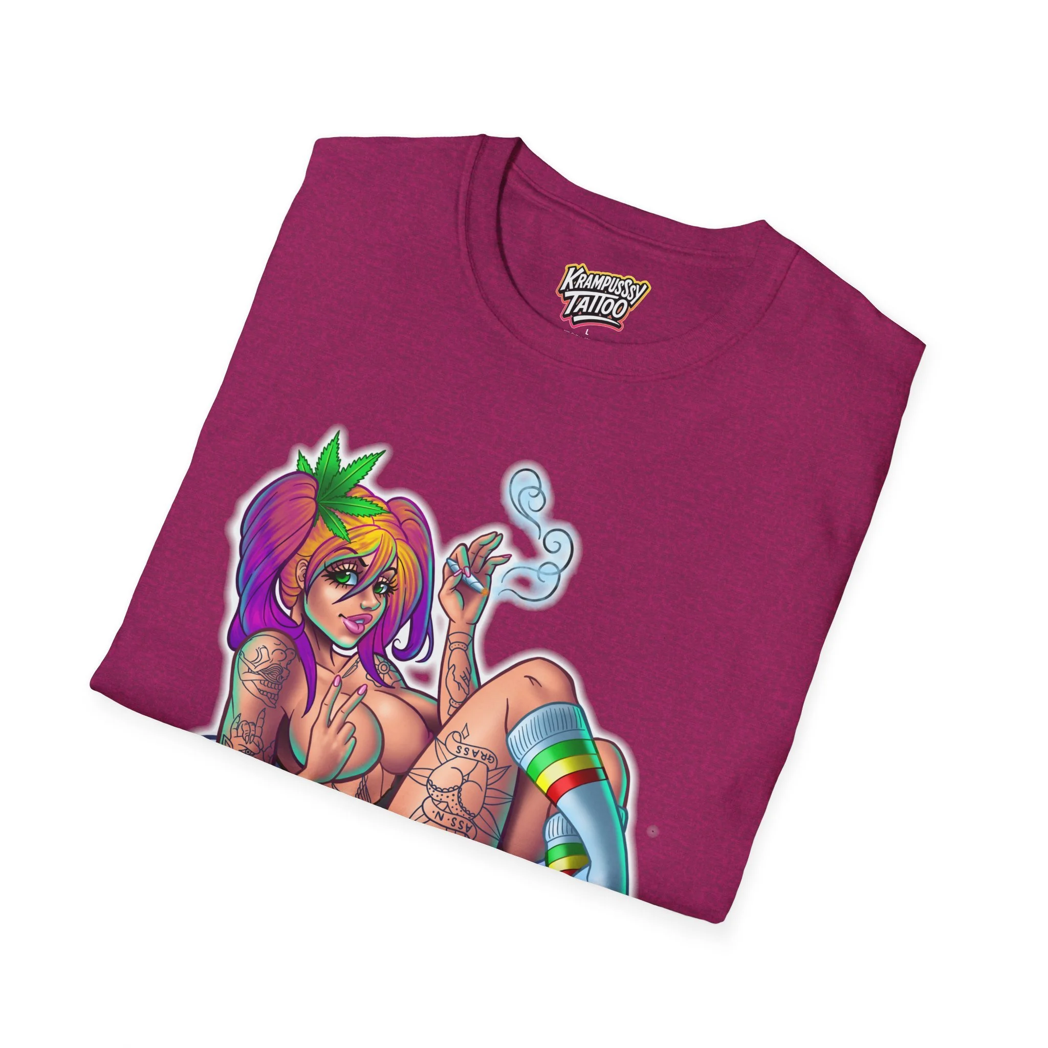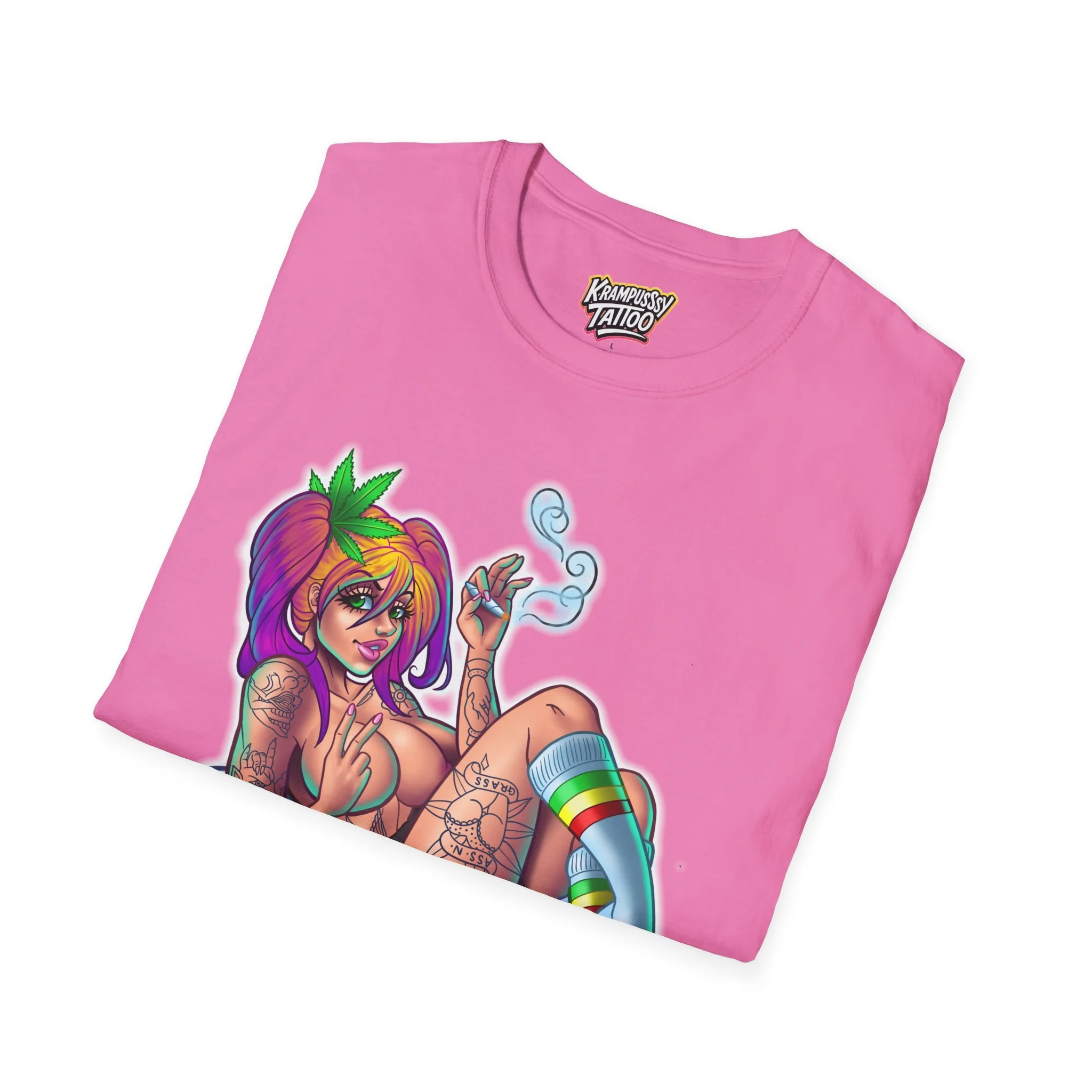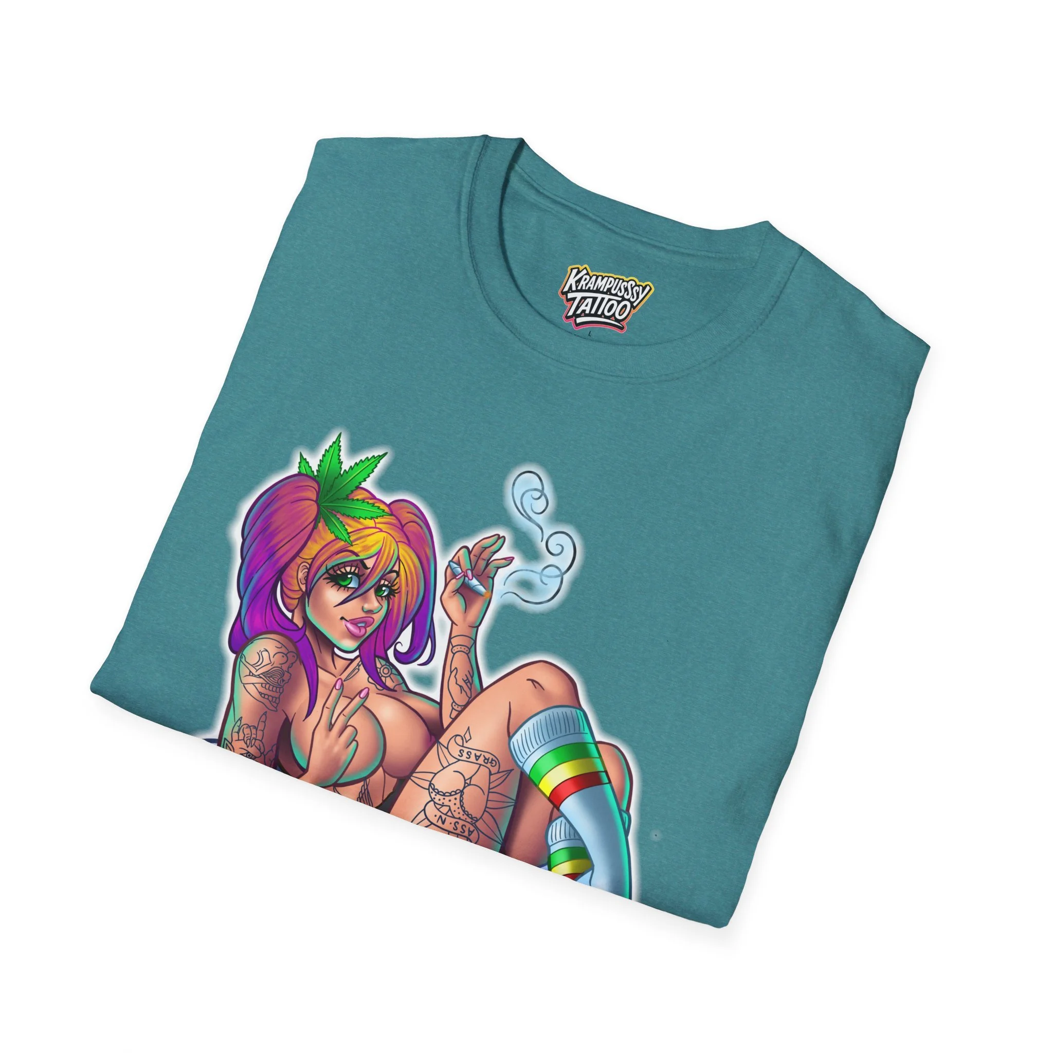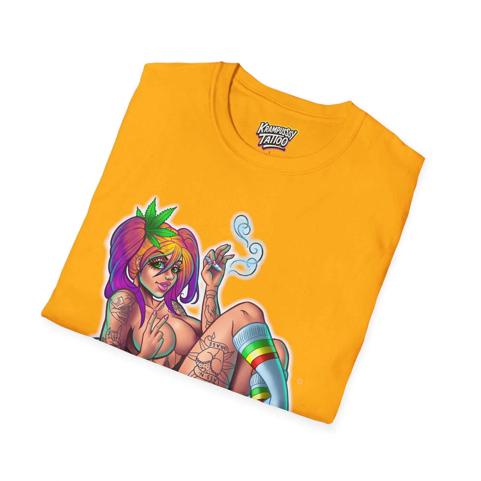 A unique and edgy T-Shirt featuring a tattooed pinup sitting in a coffee cup, smoking weed. This shirt exudes a rebellious and cool vibe, perfect for those who appreciate unconventional artwork. Ideal for adults looking to make a statement with their fashion choices, especially fitting for music festivals, art events, or casual gatherings with friends.