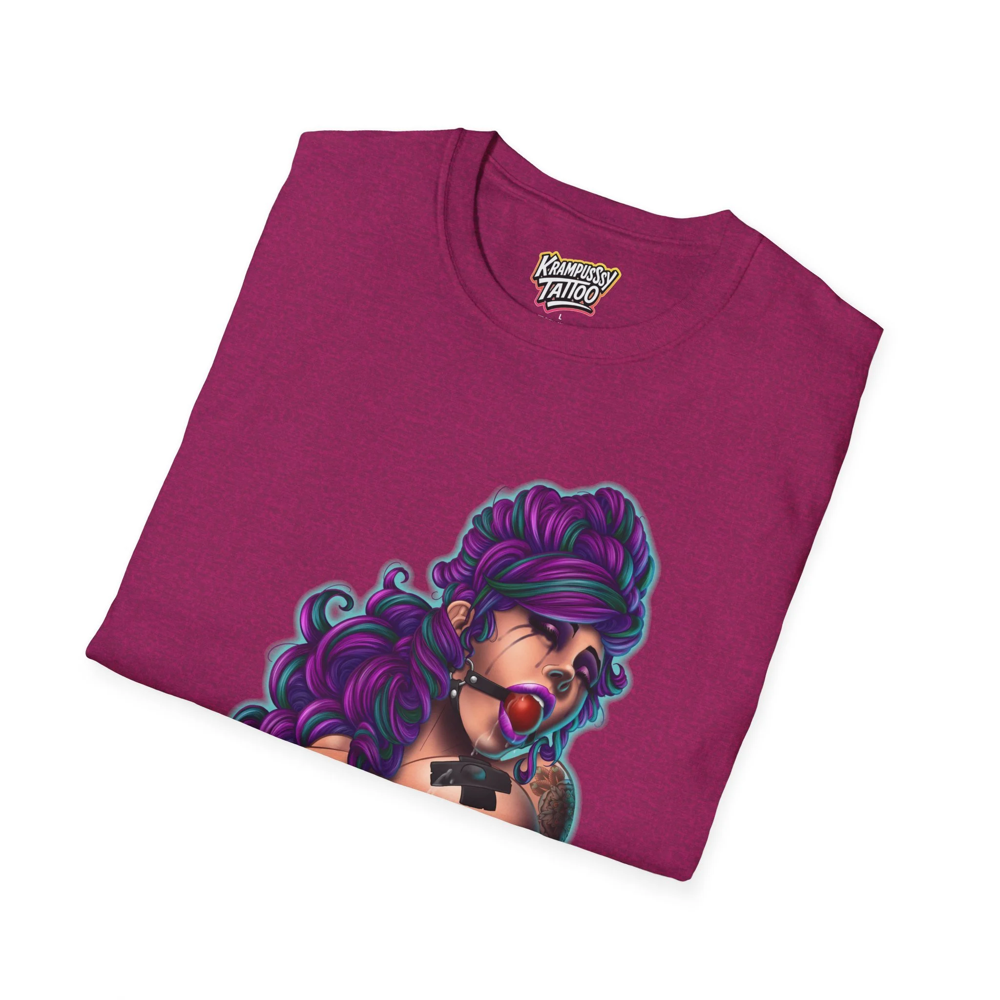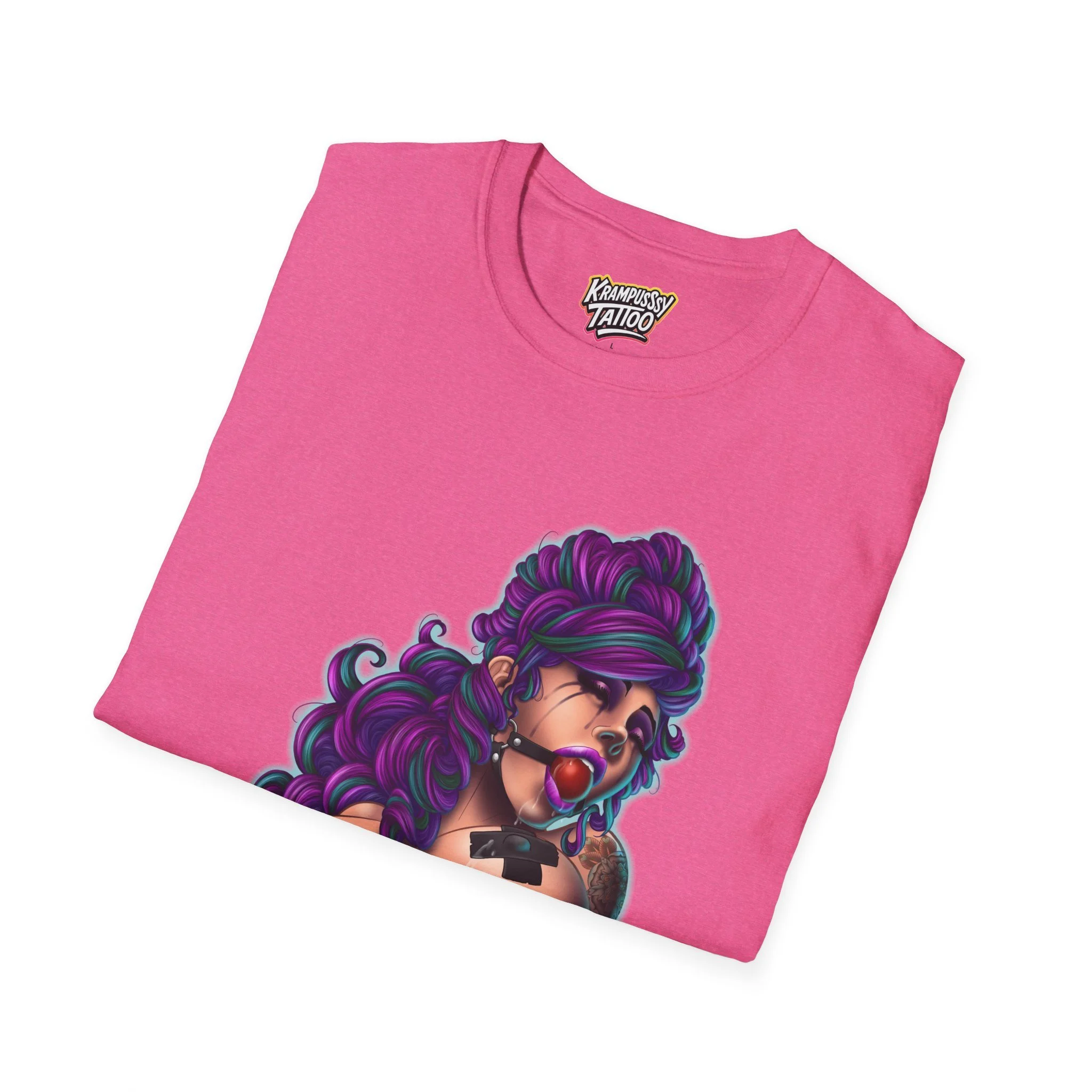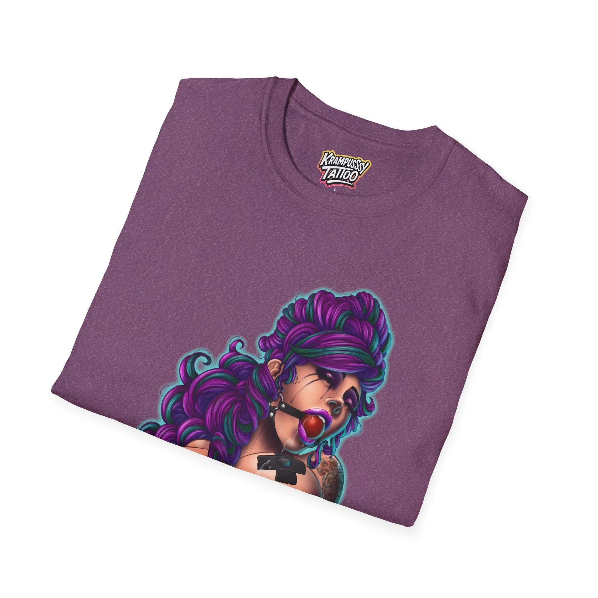 This T-Shirt features a unique design of a woman in a ball gag, adding a touch of edginess to your wardrobe. Perfect for those with a bold and daring sense of style, this T-Shirt can be worn casually or to make a statement at events and parties. Ideal for adults looking for a conversation starter or to express their individuality. Suitable for occasions like Halloween, music concerts, and themed parties.