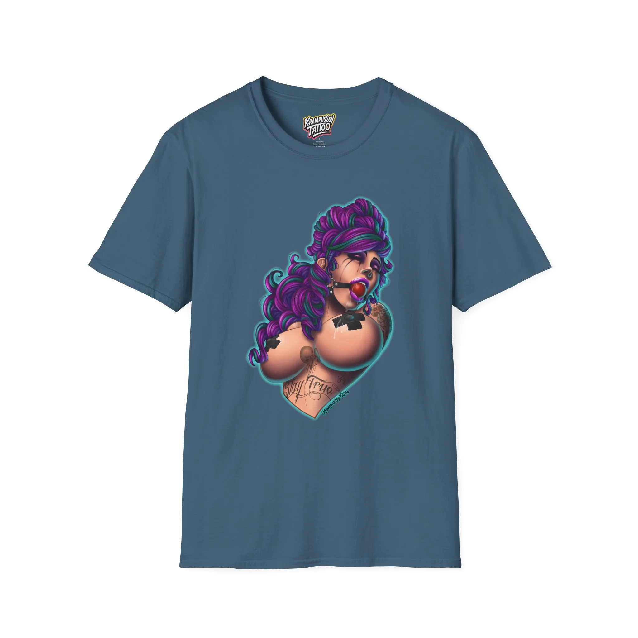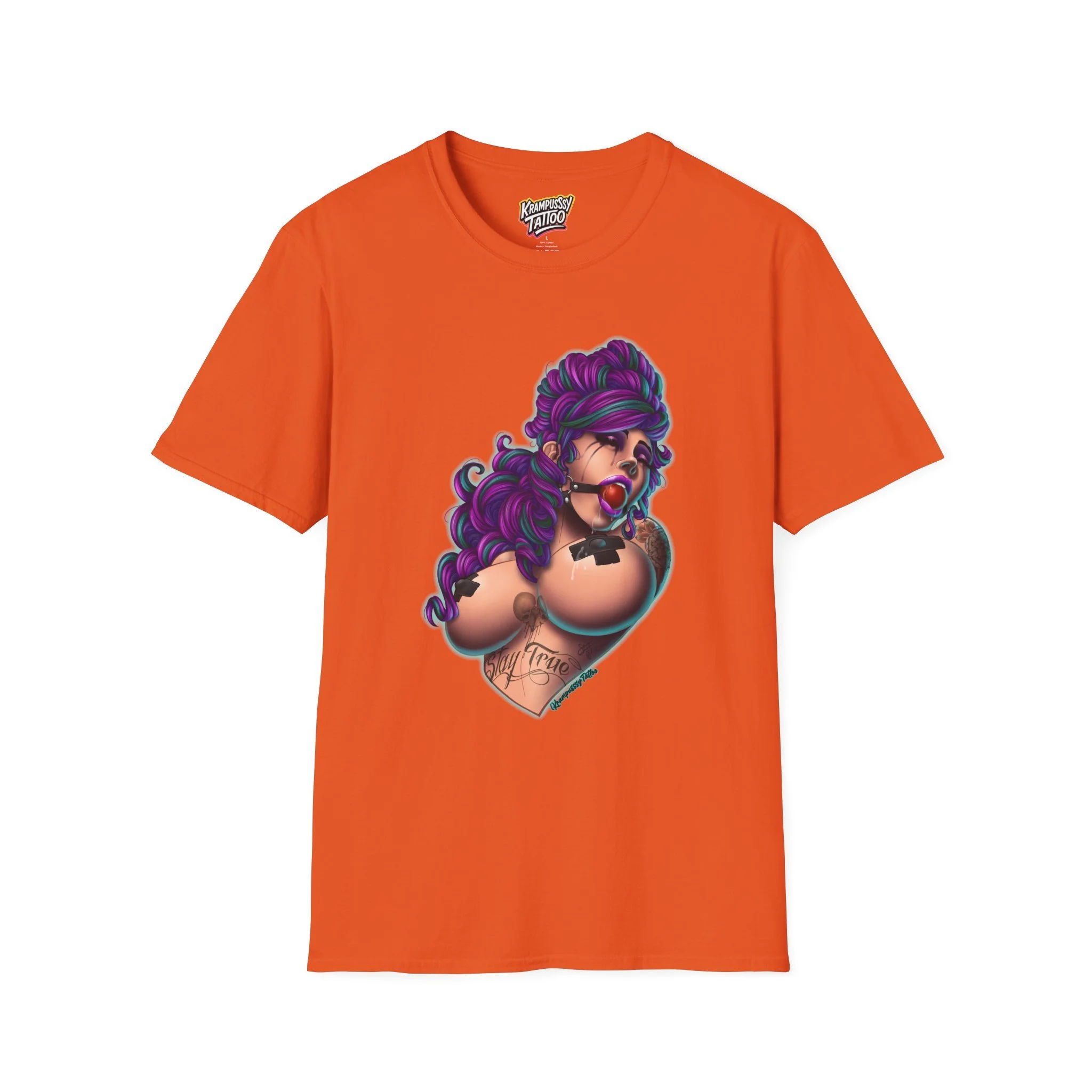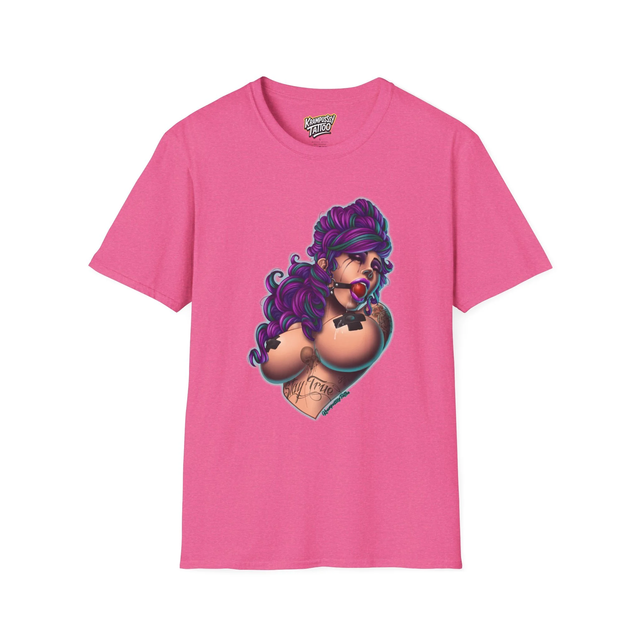 This T-Shirt features a unique design of a woman in a ball gag, adding a touch of edginess to your wardrobe. Perfect for those with a bold and daring sense of style, this T-Shirt can be worn casually or to make a statement at events and parties. Ideal for adults looking for a conversation starter or to express their individuality. Suitable for occasions like Halloween, music concerts, and themed parties.